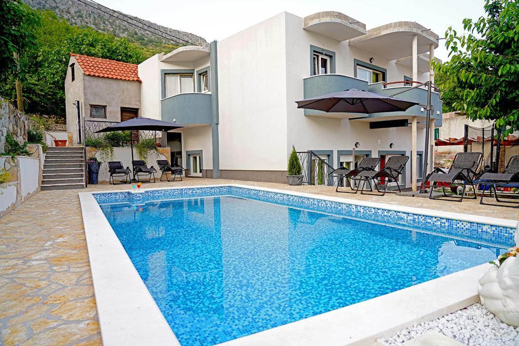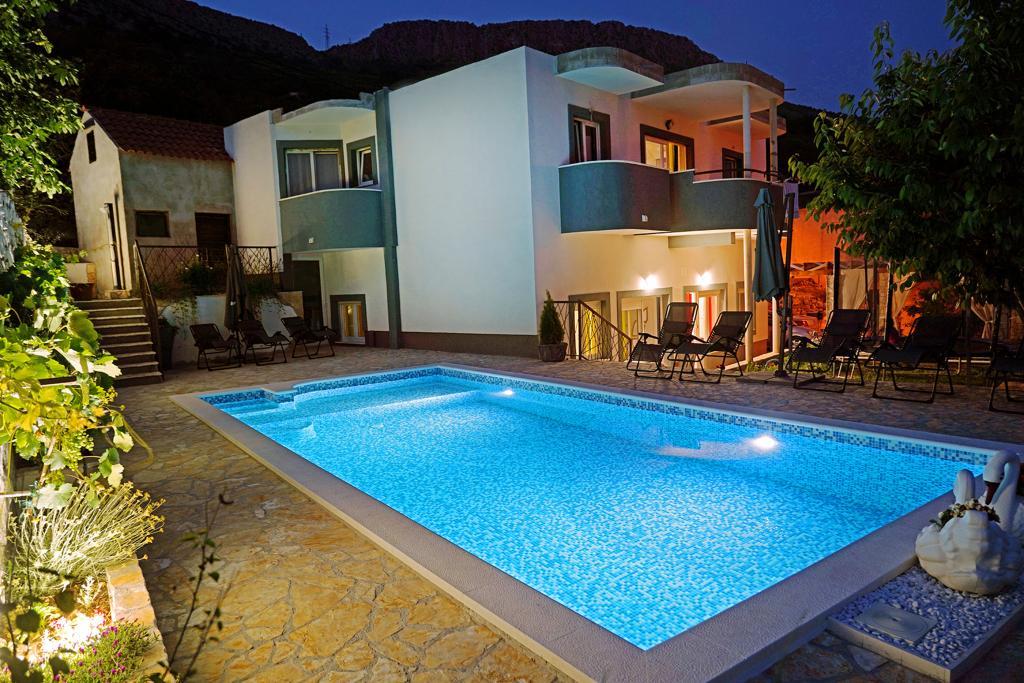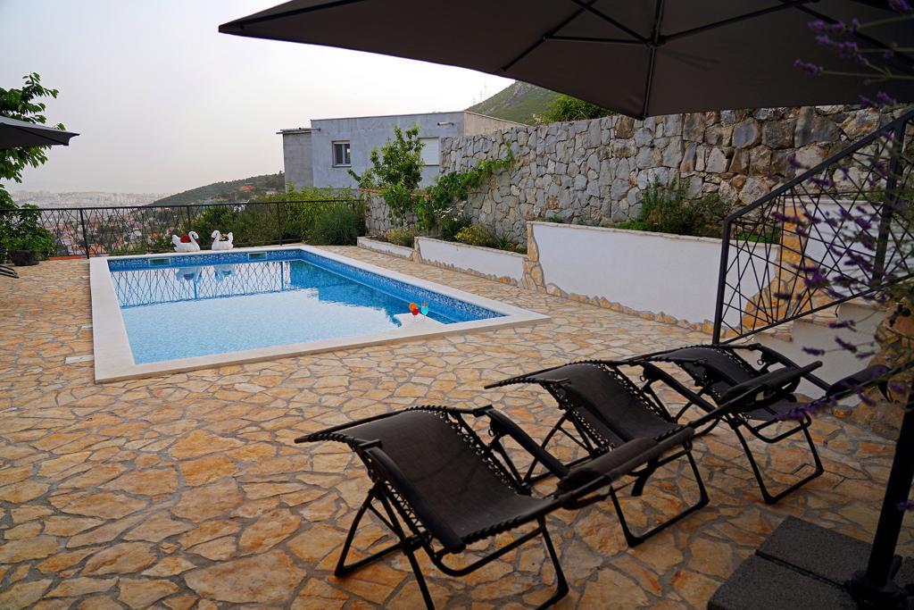 Na obroncima brda Kozjak, u Solinu, samo 8 kilometara od grada Splita, nalazi se ova prekrasna kuća s bazenom. Upoznajte bogatu kulturno-povijesnu baštinu grada Splita, Trogira i antičke Salone. KUĆA SE SASTOJI OD DVIJE MODERNO OPREMLJENE SMJEŠTAJNE JEDINICE U PRIZEMLJU. Idealno za dvije obitelji. Svaka smještajna jedinica sastoji se od jedne spavaće sobe s bračnim krevetom, s vlastitom kupaonicom, te druge sobe opremljene sa dva singl kreveta s mogućnošću spajanja na bračni krevet. Klimatizirani dnevni boravak s kaučem na razvlačenje i TV-om sa satelitskim programima. Prostrani WC sa hidromasažnom kadom. Ispred kuće gosti mogu uživati u privatnom bazenu s čarobnim pogledom na Jadransko more i otoke te grad Split. Također imaju vanjski roštilj i sjenicu sa sjedećom garniturom gdje možete uživati u romantičnoj večeri. Osigurano parkirno mjesto u dvorištu (nije potpuno ograđeno).