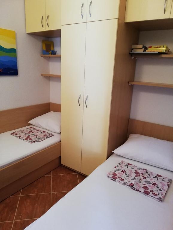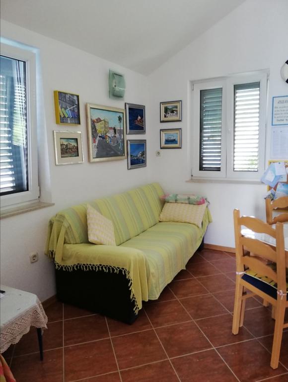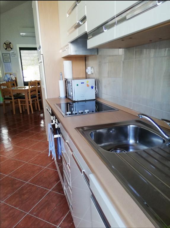 Apartman se nalazi u privatnoj kući. Moderno uređen sa svime potrebnim za boravak. Tik do mora u maloj uvali punoj zelenila. Dvorište puno mediteranskog i ljekovitog bilja. Zadnja je u nizu ribarskih kuća, gdje gosti mogu biti opušteni. Buđenje uz šum mora. Jedini su gosti u kući pa im je mir zagarantiran. Kupanje ispred kuće na betonskom mulu ili 2 minute do pješčanih plaža. U isto vrijeme možete KUHATI i KUPATI se ili sunčati. Terasa i lođa su samo za Vas. Parking do same kuće besplatan. Ulaz u more prilagođen starijima i djeci. Stepenice su od inox-a sa rukohvatom. Roštilj besplatan + ima i električnu peku. Kućne ljubimce ne primamo zbog alergije.. Domačini povremeno borave u prizemlju. Pogled na more i na sva zbivanja na moru. Ponesite rekvizite za more-masku, peraje, dasku, brod, madrac ili....... i uživajte u svom godišnjem. Dobro nam došli! Rado Vas čekamo!