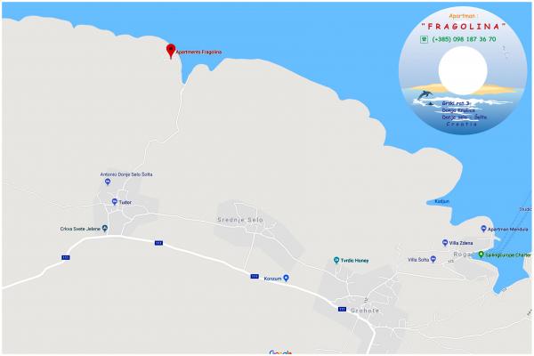Apartmani Fragolina nalaze se u Donjoj Krušici, malom ribarskom naselju smještenom u uvali na sjevernoj strani Šolte. Do Donje Krušice dolazi se uskom cestom iz Donjeg Sela, do kojeg se može doći pješice ili automobilom. U naselju je i mala plitka lučica popunjena ribarskim brodicama mještana. U naselju nema trgovine ni ugostiteljskih objekata. Apartmani Fragolina su na osami od lučice lijevo prema predjelu Grski rat. Potrebno je prijeći malu strmu uzbrdicu. Do apartmana mozete doci automobilom. Ceste su uske kao i na svakom manjem otoku. Mjesto je idealno za turiste koji su u potrazi za očuvanom divljinom, pa možete računati na mir i predivnu prirodu. Ispod kuće u kojoj su apartmani nalazi se mul sa ležaljkama za sunčanje. Možete se kupati i u lijepoj uvali Mala Krušica koja je udaljena 5 minuta hoda od apartmana. Postoji mogucnost najma cijele kuće, kao i motornog čamca. Apartmani su klimatizirani, parking je besplatan kao i WI FI.