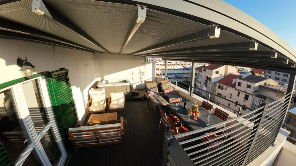 Apartman se nalazi u mirnom djelu ,blizina kolodvora,plaze Opremljen ,velika terasa sa jacuzijem i pogledom na luku Split