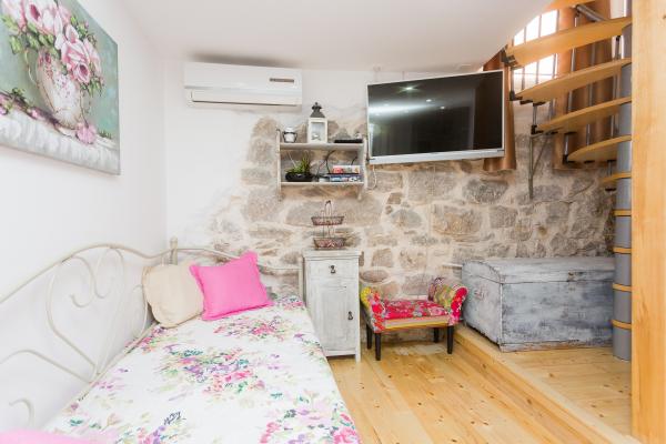 Dama je mala dalmatinska kuća koja se nalazi u centru grada, na mirnoj lokaciji. U kući se mogu smjestiti 3 osobe. Sastoji se od prizemlja sa kuhinjom, dnevnim boravkom i kupatilom, zatim nisko potkrovlje sa spavaćom sobom i vrt sa sjedećom garniturom. Domaćin ne živi tu, ali vam uvijek stoji na raspolaganju. Dođite i provedite nezaboravan odmor. Nemamo privatno parkirno mjesto! Javni parking u neposrednoj blizini kuće.