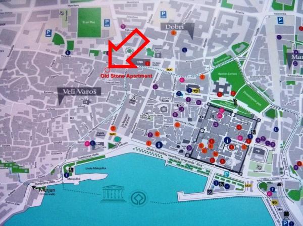 Old Stone Apartment nalazi se u samom srcu Splita u dijelu grada zvanom Vela Varoš. Varoš je puna starih kamenih kućica ukrašenih cvijećem i uskim malim kaletama (ulicama) karakterističnim za Dalmaciju. Apartman se nalazi 650 m od Diklecijanove palače, 400 m od Rive. Laganom 15- minutnom šetnjom stižete do brda Marjan, na čijim se obalama možete okupati, te odmoriti u hladu borovine. Pješčana plaža Bačvice, nalazi se cca 1300 m od objekta (15 min šetnje). Vrlo blizu su i peškarija (tržnica sa svježom ribom) i pazar (tržnica sa svježim voćem i povrćem). Apartman je smješten na tri etaže. U prizemlju je dvorište sa roštilj, koje je namjenjeno isključivo gostima koji trenutno koriste apartman. Na prvom katu nalaze se terasa, dvije sobe i kupaonica. Na drugom katu je dnevni boravak sa kuhinjom i blagovaonicom. U kuhinji se nalaze hladnjak, pećnica, mikrovalna pećnica, kuhalo za vodu, krpe, ubrusi...U kupaonici se nalaze sapun, šampon, strujni adapter, fen, higijenske vrećice...
