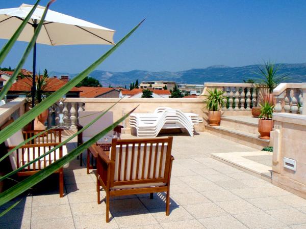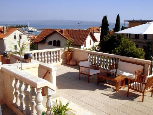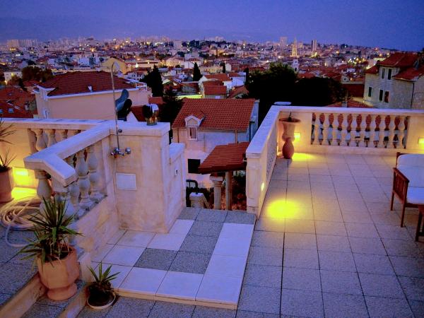 Veliki duplex penthouse apartman na drugom katu Ville, 10 minuta hoda od svih interesantnih sadržaja Splita. Sastoji se od 3 spavače sobe, 3 kupatila ( en-suite ), dnevnim boravkom, blagavaona, kompletno opremljena kuhinja, prostorija sa mašinom za pranje robe i mašinom za sušenje, dva balkona, velika krovna terasa sa pogledom 360 stupnjeva na grad, more i okolne planine. Tu je i besplatan privatni parking ( na upit ) BUKIRAJ 7 NOČI I PLATI ZA 6
