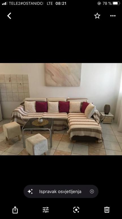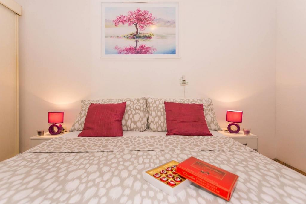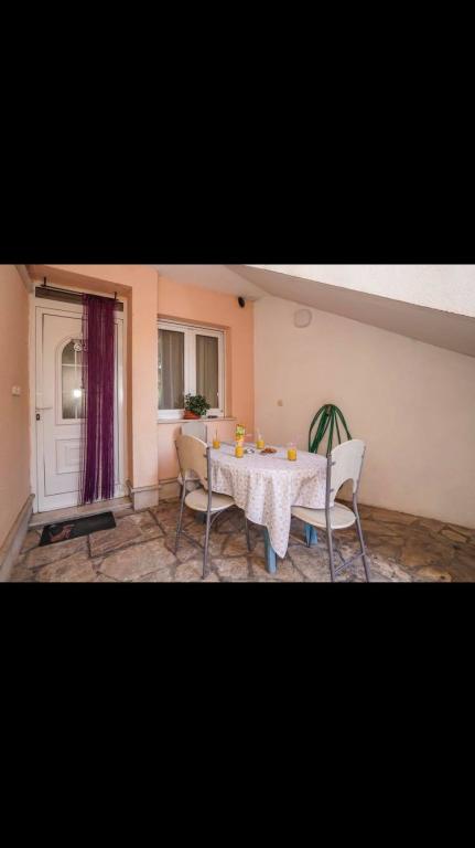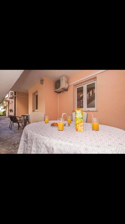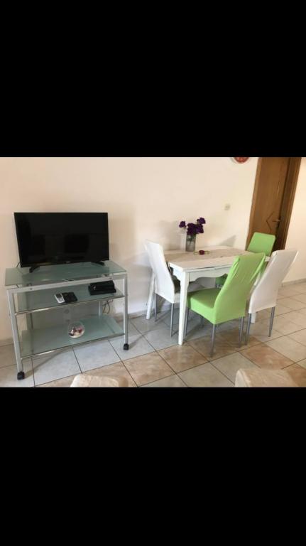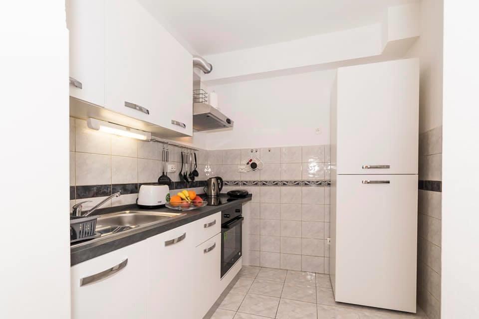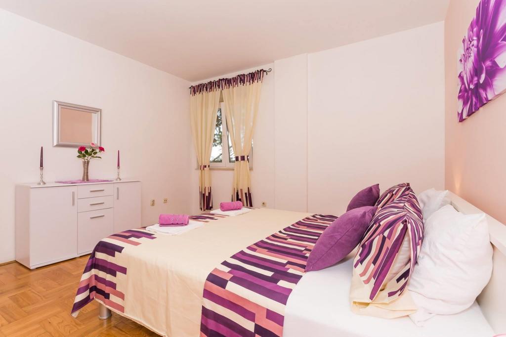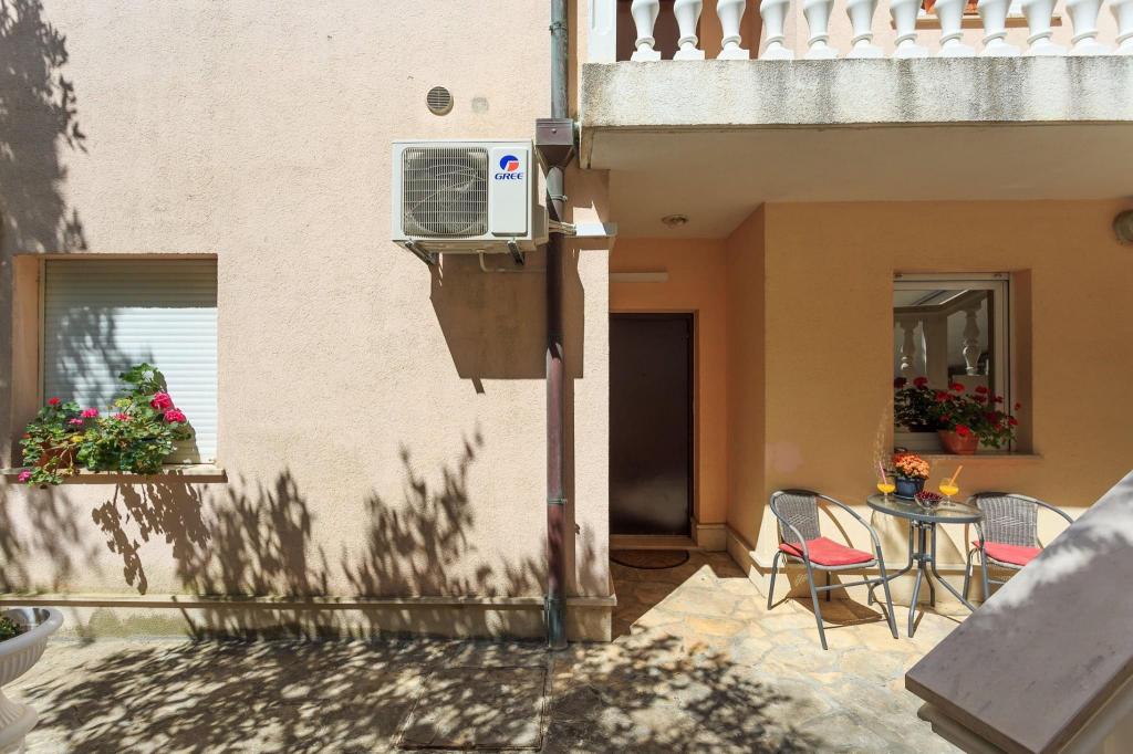 Apartman se nalazi u prvom redu do mora u novogradnji. Apartman sadrzava dvije velike sobe sa bracnim krevetima, dva wca, kuhinju, blagovaonu, dnevni boravak i terasu. Apartman je udaljen 200m od prve sljuncane plaze te 300m od plaze sa pijeskom. Udaljenost do prvog kafica i restorana je manje od 100m, caffe bar Renato, Tennis bar i Mythos, restoran Velo Misto i Barkarola. Do centra grada udaljenost je nekih 20ak minuta pjeske. Na udaljenosti od 100m nalaze se tenis tereni za iznajmljivanje.