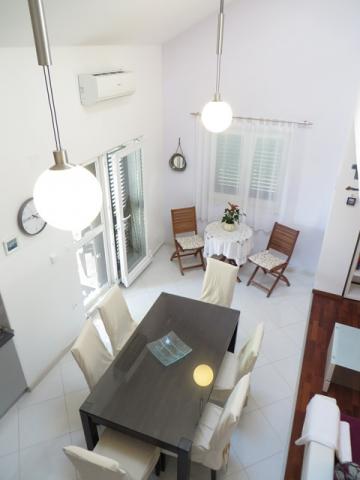 Suvremeni i moderno uređen apartman na katu obiteljske kuće u malom i mirnom mjestu Srima. Drugi red do mora, udaljen 140 m od prekrasne šljunčane plaže ( Plava zastava). Apartman ima 75 m2 ( WC i kupatilo, dvije sobe, kuhinja, blagovaona i dnevni dio) galerija s kupatilom i WC-om i polu natkrivena terasa 14 m2. Predviđeni broj osoba je 6 (sobe 4, galerija 2) Kompletno je uređen kvalitetnim namještajem i opremom ( SAT TV, Internet, LCD TV, radio, perilica posuđa i perilica rublja, fenovi za sušenje kose, mikrovalna, grijač vode, 2 klima uređaja) zadovoljiti će goste koji žele više. Zbog svoje veličine idealan za ljetovanje dviju obitelji. Srima se nalazi u neposrednoj blizini grada Vodica, poznatog ljetovališta sa svim potrebnim sadržajima za odmor i rekreaciju te dva nacionalna parka: NP Kornati i NP Krka.
