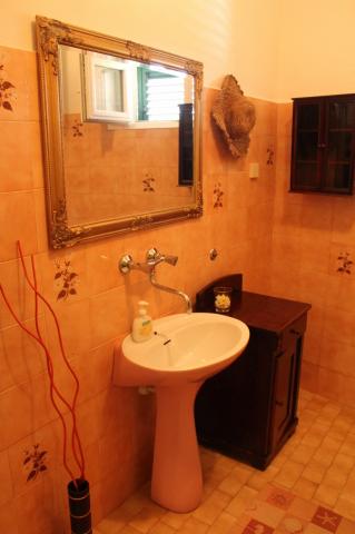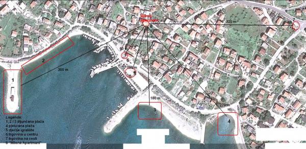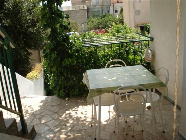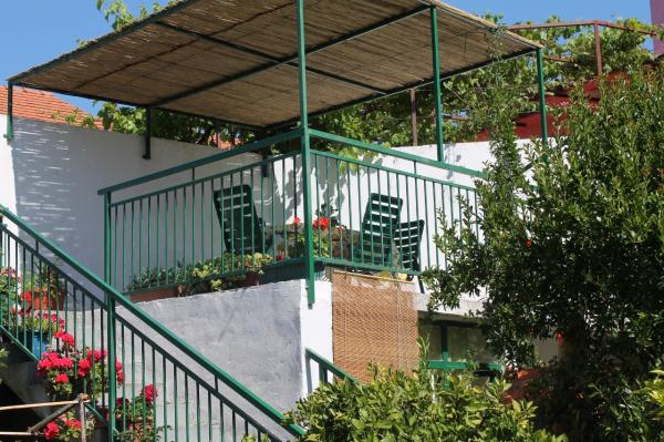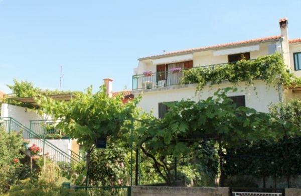 U obiteljskoj kući, na prvom katu, iznajmljuju se dva apartmana. Svaki apartman ima zaseban ulaz i svoju terasu. Kuća se nalazi u samom centru Srime, 60m od dućana i 80m od mora. Plaža s plavom zastavom udaljena je 150m. Restoran je udaljen 250m. Apartman 1, 2 +2. Sastoji se od: spavaće sobe, dnevne sobe u kojoj je trosjed na razvlačenje, kupaonice s kadom i perilicom rublja, kuhinje s perilicom posuđa, terase. Ima klimu. Apartman 2, 2 +1. Sastoji se od: prostrane spavaće sobe, kuhinje - dnevne sobe u jednoj prostoriji, WC s tuš kadom i velike terase. Mogućnost dva pomoćna ležaja, prvi ležaj je kauč u dnevnoj sobi, a drugi pomoćni ležaj se može staviti u spavaću sobu. Ima klimu.