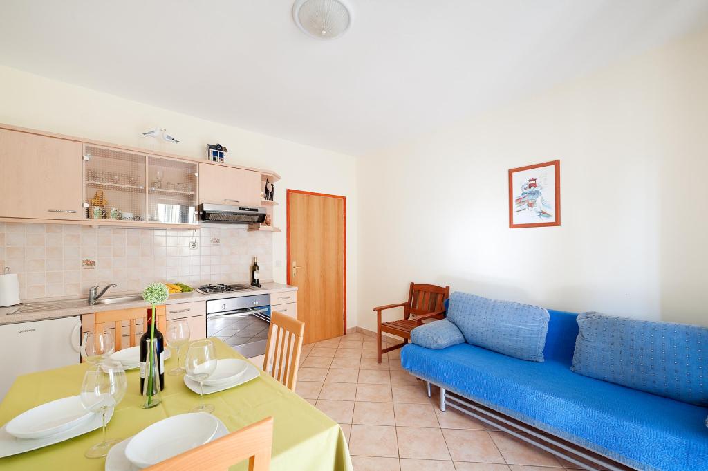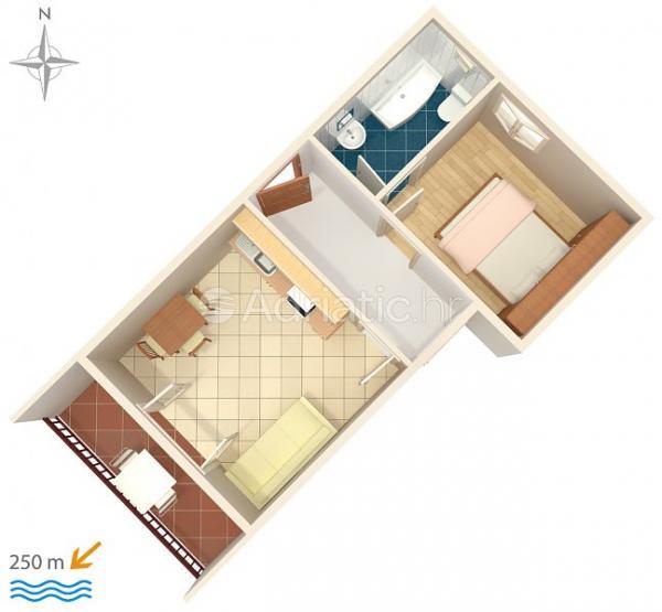 Jedini plus smještaja je udaljenost plaže; cca 200metara Što se apartmana tiče opremljenost je ispod svake razine, namještaj je dotrajao, pomoćni ležaj je doslovno raspadnut i temelji se na truloj spužvi s tri letvice.... Čistoća je prosječna-dočekala nas je paučina, mrvice u ladicama, mrljav rasparani beštek... Domaćini nas nisu dočekali zbog zauzetosti ali nisu niti u jednom trenutku bar nazvali i pitali je li sve uredu Očekivali smo puno puno vise s obzirom na komunikaciju prije dolaska, a na kraju smo ostali razočarani.