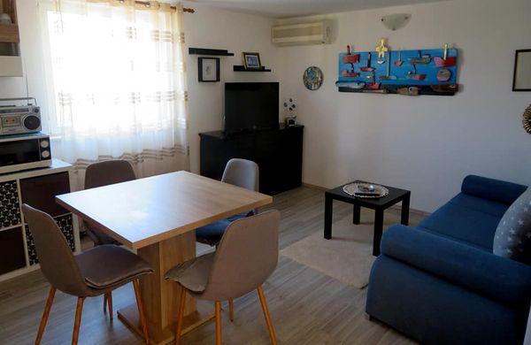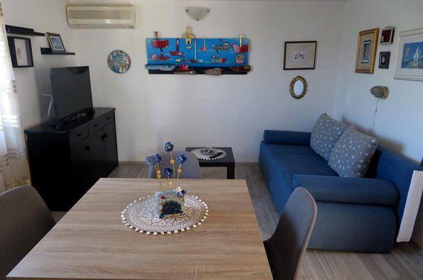 Apartman u mirnom dijelu Stare Novalje, 10 min. hoda do plaže! Apartman ima dnevni boravak, kuhinju, spavaću sobu, kupaonicu i terasu sa pogledom na more. Na raspolaganju je i vrt s parkingom ispred objekta, te roštilj i vanjski tuš.