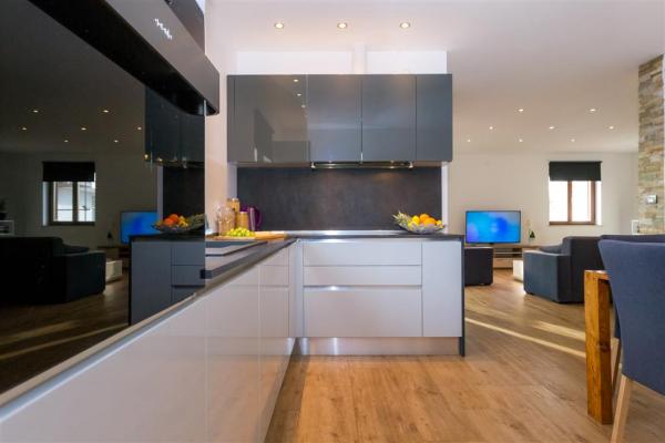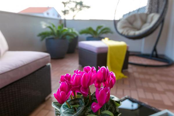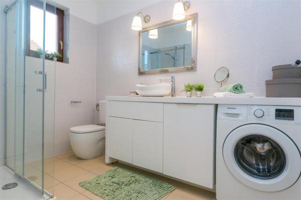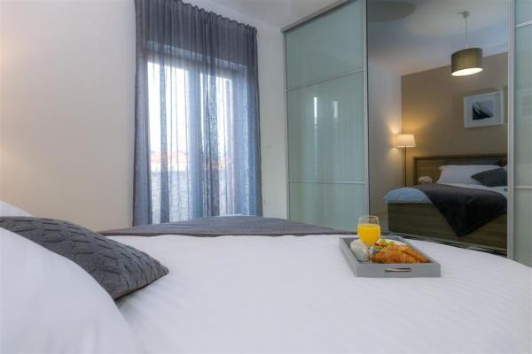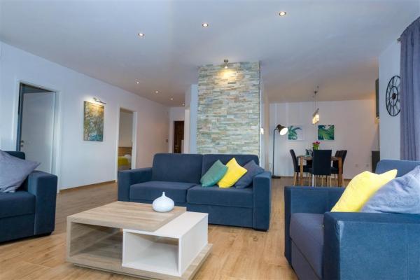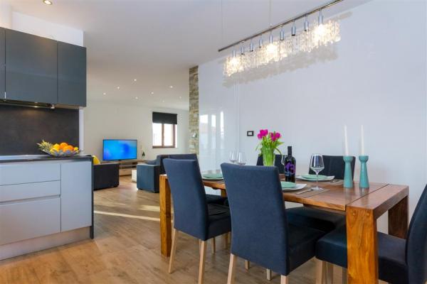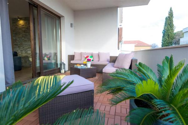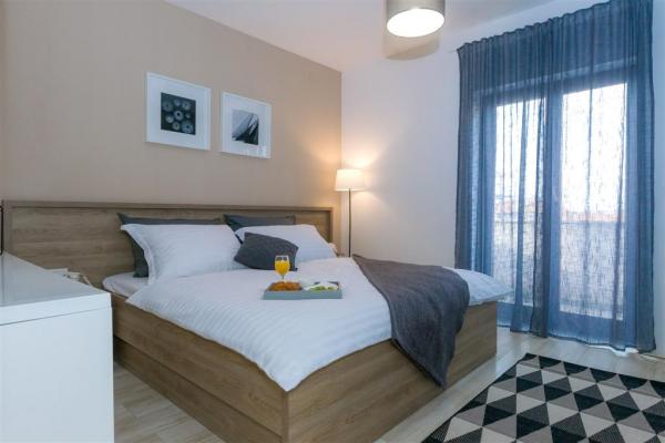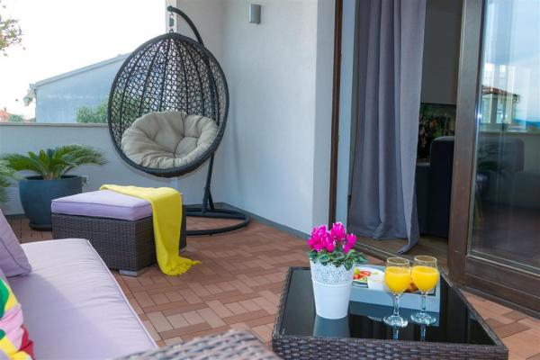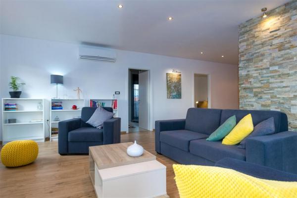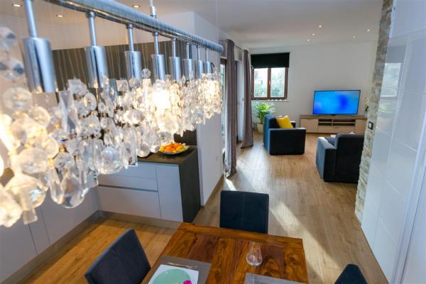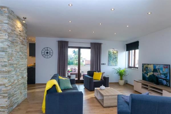 Moderno uređen apartman na katu obiteljske kuće smješten je u samom centru mjesta. Objekt se nalazi u mirnoj ulici, svega 5 minuta hoda do glavnog trga te je idealan za savršen obiteljski odmor. Na raspolaganju je čitav kat objekta koje se sastoji od prostranog dnevnog boravka, dvije spavaće sobe, kupatila, kompletno opremljene kuhinje, blagovaonice i natkrivene terase. Svojim gostima nudimo besplatni WiFi internet, sustav klimatizacije s grijanjem i hlađenjem, satelitsku televiziju, sušilo za kosu, posteljinu, ručnike. Dolazak s kućnim ljubimcem je moguć uz prethodni dogovor. Privatan parking u dvorištu kuće.