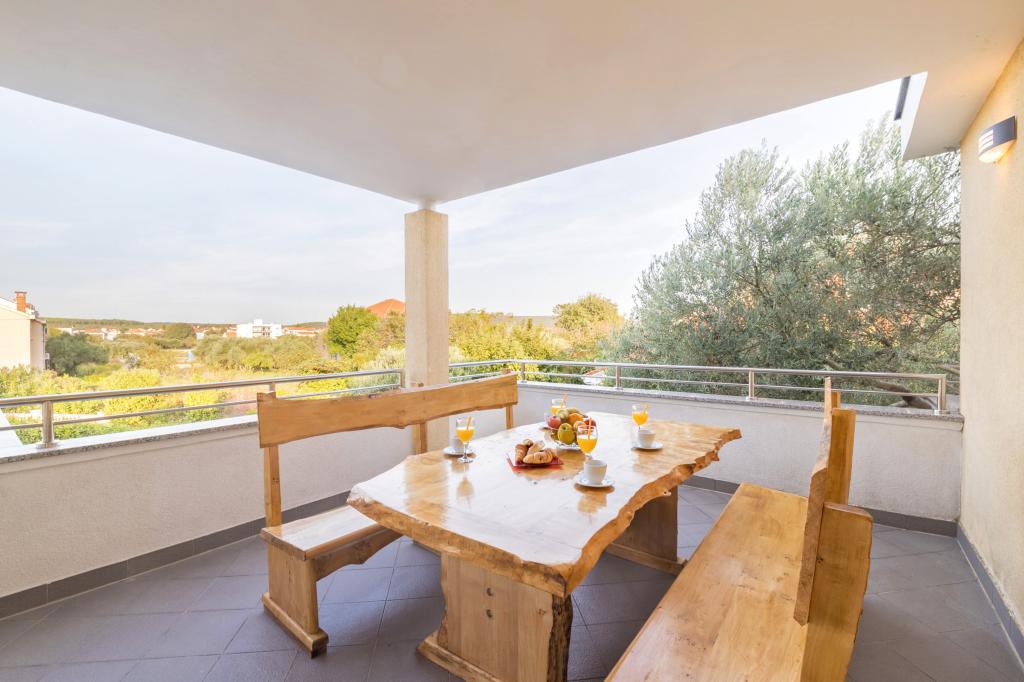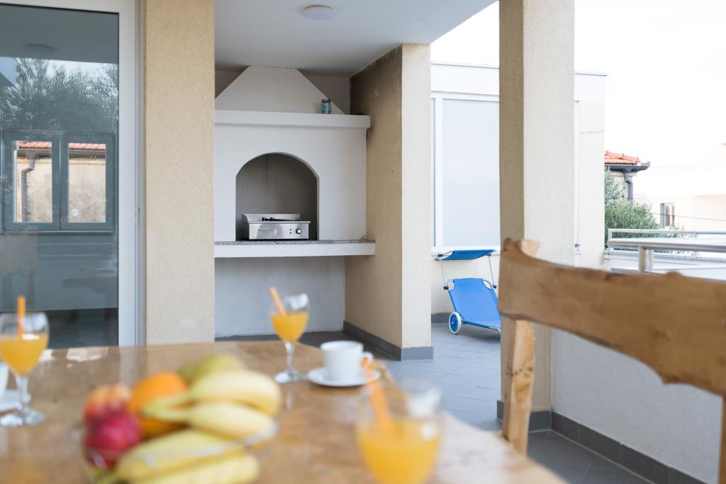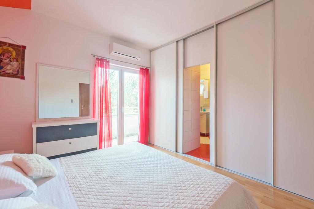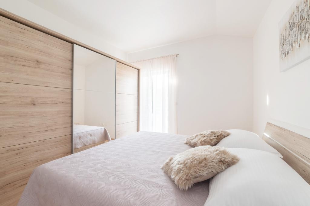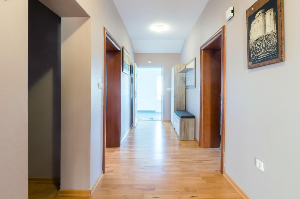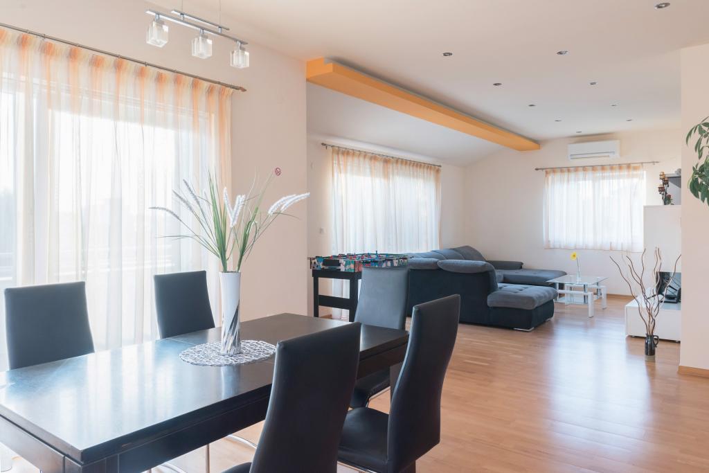 Apartman se nalazi 150m od glavne plaže,te 300 m od centra.Prostrani(120m2) app,sa 3 spavaće sobe,velikom kuhinjom i dnrvnim boravkom te 2 kupaonice i velikom terasom nalazi se na prvom katu dvoetažne kuće u mirnom kvartu nedaleko centra mjesta.