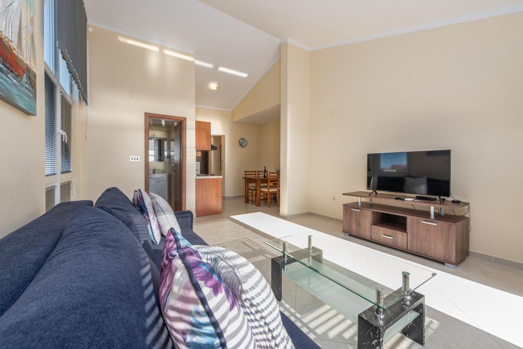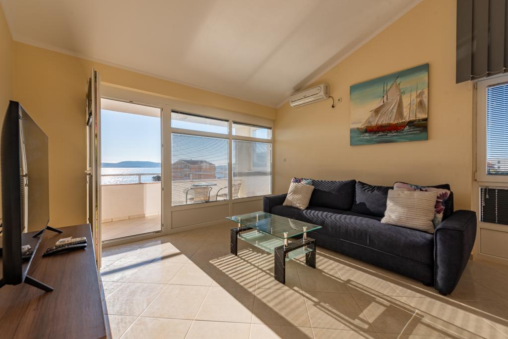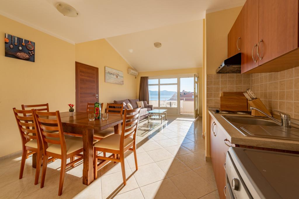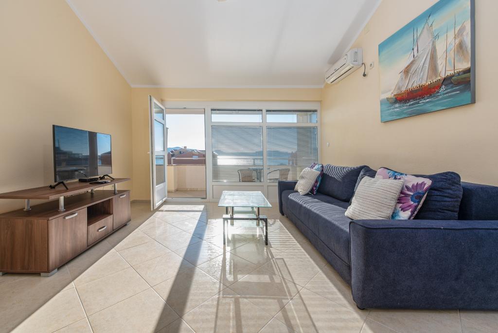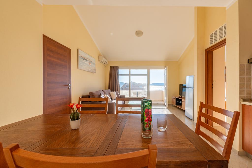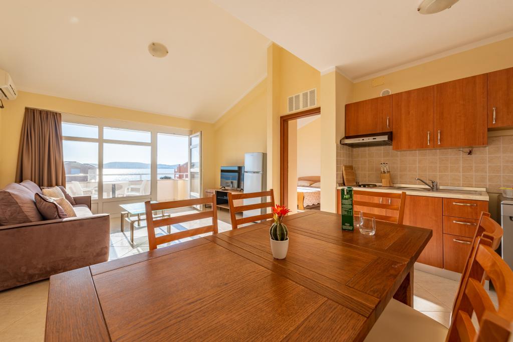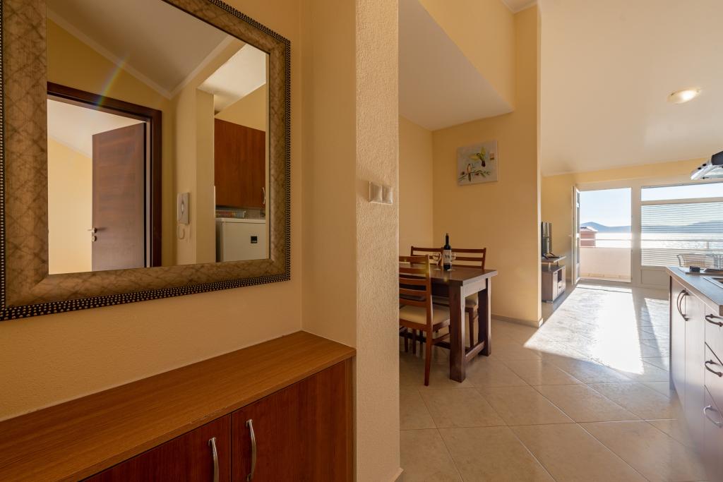 Apartman je dobro opremljen i ima dva balkona s prekrasnim pogledom na more. Klima uređaj omogućuje podešavanje sobne temperature ovisno o vremenu. Lokacija je idealna za obitelji s djecom, gotovo direktno na plaži, ali ipak mirno. U blizini je dječja plaža s pješčanim dnom. Osoblje je ljubazno i uslužno.