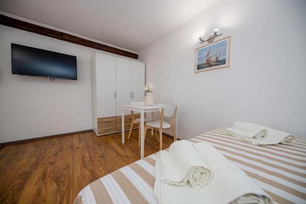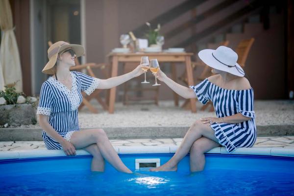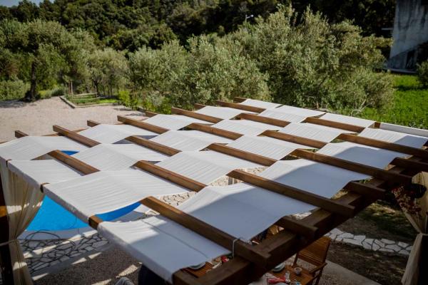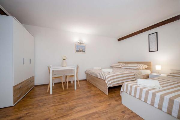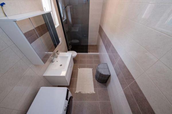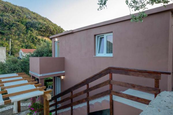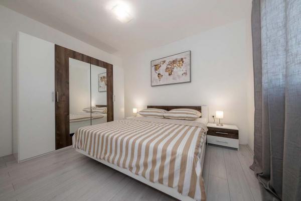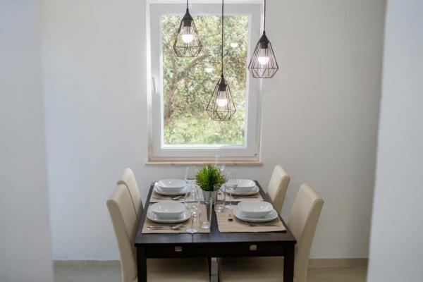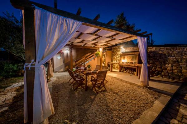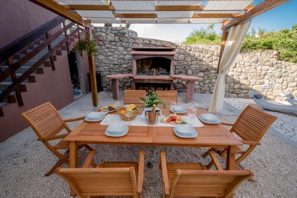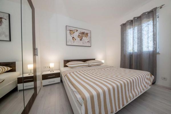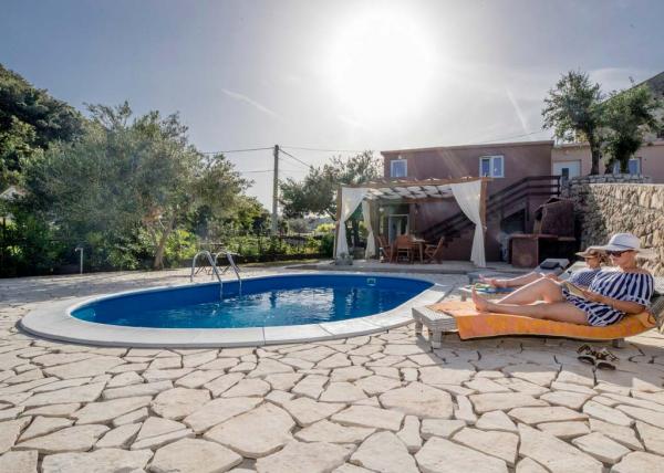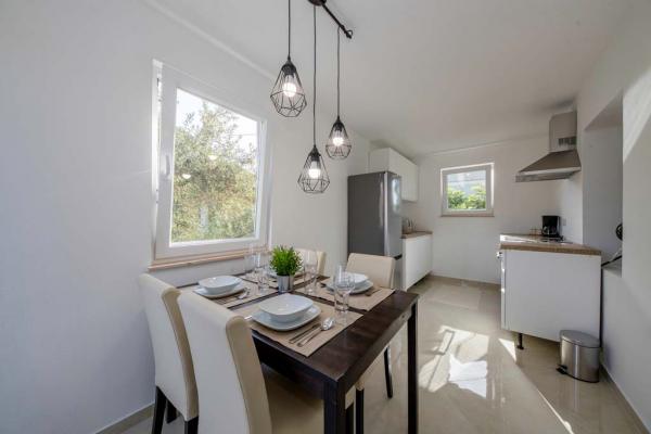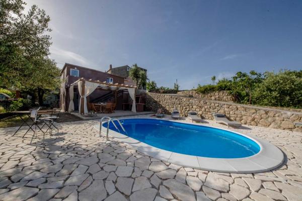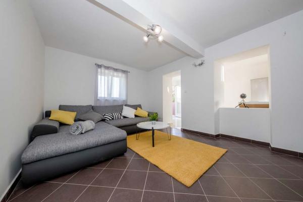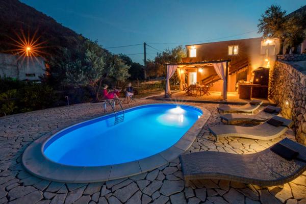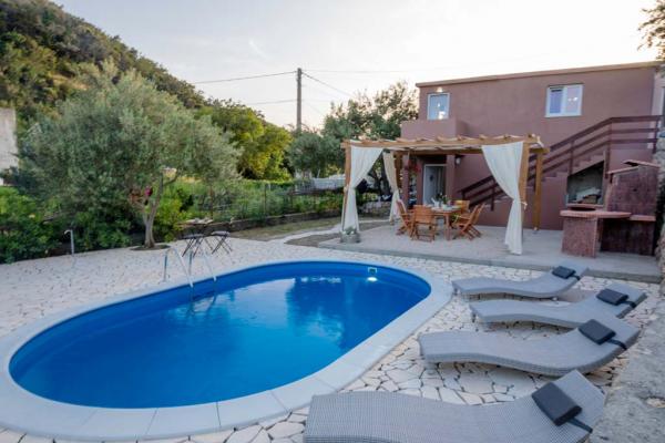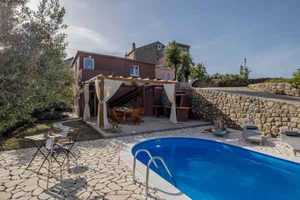 Kuća za odmor za 7 ljudi. Na donjem katu se nalazi kuhinja, kupaonica i soba za troje ljudi. Na katu je veliki jednosoban stan od cca 70m2 koji se sastoji od dnevnog boravka, kuhinje, kupanice i sobe. U dvorištu je veliki roštilj, sjenica s baldahinima i bazen. Parking i internet besplatni. Pet friendly.