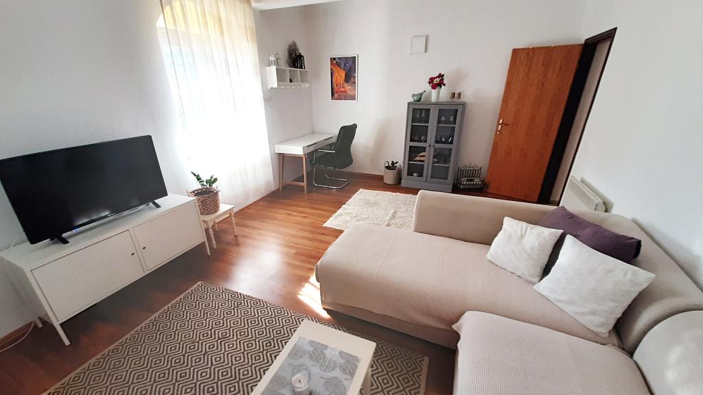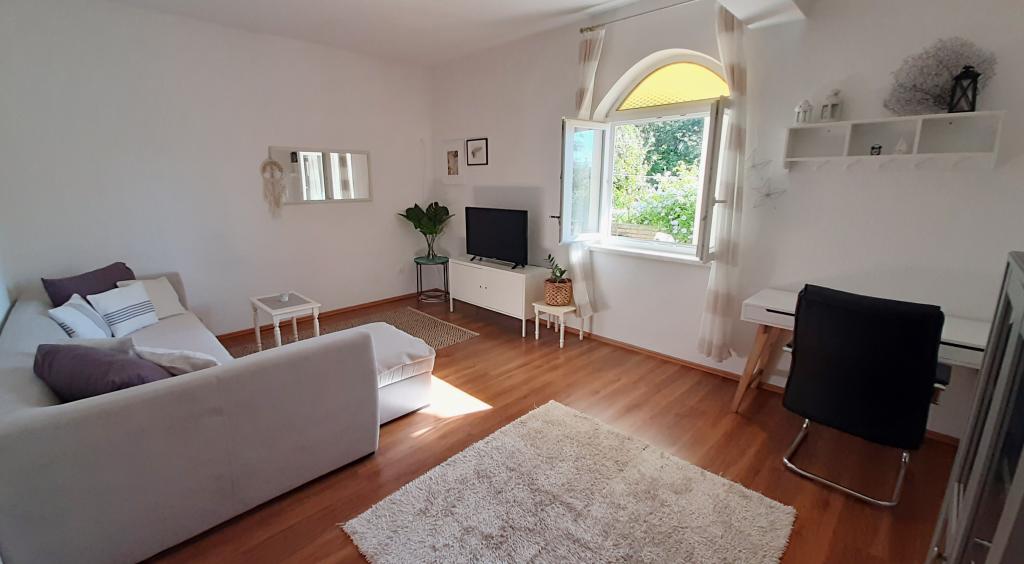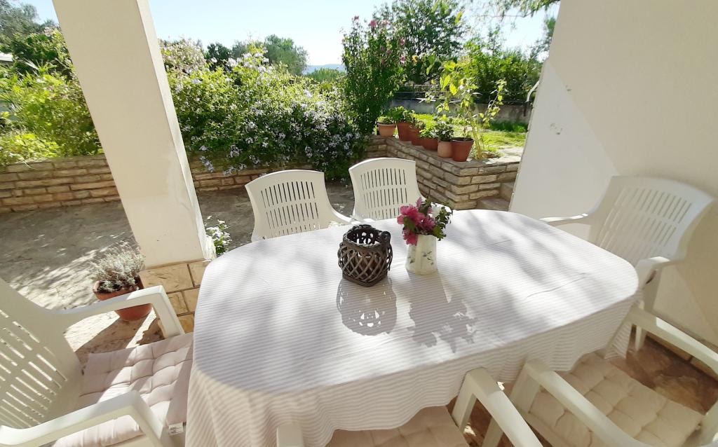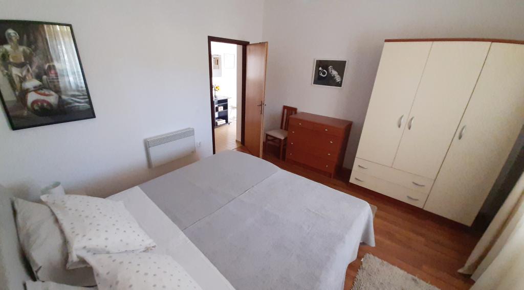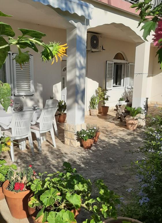 Apartaman je smješten u prizemlju obiteljske kuće, koja je prvi red do mora, od plaže udaljena svega 100m. Ima 2 spavaće sobe sa bračnim krevetom, kupatilo , prostranu dnevnu sobu i dobro opremljenu kuhinju. Apartman je površine 100m2. Tu je i velika i ugodna terasa sa sjedećom garniturom i vanjskim tušem sa prekrasnim pogledom na vrt i maslinik. Apartman je klimatiziran, ima osigurano parking mjesto za 1-2 auta, wi-fi i ima mogućnost korištenja grilla. Boravišna taksa i klima su u cijeni.