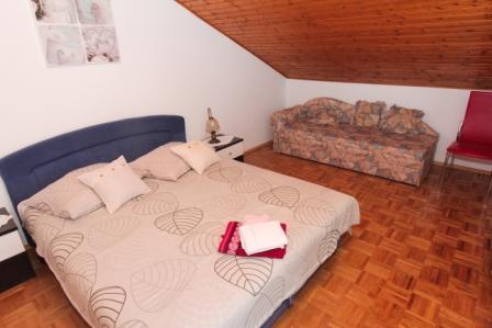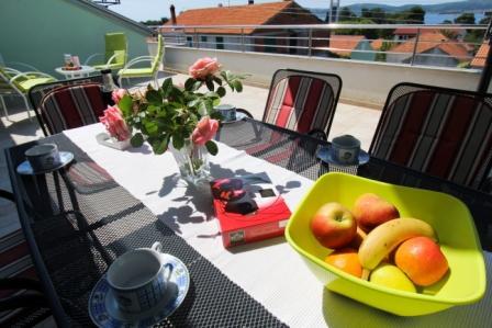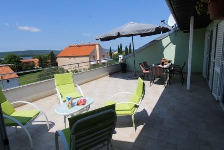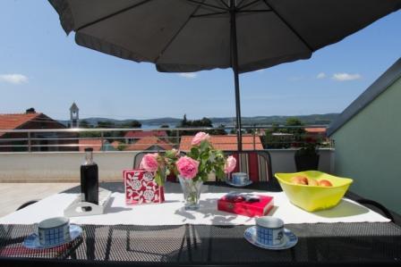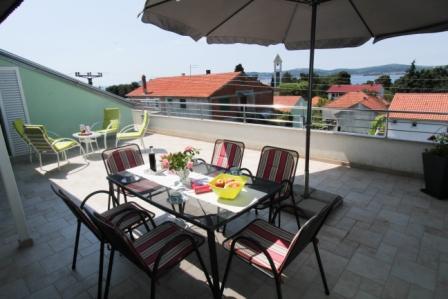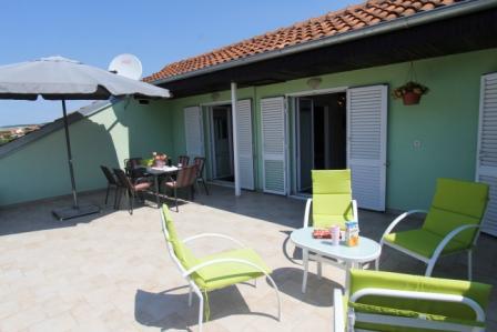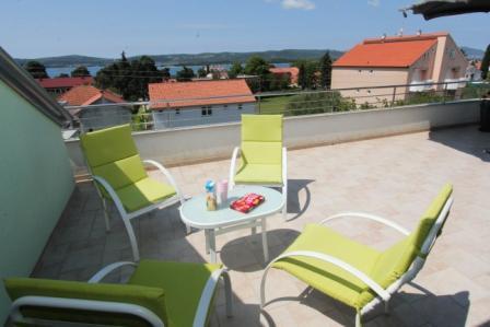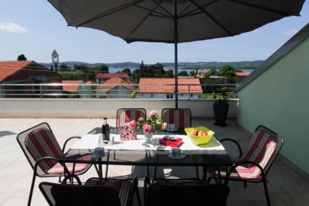 Dvosoban apartman sa velikom terasom i predivnim pogledom u centru mjesta Sveti Filip i Jakov površine 120 m2 ukupno (65 m2 površina stambenog dijela aprtmana, 55m2 površina terase-balkona). Apartman uz dvije sobe ima i dva kupatila, kuhinju sa blagovaonicom i dnevnim boravkom (sve u jednom), predsoblje (ulaz u aprtman). Apartman je u sklopu obiteljske kuće te čini jednu etažu (jedan kat) sa posebnim ulazom u apartman. Parking se nalazi u sklopu objekta kao i roštilj (gril), veliko dvorište te trampolinom za djecu. Plaža, more, riva, restorani, apoteka, pošta, igralište, šetnica.... sve se nalazi nekoliko minuta pješke od apartmana.