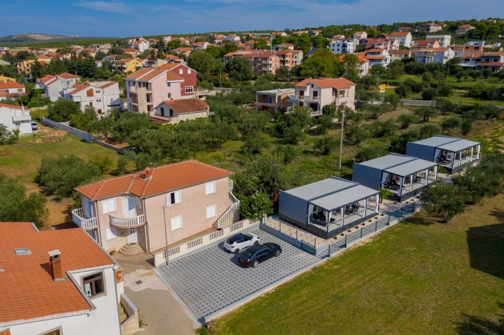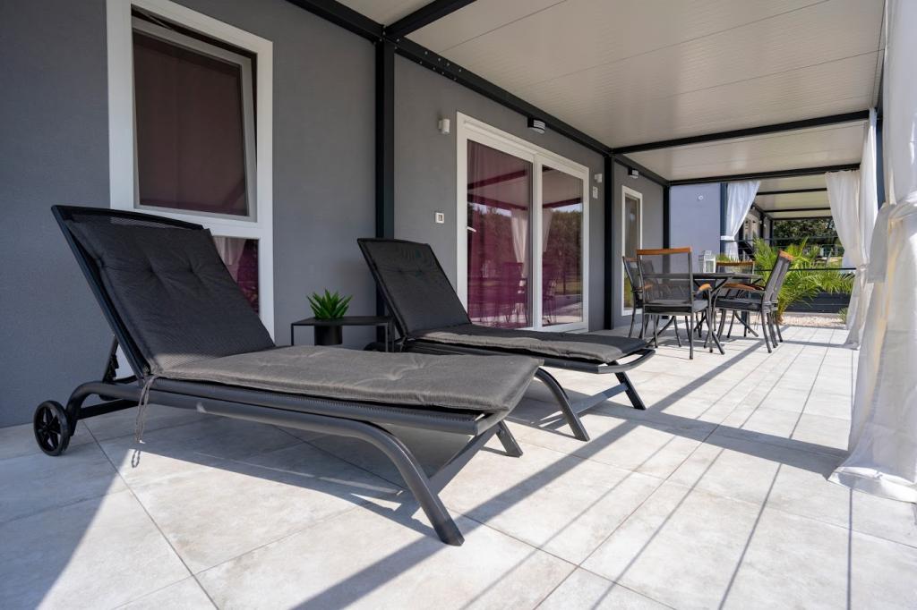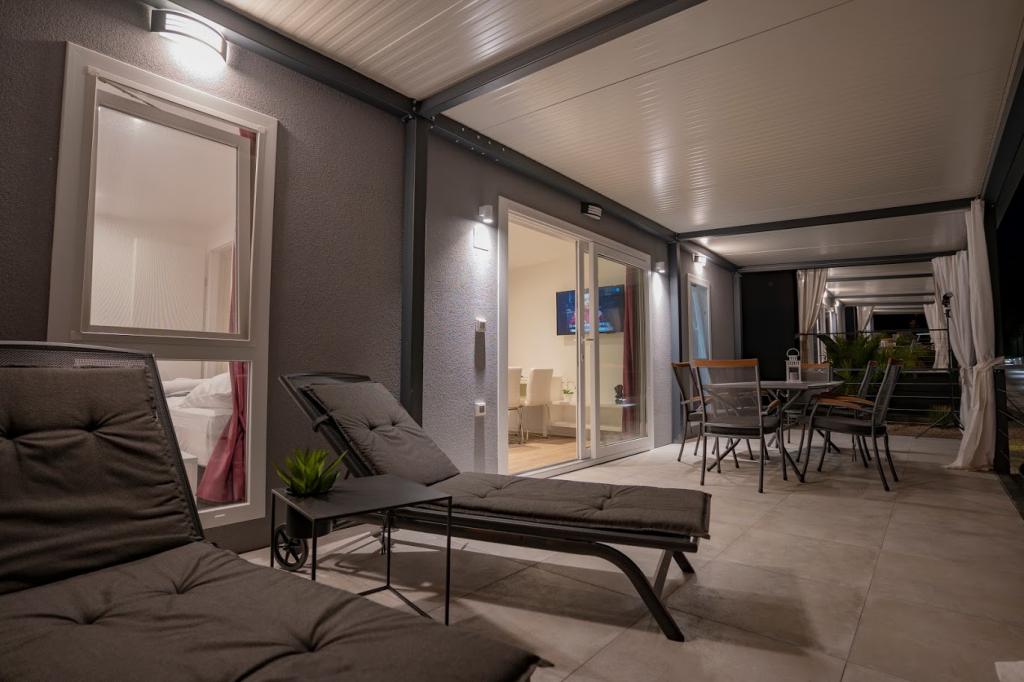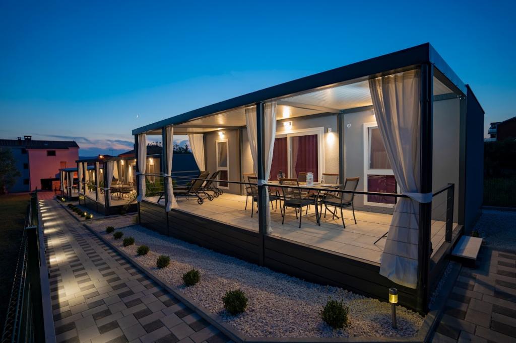 Mobile kućice nalaze se blizu pješčane plaže 200 m, od centra 400m iu tihom okruženju. Luksuzno su namještene TV, Wi-Fi, dvije spavaće sobe ,dvije kupaone. Potpuno opremljenom kuhinjom sa strojem za pranje suđai boravkom. 40 m2 ukupne površine. Klimatizirano.. Vanjska natkrivena terasa od 27 m2 sa ljetnim namještajem. Parking.