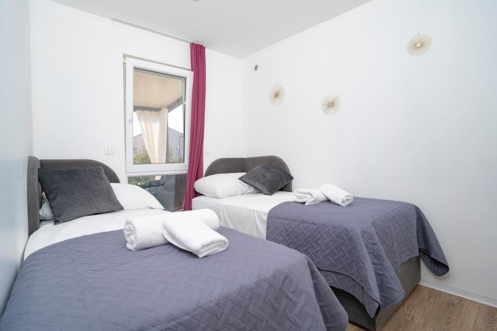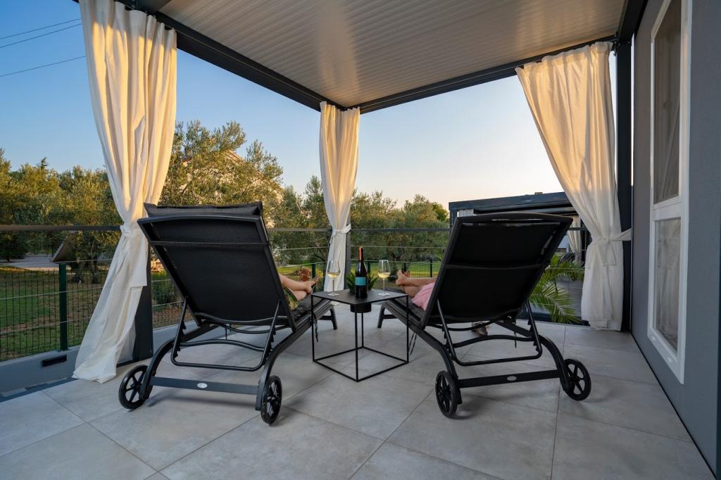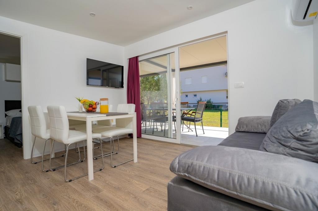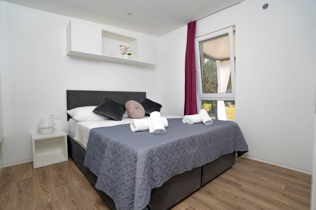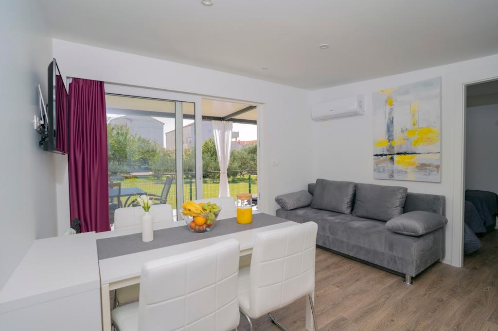 Mobile kućice nalaze se blizu pješčane plaže 200 m, od centra 400m iu tihom okruženju. Luksuzno su namještene TV, Wi-Fi, dvije spavaće sobe ,dvije kupaone. Potpuno opremljenom kuhinjom sa strojem za pranje suđai boravkom. 40 m2 ukupne površine. Klimatizirano.. Vanjska natkrivena terasa od 27 m2 sa ljetnim namještajem. Parking.