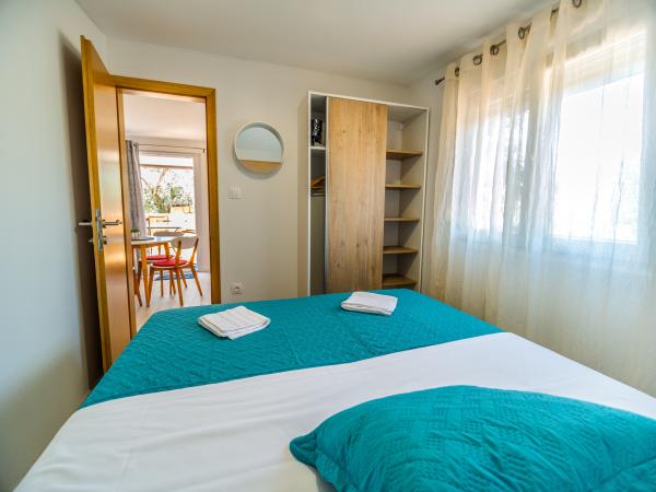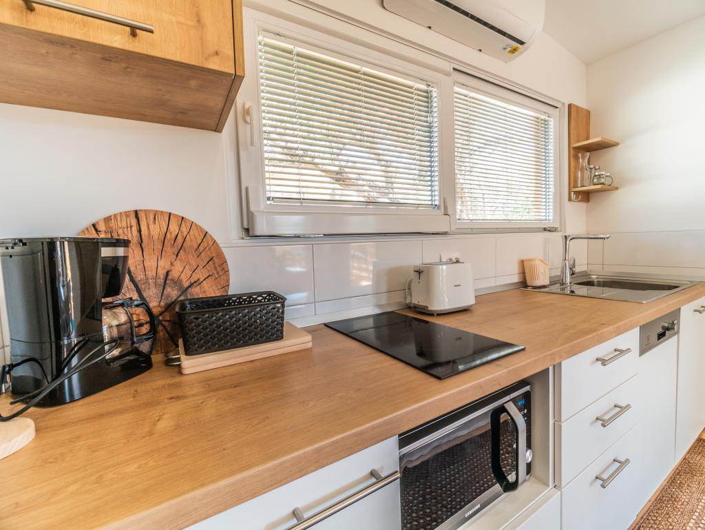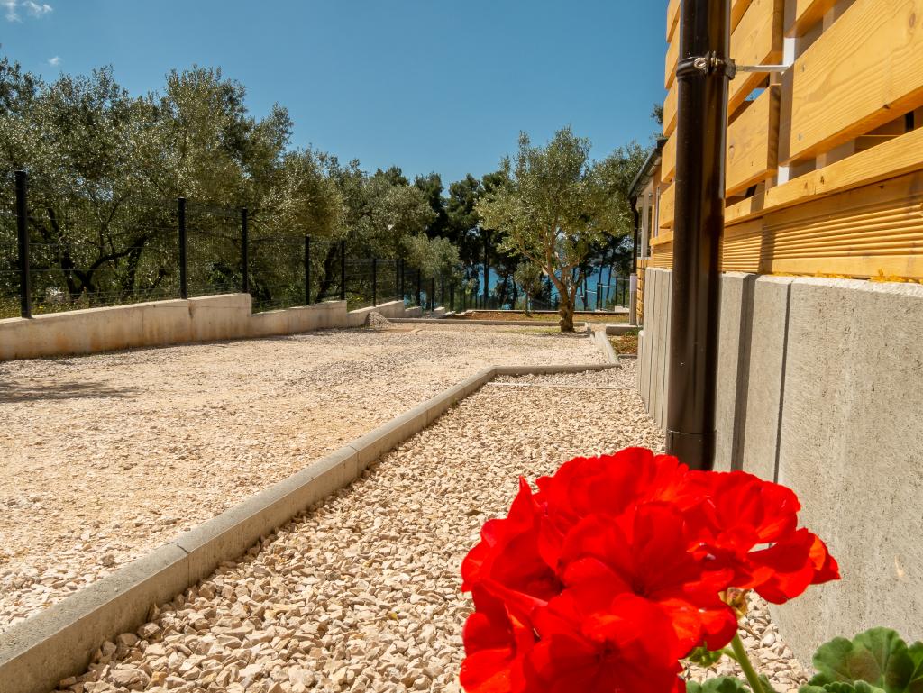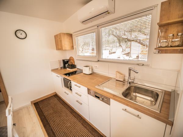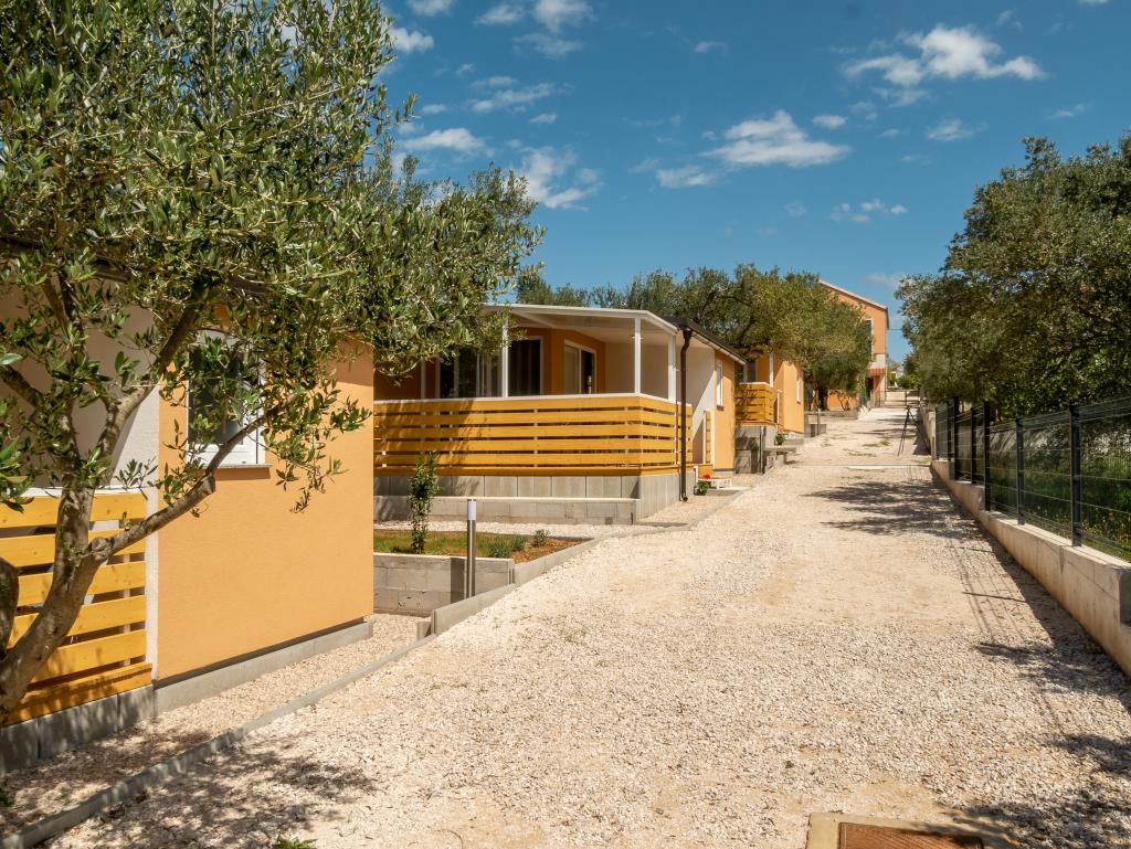 3 montažne kućice u lijepom i mirnom predjelu Sv. Filip i Jakova, smještene prvi red do mora, pješčane plaže udaljene su stotinjak metara, a isto tako na tom području nalaze se i šljunčane plaže. Objekt je namjenjen za 4 osobe, veličine od 40 m2 sa terasom, visoko opremljen, klimatiziran, 2 spavaće sobe sa krevetom 160x200, dnevnim boravkom, kuhinjom, kupatilom, tv, satelitska, Wi-fi, te zaštitnom mrežicom na prozorima (komarnik). Svaka kućica ima svoj vanjski tuš, grill te parkirno mjesto. Dućan je odmah preko puta ceste i do centra mjesta ima 10 minuta hoda, kao i do potrebitih objekata kao što su pošta, sportsko igralište te liječnik. Restorani i konobe su udaljeni 100 metara. U sklopu posjeda se nalazi dodatan WC sa tušem. Uz nadoplatu se može koristiti perilica rublja i sušilica. Na samom dolasku ostavlja se polog od 100 EUR-a, za slučaj eventualne štete, a koji se vraća pri odlasku.