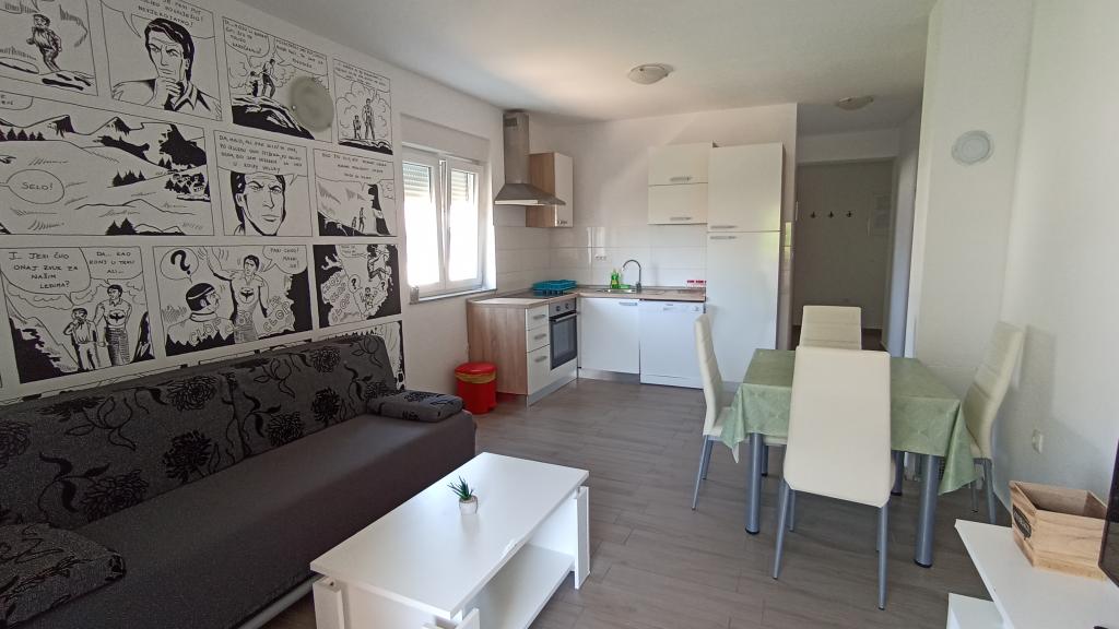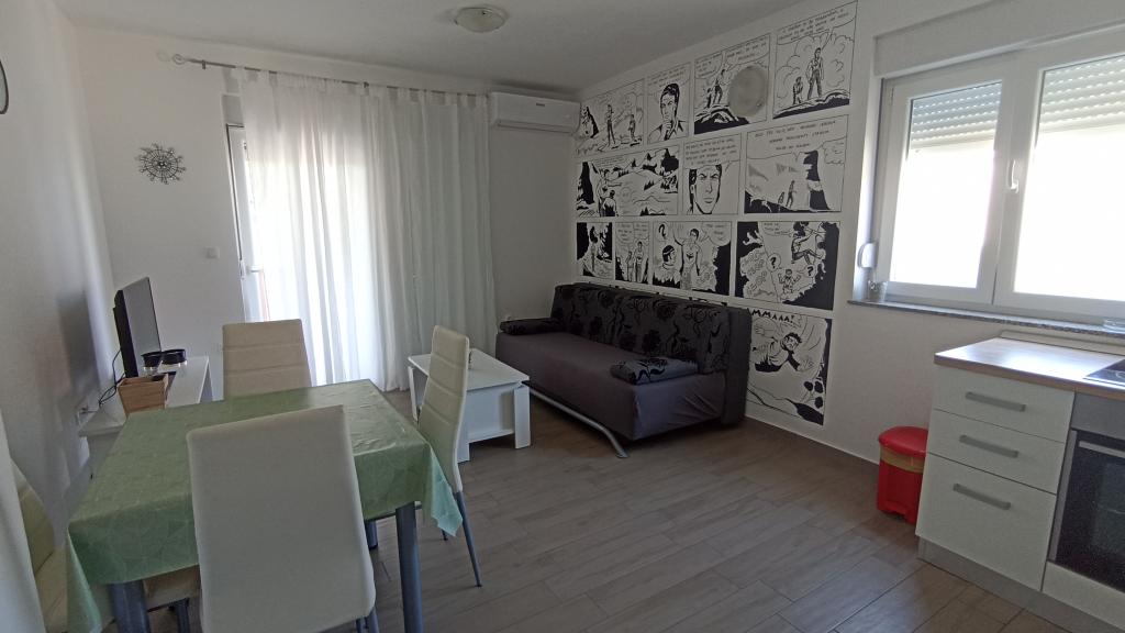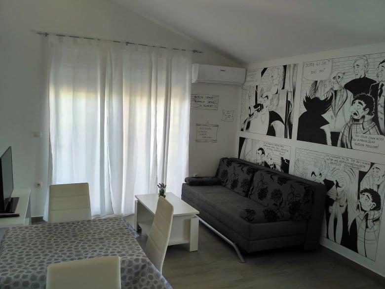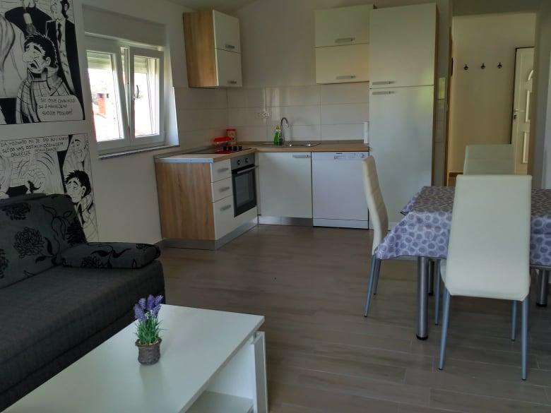 Apartman je super, sve je novo. Za promjenu, nema bakinih kauča, hrastovine i ormara iz '45. veliki natkriveni balkon i sušilo za veš, perilice posuđa i rublja - sve jako korisno. Uredno i čisto. Domaćini preljubazni, a nenametljivi. Zid krasi i prekul strip koji je crtala sama vlasnica tako da to daje posebnu čar. Mi smo bili s dvoje male djece, za svaku preporuku. Plaža je blizu, išli smo svuda pješice, auto nismo ni palili. Thumbs up!