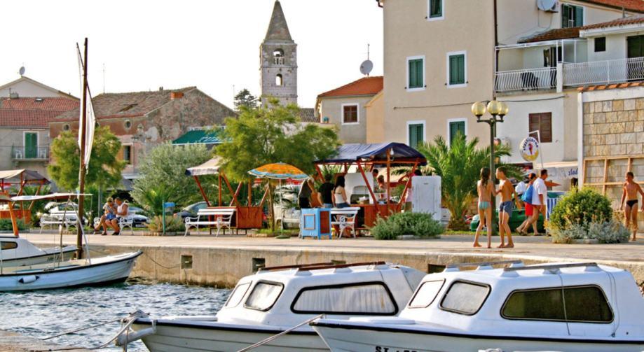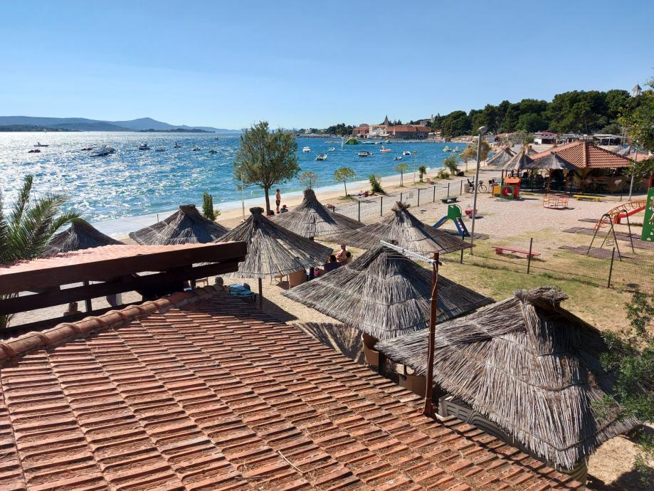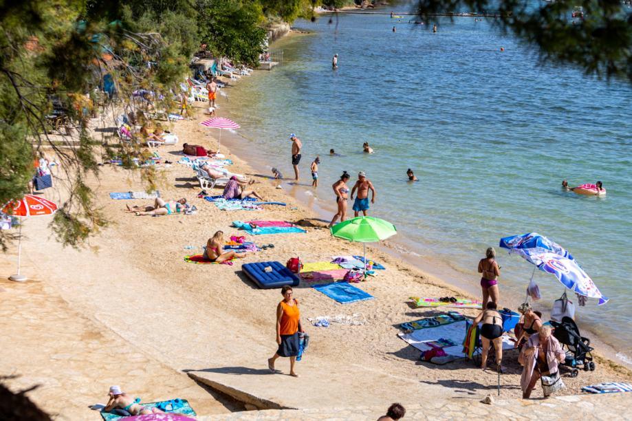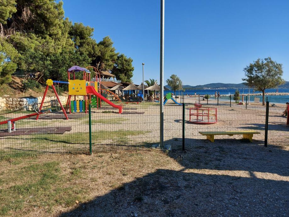 Na plaži se nalazi dječji park sa igralima, aqua park, teren za odbojku na pijesku, nogometno igralište, caffe barovi, restorani, pekare. Postoji mogućnost najma pedalina i kajaka. Plaža poćinje u samom centru i spušta se na jugoistok. Kamp je udaljen 250 m od centra mjesta s kojim je povezan novoizgrađenom šetnicom uz more. Kroz mjesto se proteže stara i autentična dalmatinska riva sa konobama kao i sve ostale turističke usluge - trgovine, restorani, kafići, pekarnice, bankomati, ljekarna, pošta...