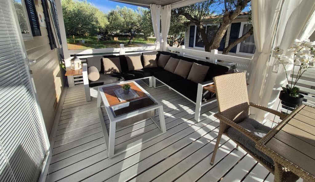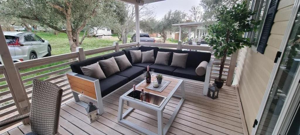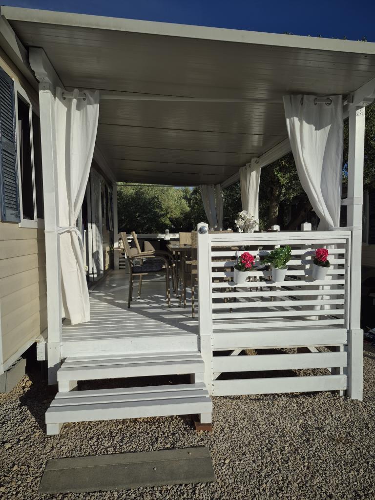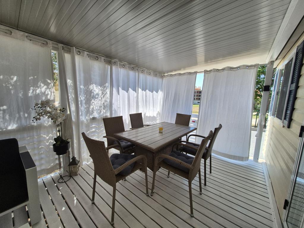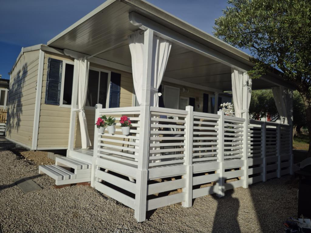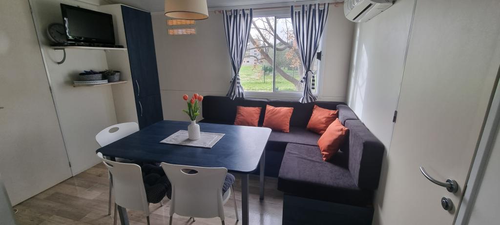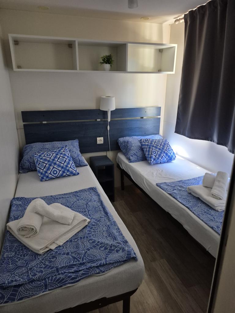 Mobilna kućica San Antonio smještena je u manjem kampu u okruženju mediteranskog raslinja, koji se nalazi na samoj šljunčano pješčanoj plaži Iza Banja, pogodna za obitelji s malom djecom radi postupnog ulaska u more. Mobilna kućica San Antonio se sastoji od 3 spavaće sobe: 1 soba sa bračnim krevetom i 2 sobe s dva kreveta, kupaonica sa tušem i Wc-om, dnevni boravak s kompletno opremljenom kuhinjom sa stolom i stolicama za blagovanje te kutnom garniturom, hladnjak sa zamrzivačem, mikrovalna pećnica, kuhalo za vodu, posuđe i pribor za jelo, aparat za kavu, TV, toster,perilica posuđa i klima uređaj. Terasa je opremljena sa stolom i 6 stolica, kutnom garniturom te plinskim roštiljem. U cijenu su uključeni posteljina, ručnici (2 x tjedno) i parking za jedno vozilo.