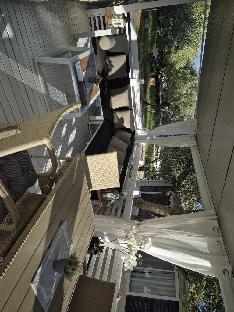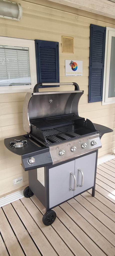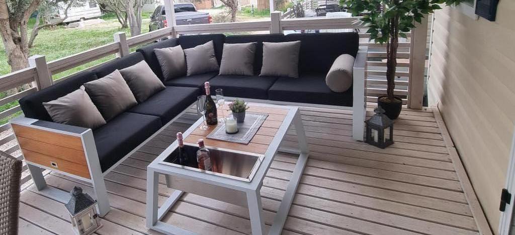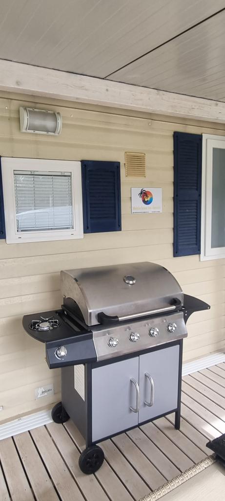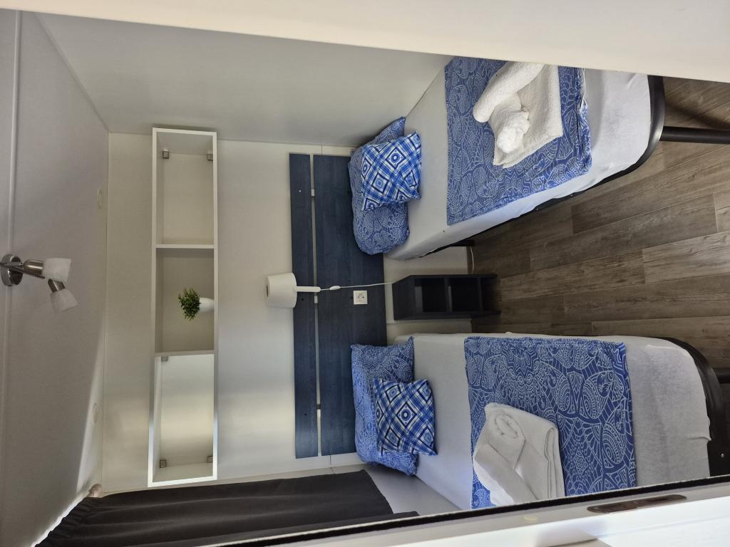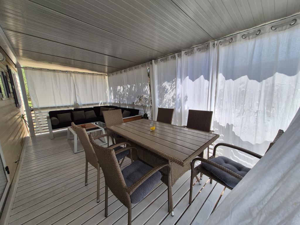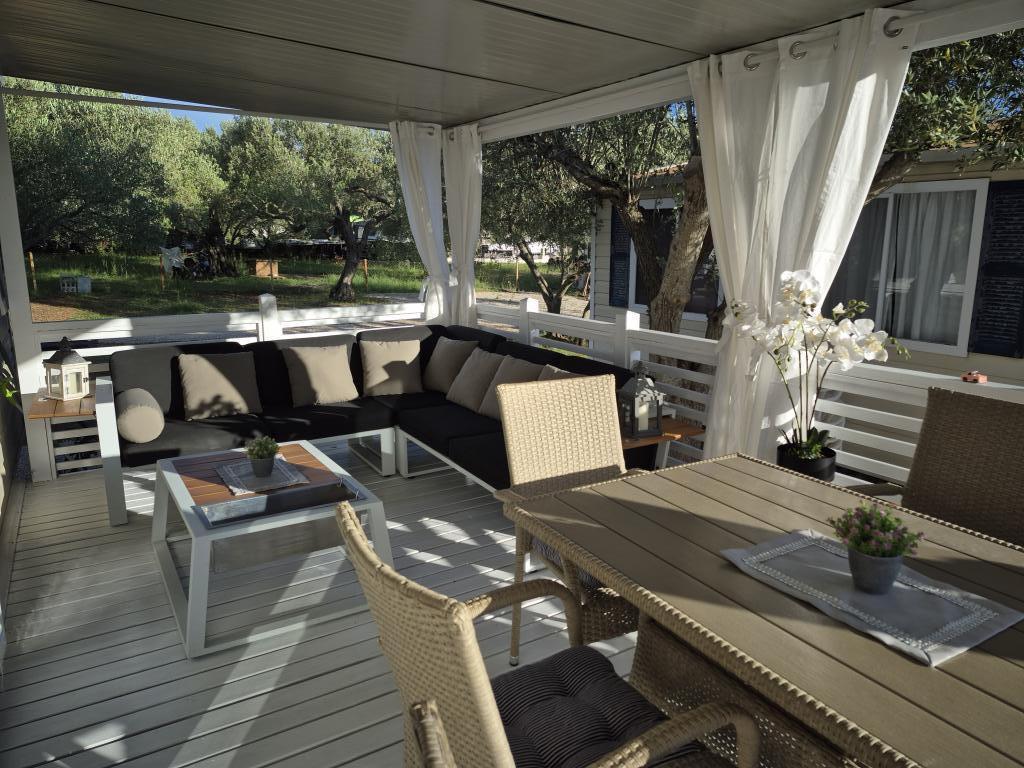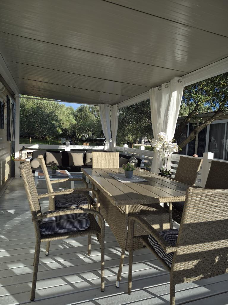 Mobilna kućica San Antonio smještena je u manjem kampu u okruženju mediteranskog raslinja, koji se nalazi na samoj šljunčano pješčanoj plaži Iza Banja, pogodna za obitelji s malom djecom radi postupnog ulaska u more. Mobilna kućica San Antonio se sastoji od 3 spavaće sobe: 1 soba sa bračnim krevetom i 2 sobe s dva kreveta, kupaonica sa tušem i Wc-om, dnevni boravak s kompletno opremljenom kuhinjom sa stolom i stolicama za blagovanje te kutnom garniturom, hladnjak sa zamrzivačem, mikrovalna pećnica, kuhalo za vodu, posuđe i pribor za jelo, aparat za kavu, TV, toster,perilica posuđa i klima uređaj. Terasa je opremljena sa stolom i 6 stolica, kutnom garniturom te plinskim roštiljem. U cijenu su uključeni posteljina, ručnici (2 x tjedno) i parking za jedno vozilo.
