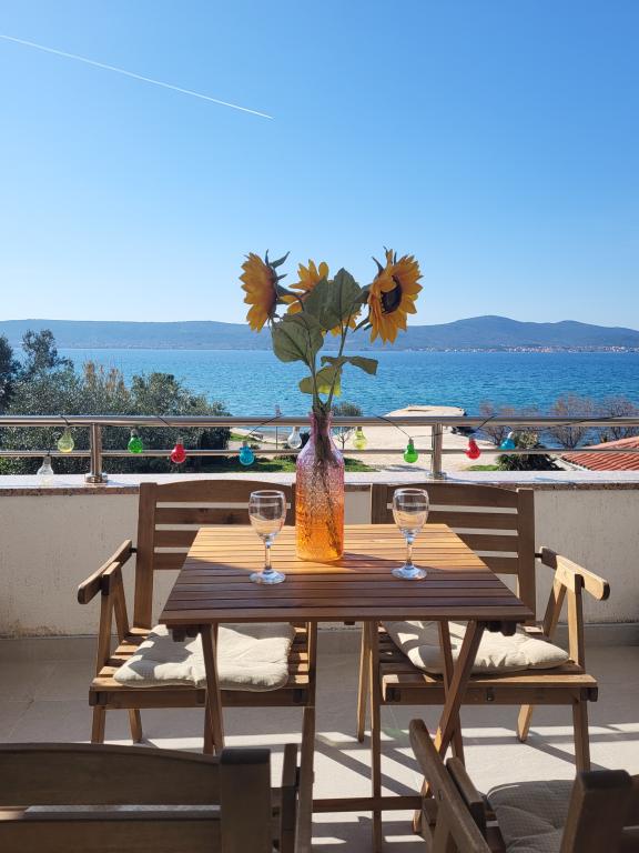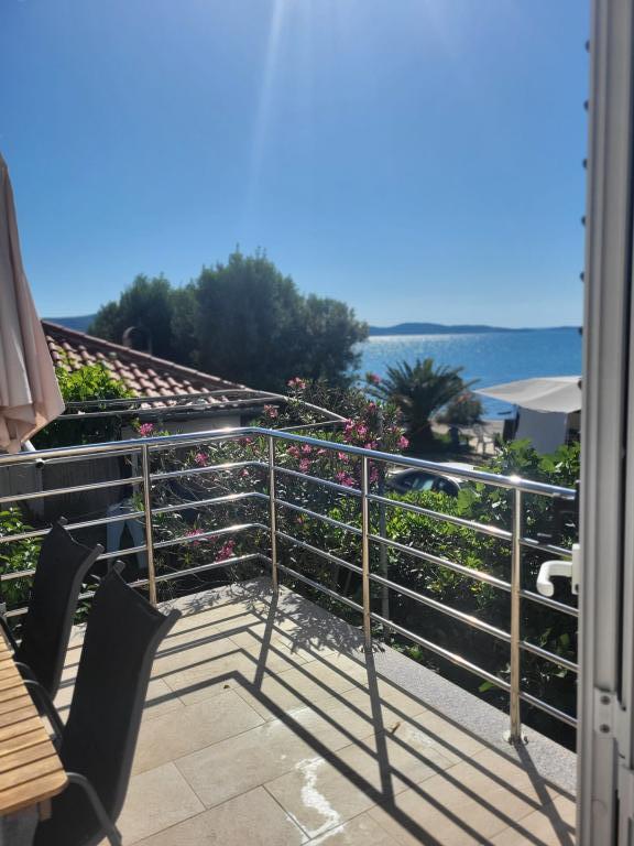 Apartman se nalazi u obiteljskoj kući prvi red do mora. Imate sve što vam je potrebno za obiteljski odmor plus prekrasan pogled sa terase koji se pruža na jedan od najljepših zalazaka sunca na svijetu. Dvije spavaće sobe plus kauč sa damskim ležajem koji može uz pomoć nadmadraca postati idoban ležaj za jednu odraslu osobu. Kupaona je sa tušem i još jedan dodatni wc ,odvojeno. Ispred kuće imate lijepu šljunčanu plažu sa stablima pored kojih se nalaze ležaljke za naše goste. U sklopu kuće imamo obiteljski kamp sa pripadajućim wc I tuševima koje možete koristiti dok ste na plaži. Od kuće 5 min hoda uz more se nalazi pizzeria i beach bar gdje možete popiti kavicu ili koktel . Objekt se nalazi u predjelu gdje su većinom privatni obiteljski kampovi tako da je dosta mirno i nikako nije prenapučeno. Nismo novi u ovoj branši tako da ako vas zanimaju recenzije za naš objekt možete ih naći na "bookingu". Imate i mogućnost spuštanje broda do 6 m dužine u more i mogućnost priveza na bovu.