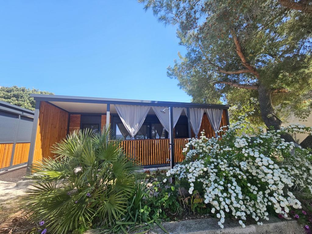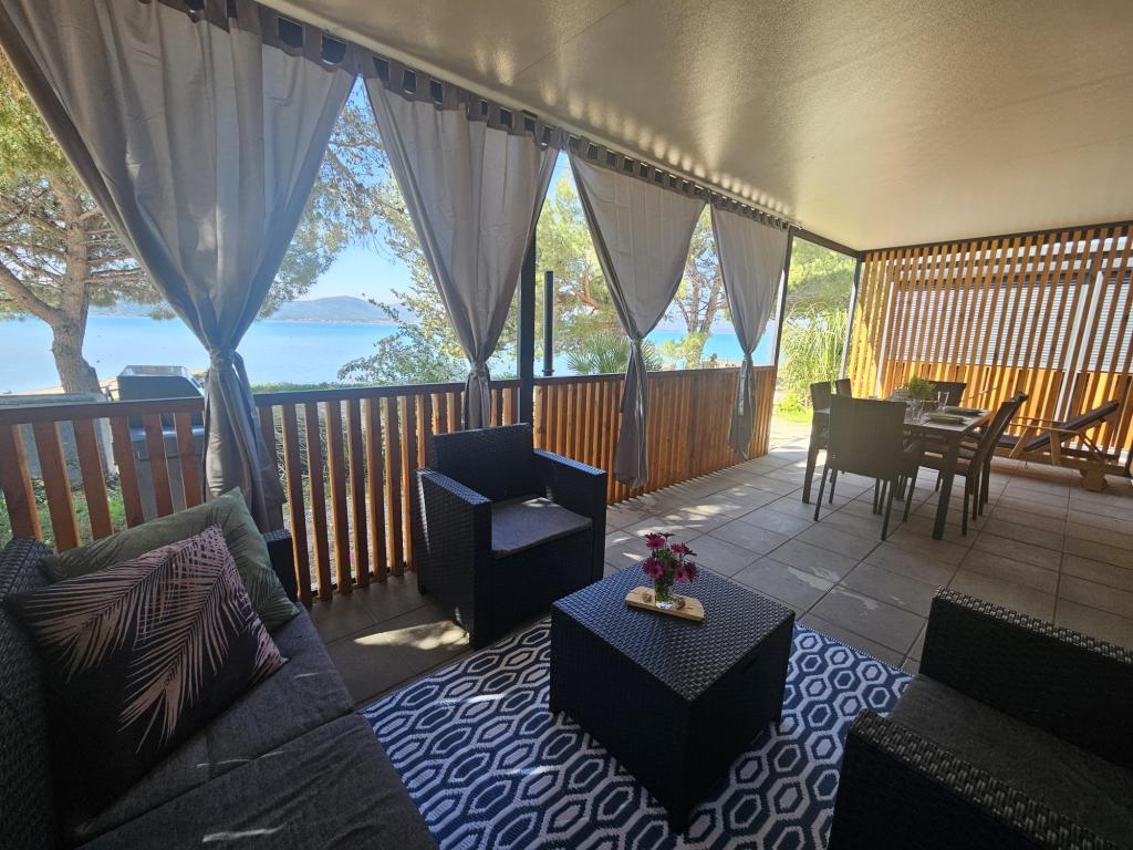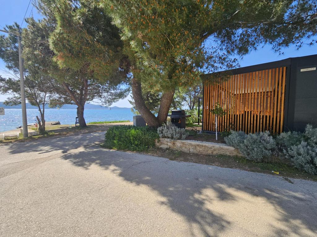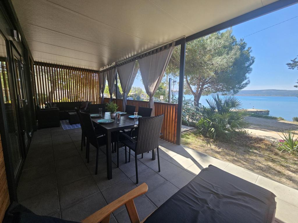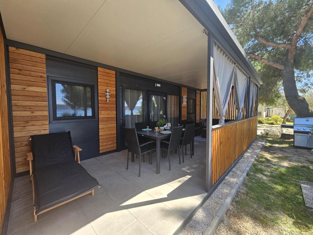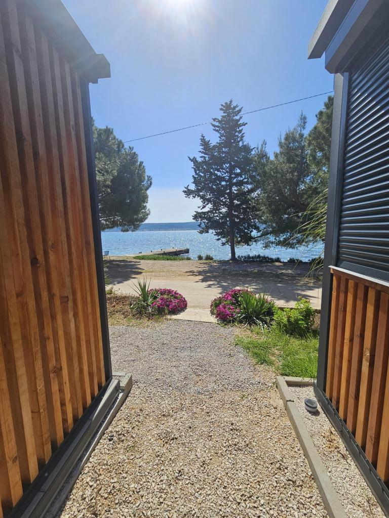 Nova moderna mobilna kućica. Smještena u mirnom i malom mjestu, svega nekoliko koraka od plaže. Direktan pogled na more, velika terasa, plinski roštilj i ležaljke za vaš savršeni odmor. Sastoji se od 2 spavaće sobe, kupaonice, kuhinje, dnevnog boravka s kaučem na razvlačenje. Objekt se nalazi na samoj obali, prvi red do mora, a do dućana, pekarne, restorana i kafića ima svega 5 minuta lagane šetnje. Gostima su na raspolaganju TV, internet, klima, plinski roštilj, sušilo za kosu, te besplatni parking.