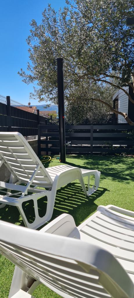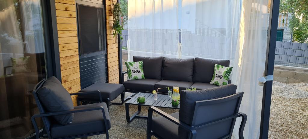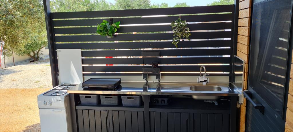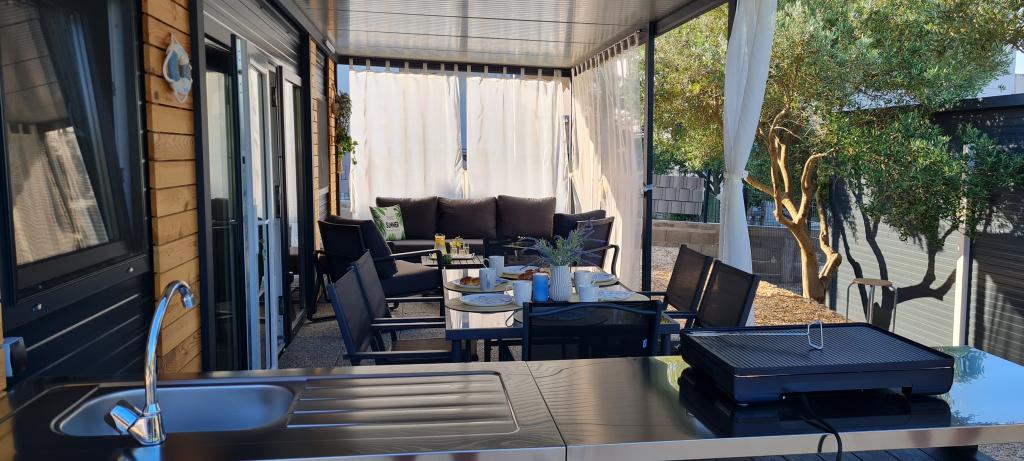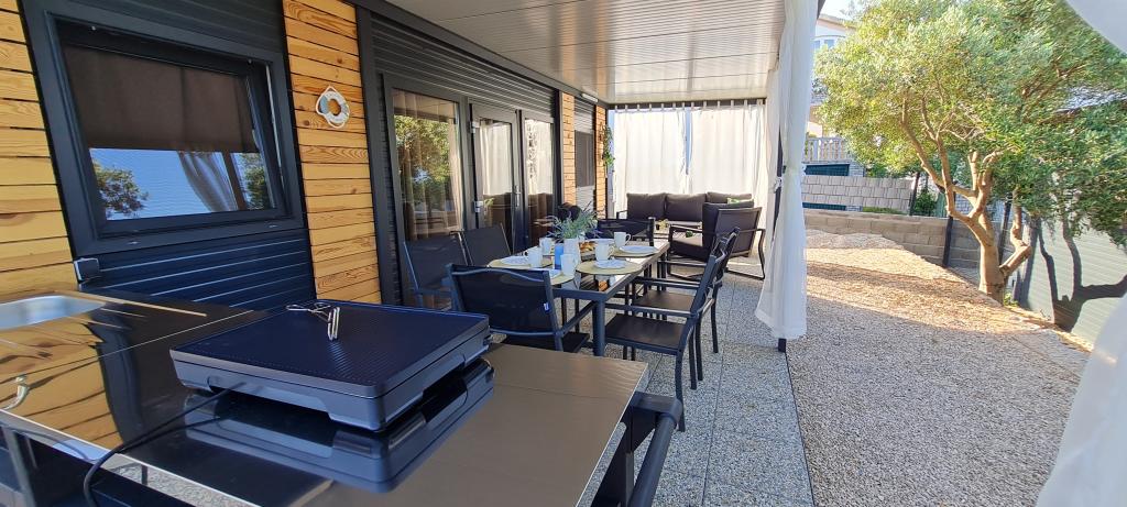 Vrlo lijepa mobilna kućica u mirnom kampu, blizu mora, gdje nema gužve. Kuća ima vrlo veliku terasu s vanjskom kuhinjom. Odličan izbor. Preporučam.