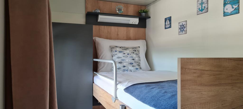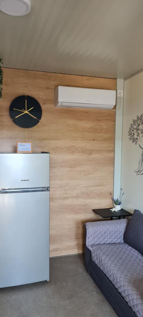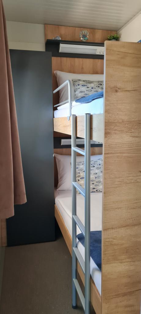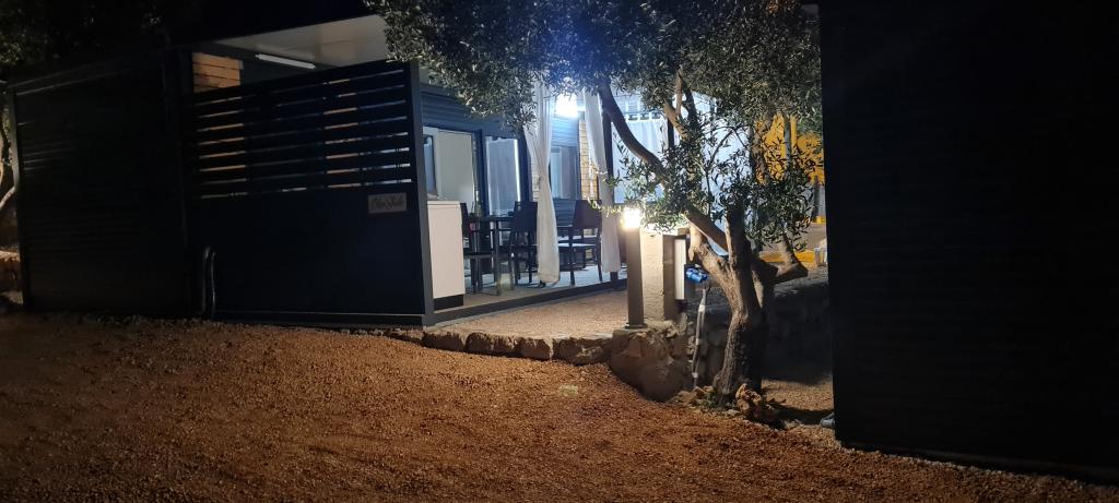 Mobilna kućica 24 m2 + 40m2 terase (24 m2 natkriveno) + privatni prostor za sunčanje u malom mirnom kampu. Do 5 osoba. Dvije spavaće sobe (veliki bračni krevet i krevet na kat) + pomoćni ležaj, tuš kabina, WC, sušilo za kosu, toaletni papir, posteljina, kuhinjski pribor, hladnjak, kuhalo za vodu, mikrovalna pećnica, mini električna pećnica, električni roštilj, vanjska blagovaonica, vanjska kuhinja sa sudoperom i štednjakom na plin, garderoba, garnitura za sjedenje, ležaljke i prostor za sunčanje uz kućicu, SAT TV (850 programa), besplatni Wi-Fi, klima uređaj. Napomena: ručnici i kuhinjske krpe nisu u ponudi.