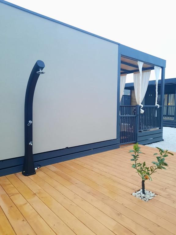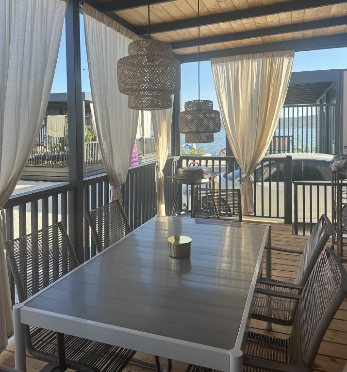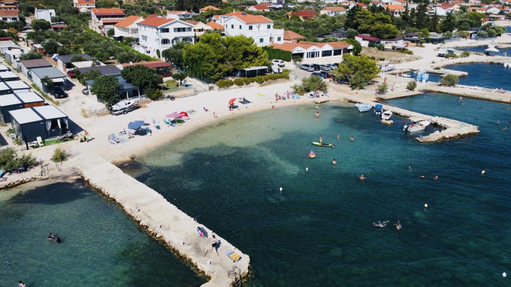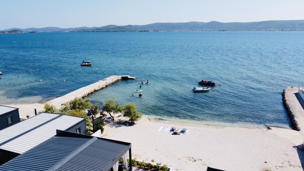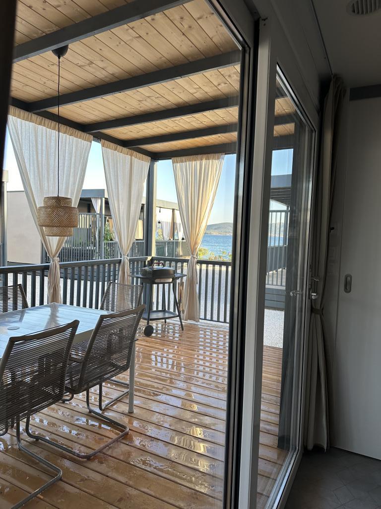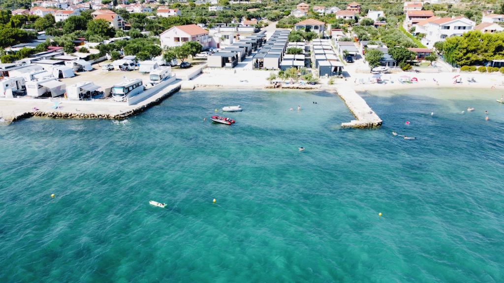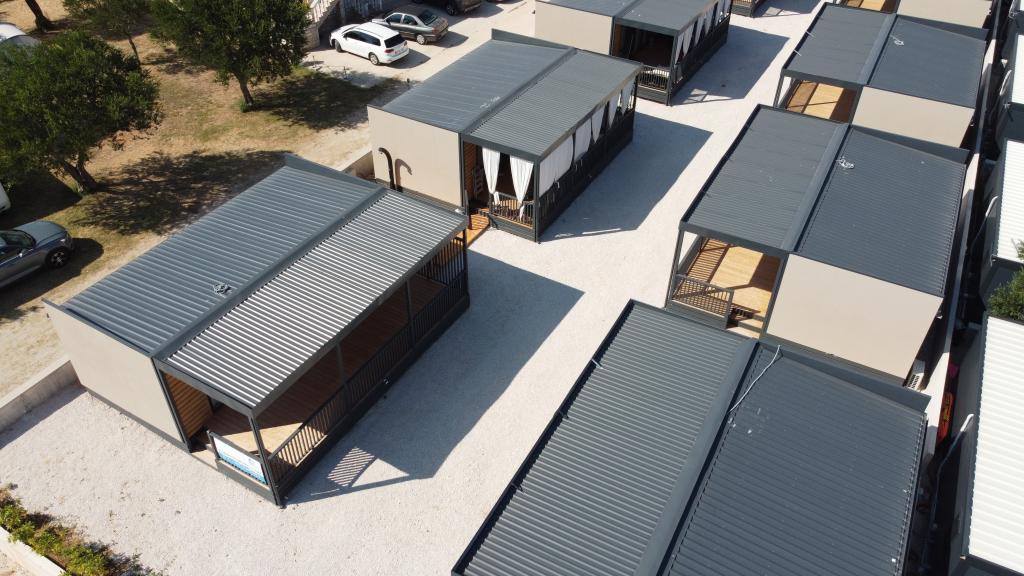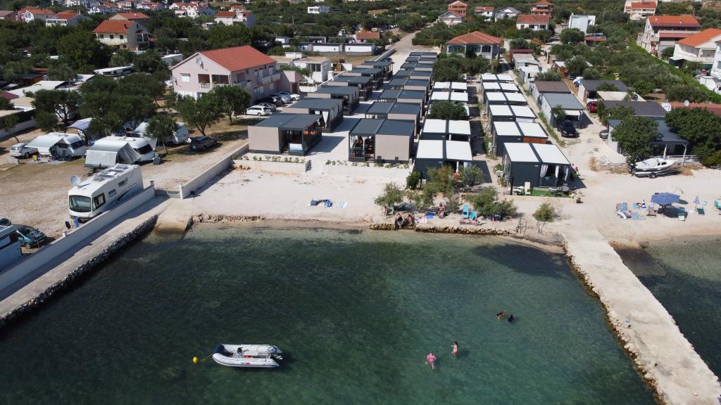 Kompletno i moderno opremljena mobilna kućica smještena u mirnom,malom kampu, svega nekoliko koraka do plaže. Uz predivan pogled na more možete uživati na terasi na lounge foteljama ili na ležaljkama druge terase, uz lagani povjetarac. Sastoji se od 2 spavaće sobe, 2 kupaonice, kuhinje, dnevnog boravka s kaučem na razvlačenje. Objekt se nalazi 10 minuta šetnje uz obalu od centra,dućana,pekare,restorana,kafića. Prvi restoran je 2 minute hoda.