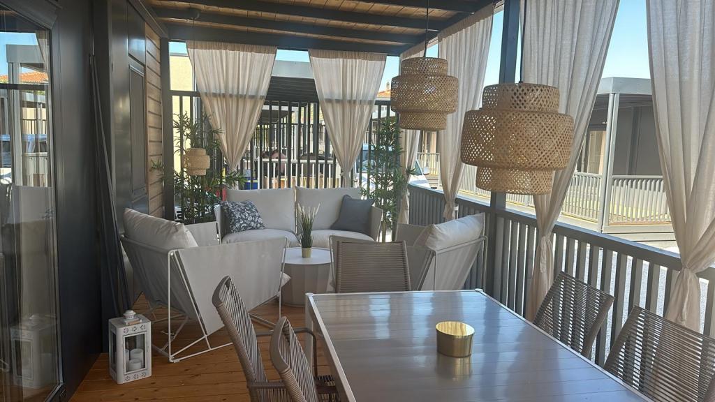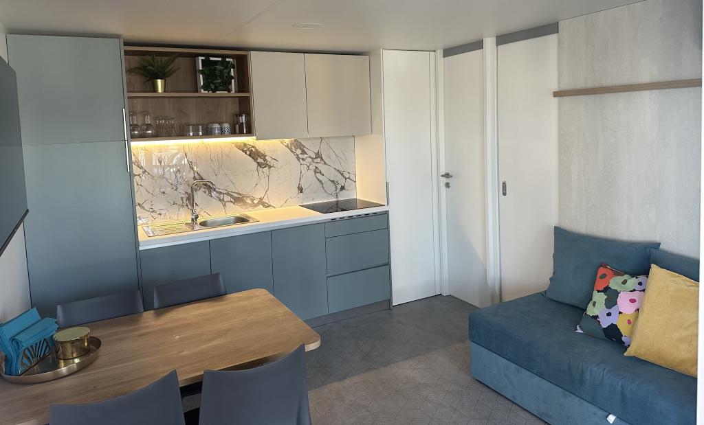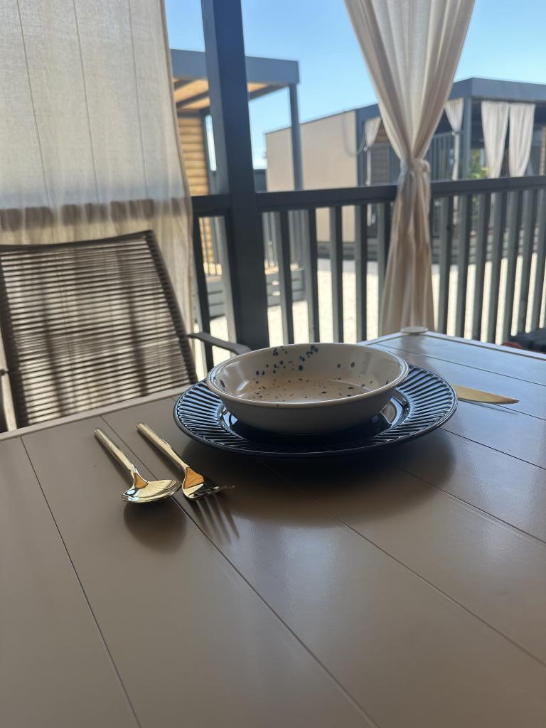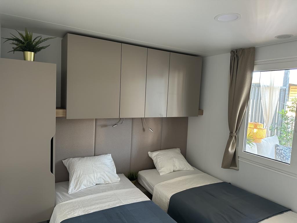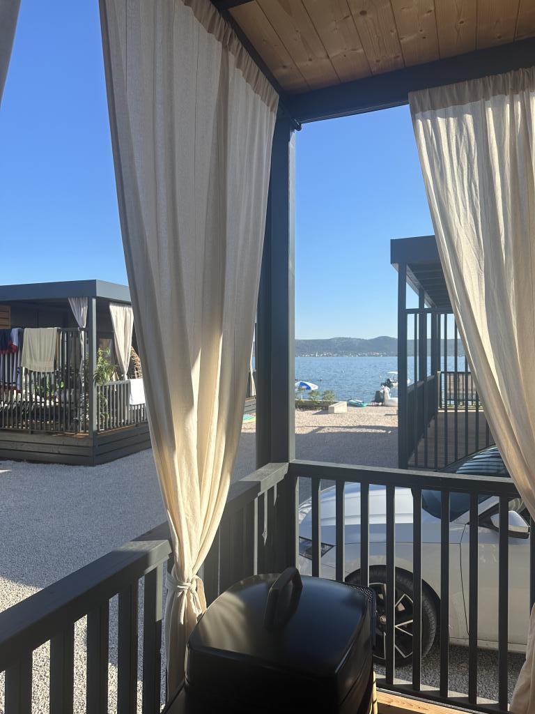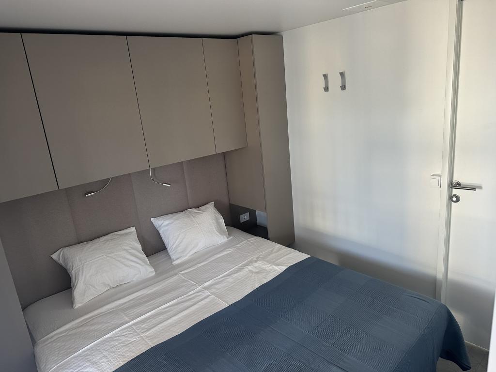 Kompletno i moderno opremljena mobilna kućica smještena u mirnom,malom kampu, svega nekoliko koraka do plaže. Uz predivan pogled na more možete uživati na terasi na lounge foteljama ili na ležaljkama druge terase, uz lagani povjetarac. Sastoji se od 2 spavaće sobe, 2 kupaonice, kuhinje, dnevnog boravka s kaučem na razvlačenje. Objekt se nalazi 10 minuta šetnje uz obalu od centra,dućana,pekare,restorana,kafića. Prvi restoran je 2 minute hoda.