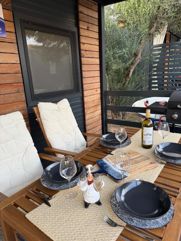 Prekrasna mobilna kucica na samom moru svega par koraka do lijepe šljunčane plaze i mirne obale , nadomak restorana i kafica , ugodna za odmor i druzenje s prijateljima djeci prikladna jer iz same kucice mogu prosetati na kupanje