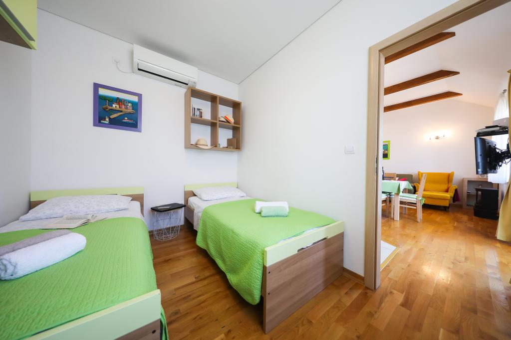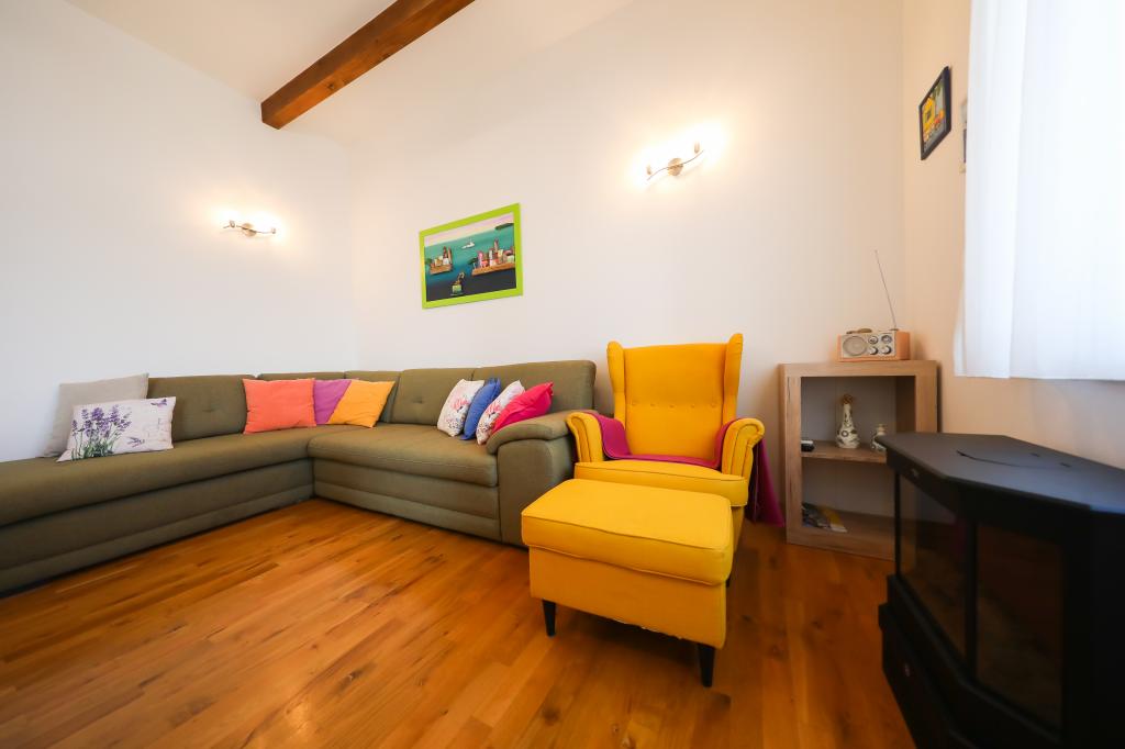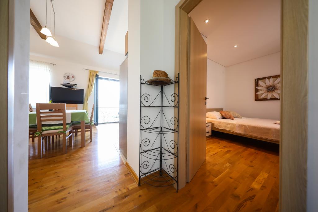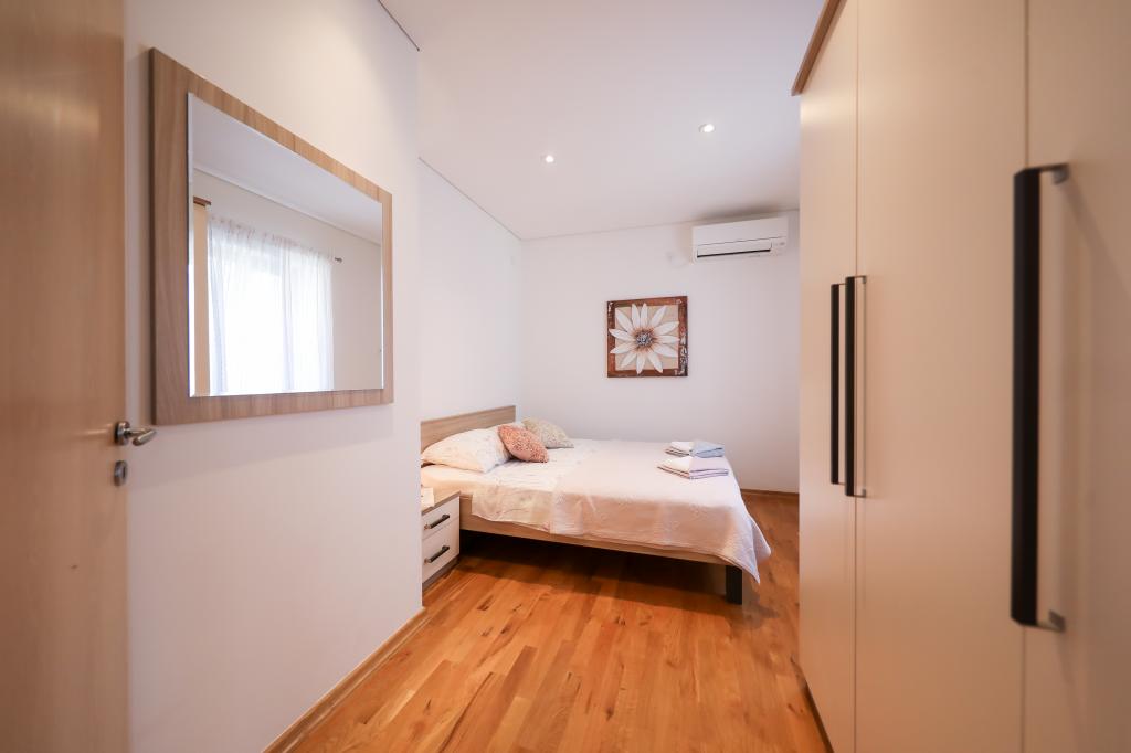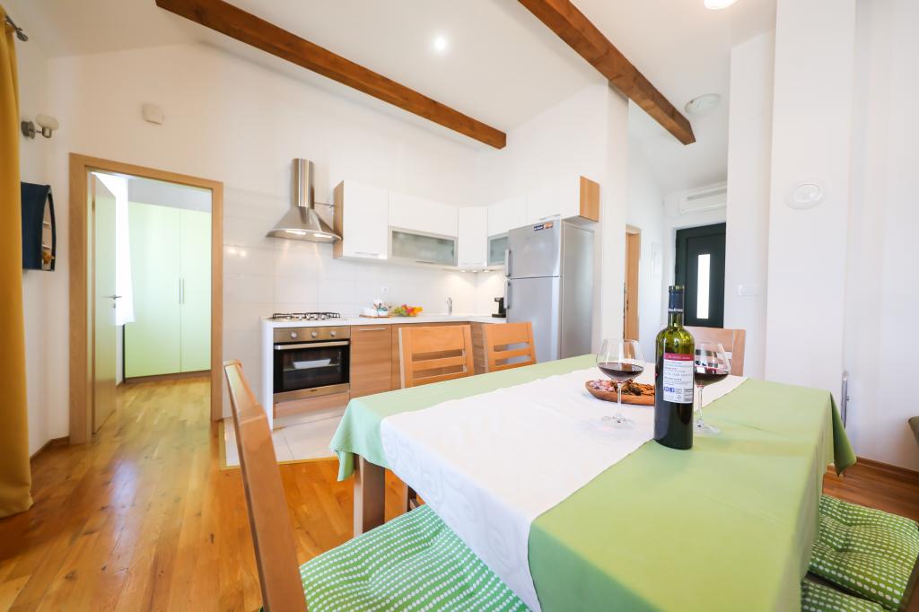 Apartman je smješten u prvom redu do mora u staroj jezgri Tisnog. Potpuno je novo uređen i opremljen, s prekrasnim pogledom na more, selo, te obližnje otoke i obalu. Apartman ima dva balkona, jedan s pogledom na more, te jedan na stražnjoj strani kuće. Smješten je na 1. katu objekta i nudi odlične uvijete i ambijent za vrlo ugodan odmor. U prizemlju kuće nalazi se i manje, zatvoreno dvorište s roštiljem koji je na raspolaganju gostima. Na upit raspoložive su i 3 bicikle. Ispred kuće osigurano je jedno parkirno mjesto, bez naplate te vez za brod. Apartman je moderno uređen, opremljen kuhinjom s pećnicom, štednjakom, hladnjakom, mašinom za pranje posuđa, aparatom za kavu, kuhalom za vodu. Kupatilo je opremljeno tuš kabinom, mašinom za pranje rublja, sušilom za kosu. U apartmanu je raspoloživo glačalo, SAT TV, WiFi, radio, a svaka soba ima svoju zasebnu klimu,