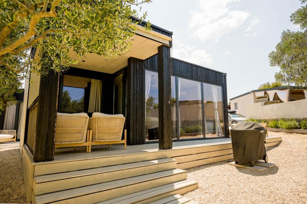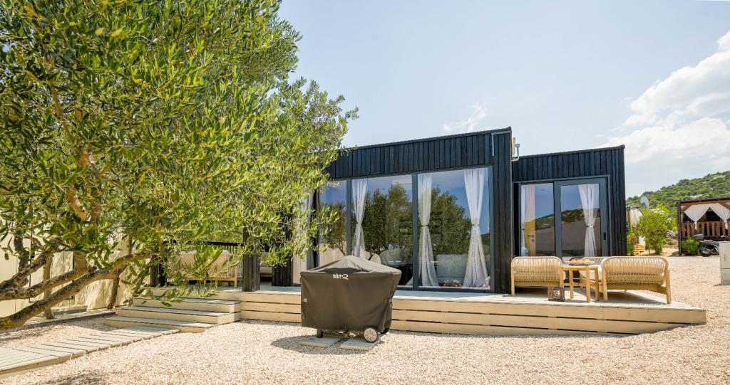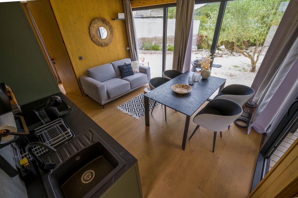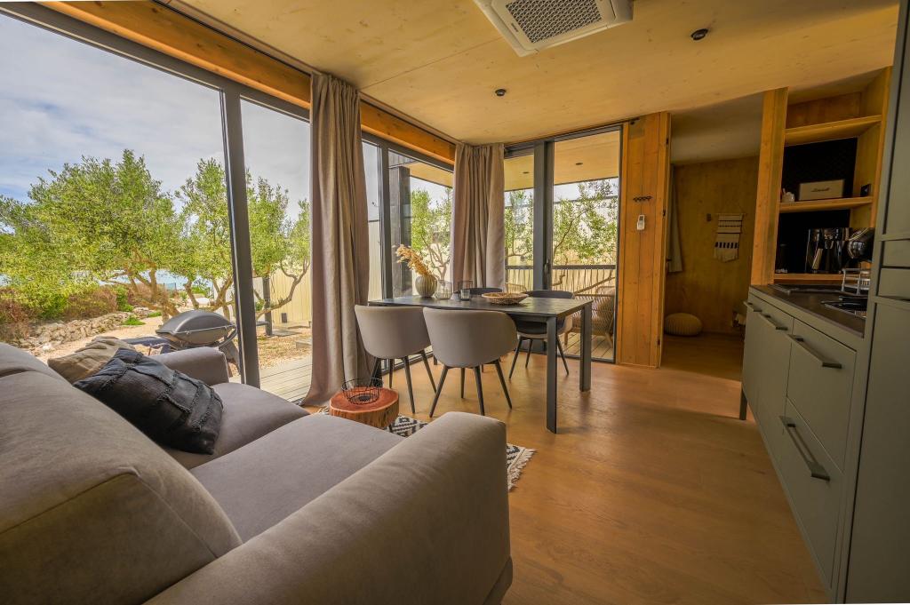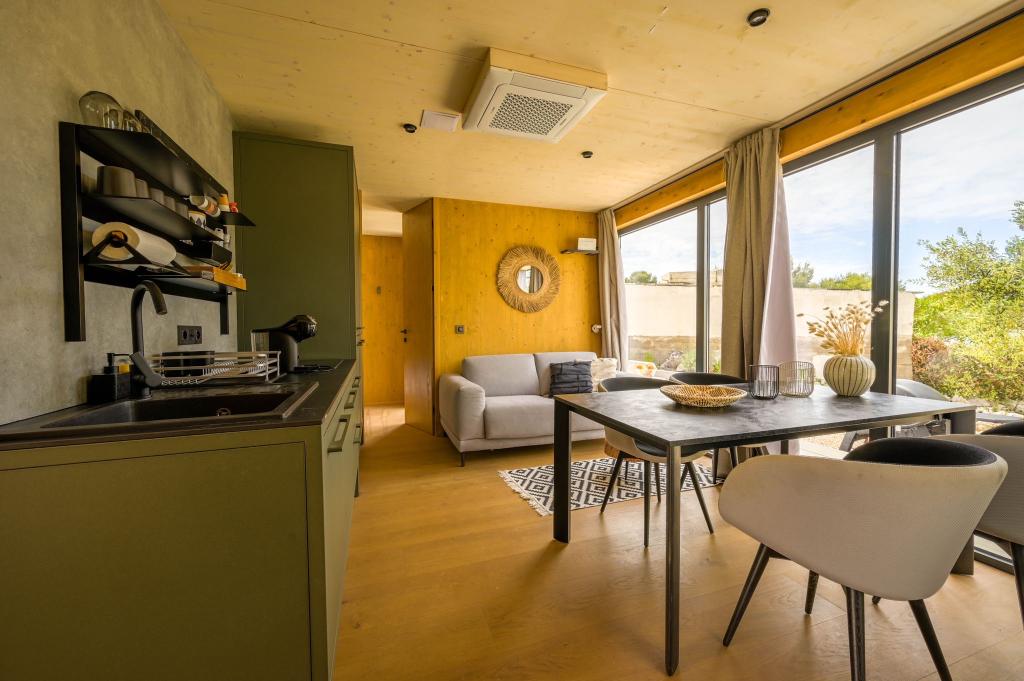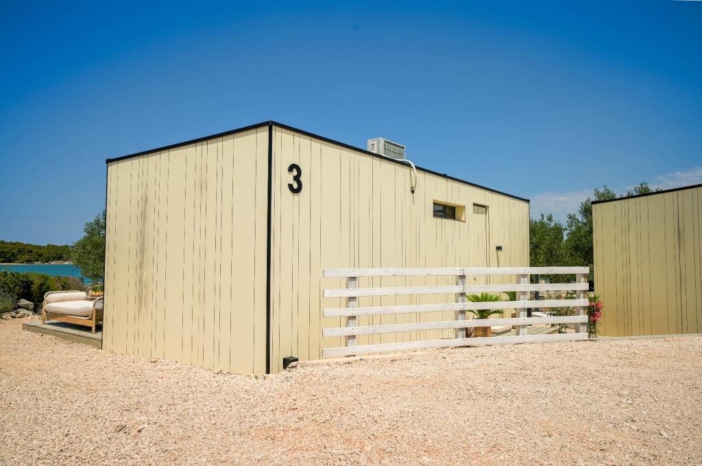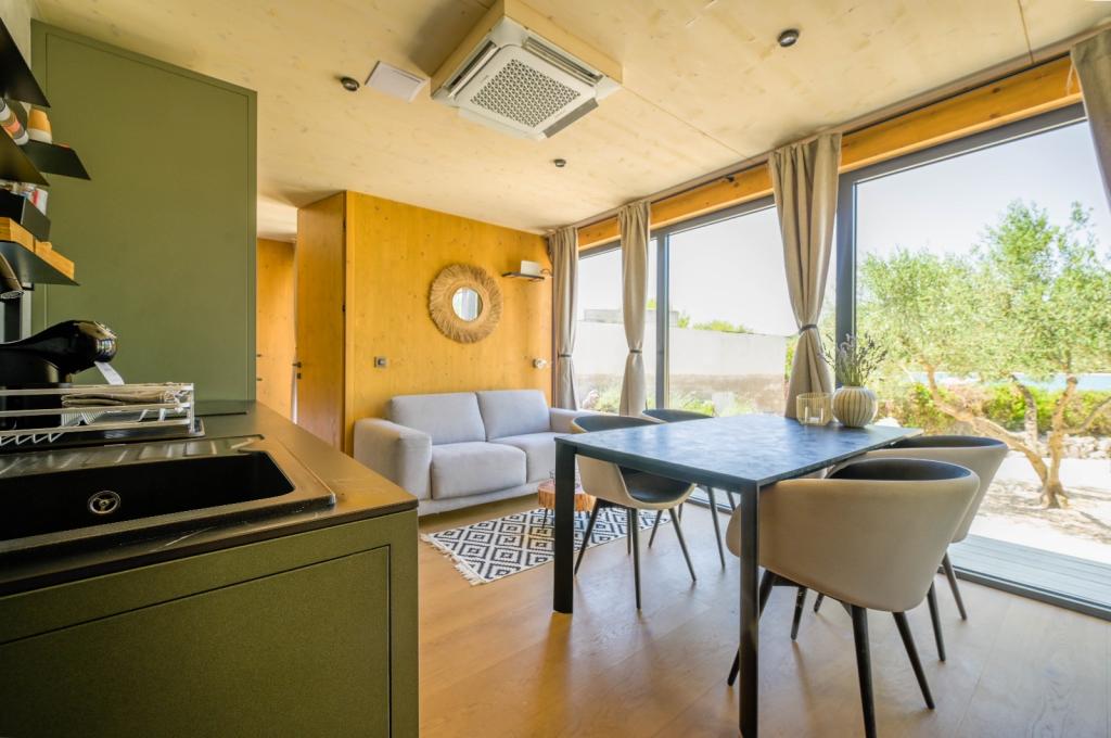 Mobilna kučica je udaljena samo nekoliko koraka od mora. Moderni interijer apartmana susreće se s tipičnom Dalmacijom. Okružen bijelim šljunkom i zelenim maslinama, a ispred samo beskrajno plavetnilo. More, sunce i vjetar stvaraju neopisivu igru koja oduševljava sva osjetila. Bez obzira spavate li u jednoj od dvije spavaće sobe, ujutro možete uživati u plavetnilu mora i sjaju sunca. A iz potpuno opremljene kuhinje sa svime što vam je potrebno (uključujući perilicu posuđa i zamrzivač) i prostranog blagovaonskog stola, otvara se neopisiv pogled na terasu i sve čari koje sunce i more pružaju. Bilo da pripremate obrok u kuhinji ili roštiljate na terasi, zajamčeni su vam potpuni mir i privatnost. Cilj svakog godišnjeg odmora je ostaviti svakodnevicu i rutinu iza sebe, a upravo to nudi naš objekt. Iako okruženi s 8 sličnih objekata, uživat ćete u potpunoj privatnosti i miru jer vam svi čuvaju leđa. Pred vama je samo granica neba i mora.