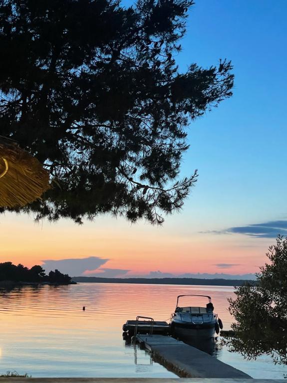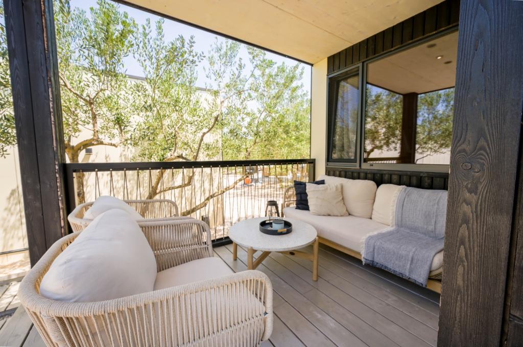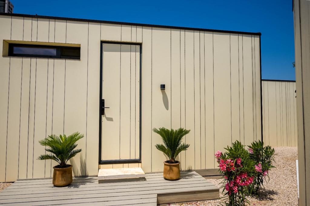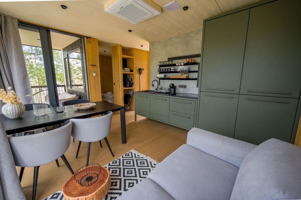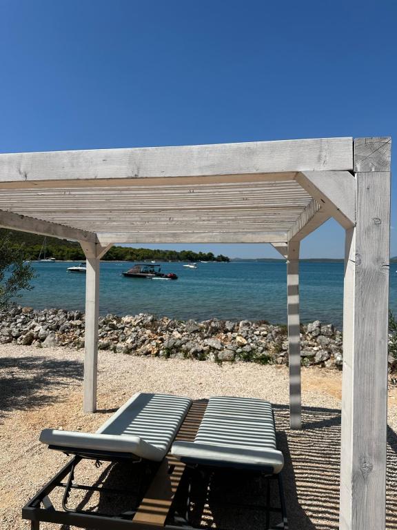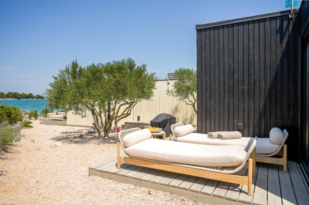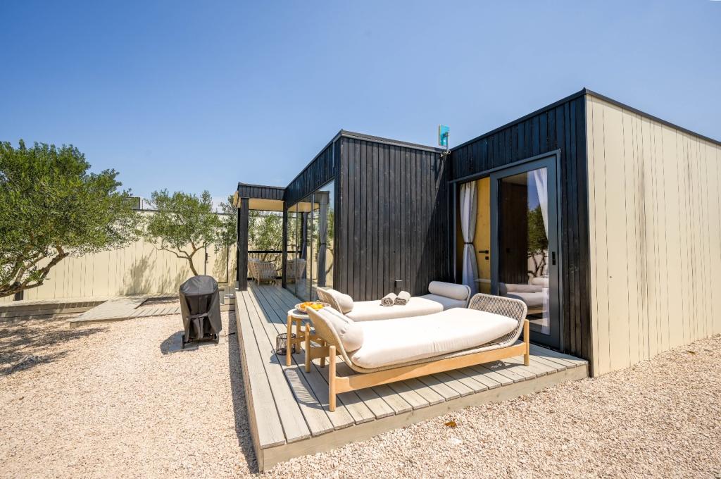 Mobilna kučica je udaljena samo nekoliko koraka od mora. Moderni interijer apartmana susreće se s tipičnom Dalmacijom. Okružen bijelim šljunkom i zelenim maslinama, a ispred samo beskrajno plavetnilo. More, sunce i vjetar stvaraju neopisivu igru koja oduševljava sva osjetila. Bez obzira spavate li u jednoj od dvije spavaće sobe, ujutro možete uživati u plavetnilu mora i sjaju sunca. A iz potpuno opremljene kuhinje sa svime što vam je potrebno (uključujući perilicu posuđa i zamrzivač) i prostranog blagovaonskog stola, otvara se neopisiv pogled na terasu i sve čari koje sunce i more pružaju. Bilo da pripremate obrok u kuhinji ili roštiljate na terasi, zajamčeni su vam potpuni mir i privatnost. Cilj svakog godišnjeg odmora je ostaviti svakodnevicu i rutinu iza sebe, a upravo to nudi naš objekt. Iako okruženi s 8 sličnih objekata, uživat ćete u potpunoj privatnosti i miru jer vam svi čuvaju leđa. Pred vama je samo granica neba i mora.