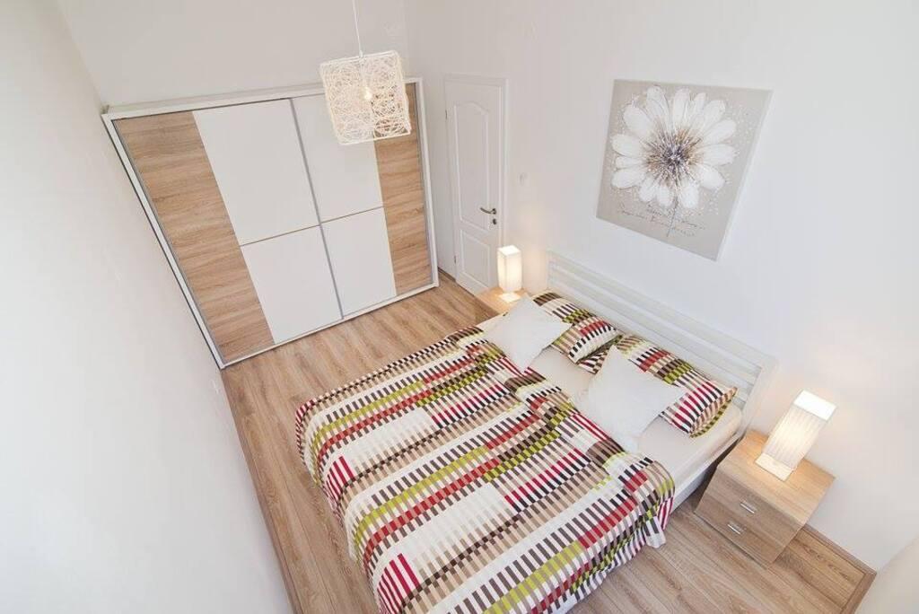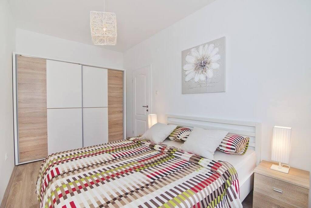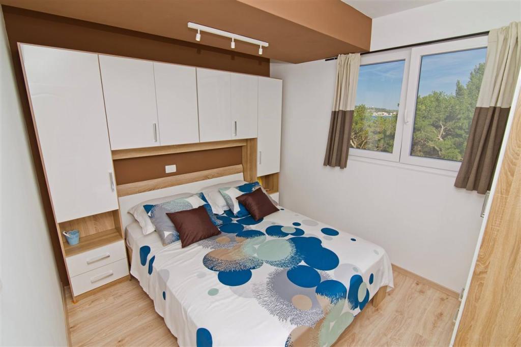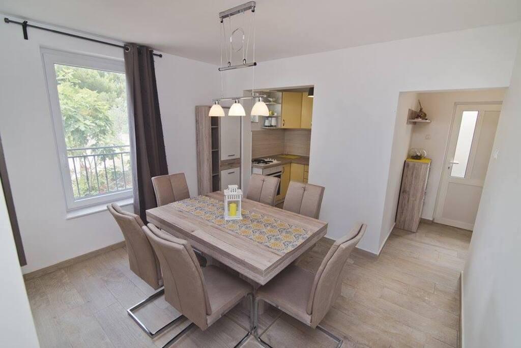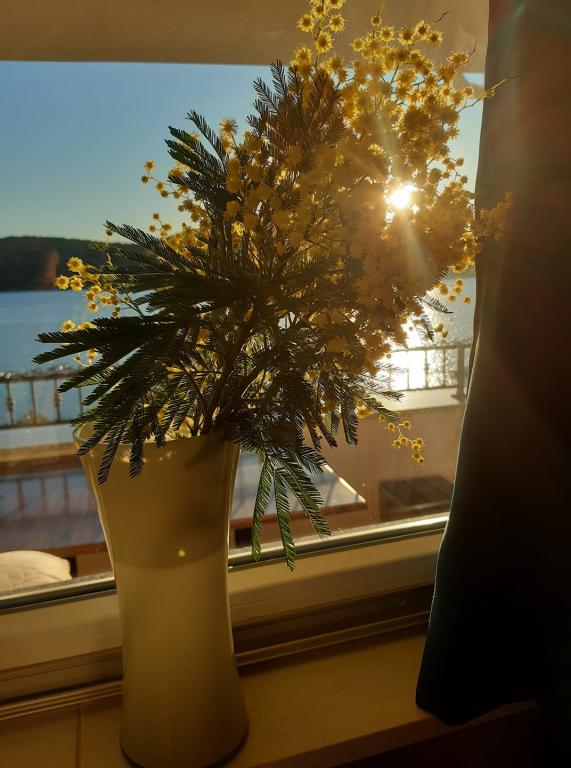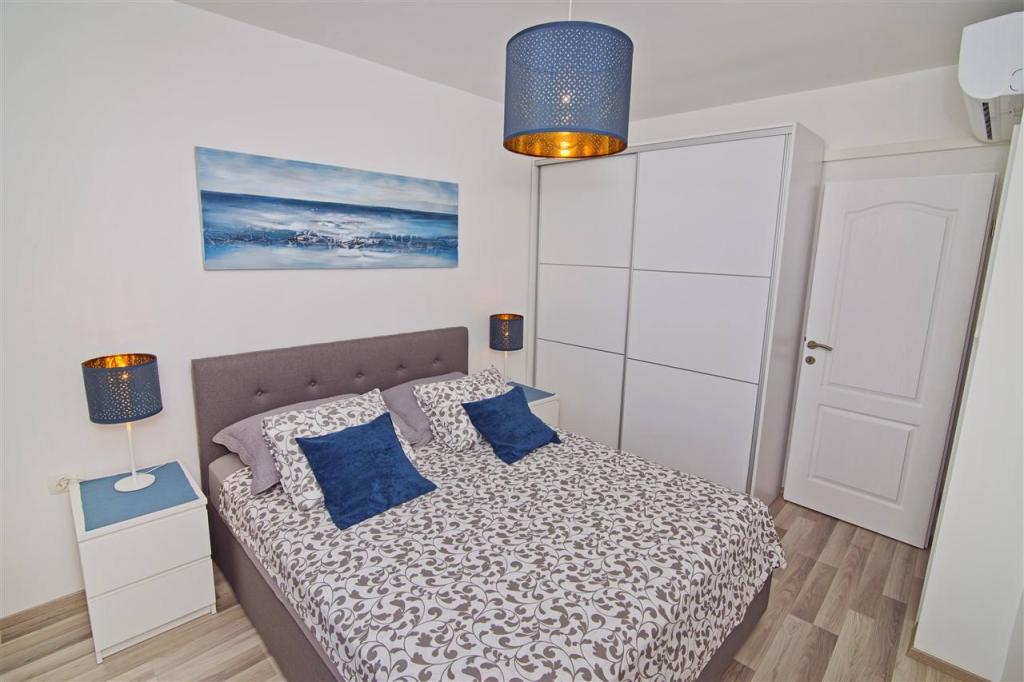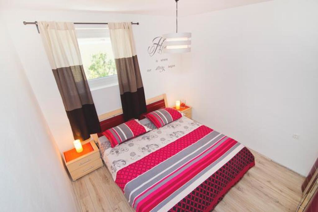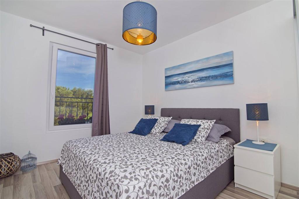 Nalazimo se sa kopnene strane mosta, neposredno uz plažu Jazine. Naš objekt sadrži 2 apartmana, svaki sa 3 spavaće sobe, potpuno opremljeni sa predivnim pogledom na more. Sadrže svu potrebnu opremu, kao i posteljinu i ručnike. Apartmani su klimatizirani, imaju besplatan parking i wi-fi. Uz apartman moguće je osigurati i vez za brod na bovi, bez dodatne naplate.Ispred apartmana nalazi se mala riva za kupanje, pogodna i za manju djecu, dok se glavna plaža Jazine nalazi na udaljenosti 5 minuta hoda. Apartmani se nalaze u mirnom kvartu, bez buke te su pogodni za obiteljski odmor .