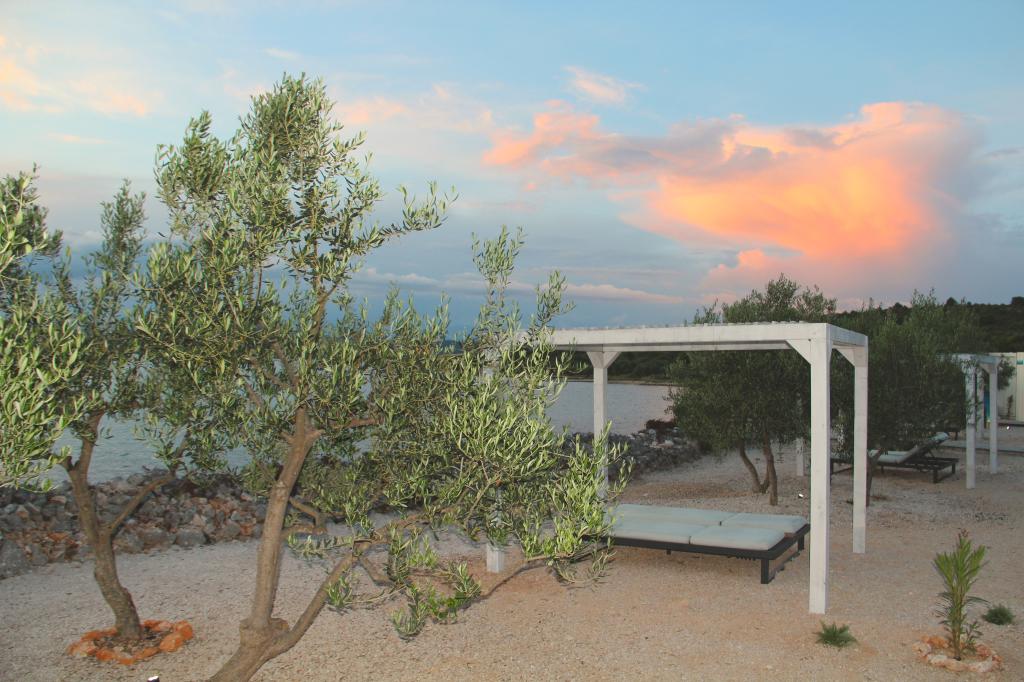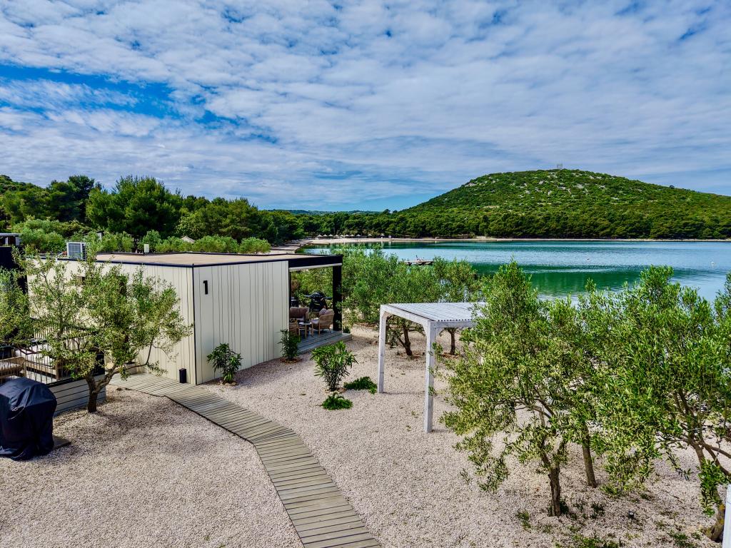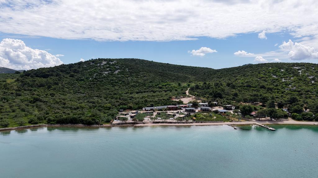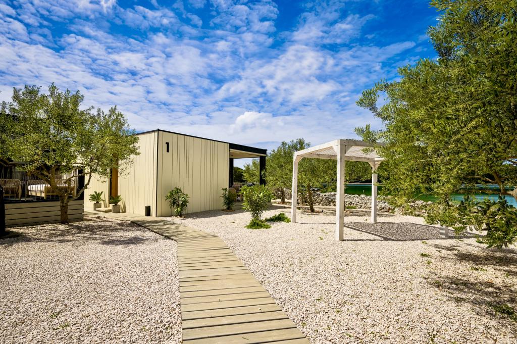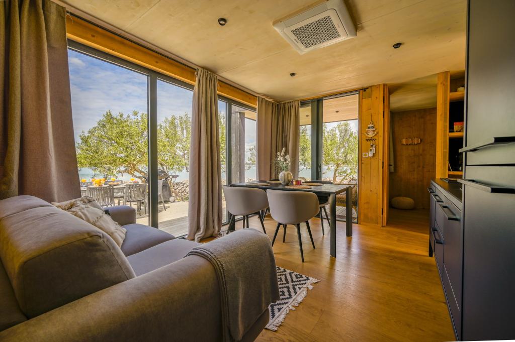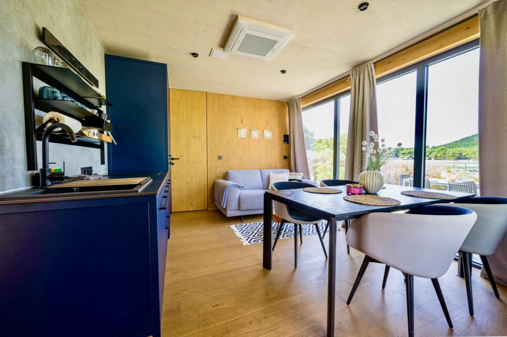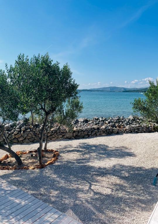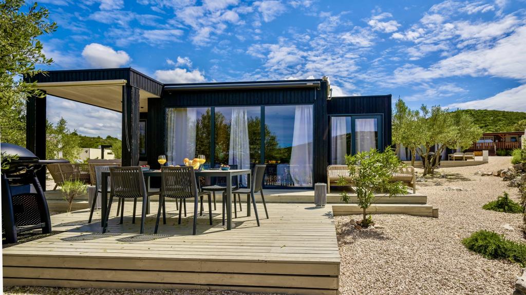 Mobilna kučica je udaljena samo nekoliko koraka od mora. Moderni interijer apartmana susreće se s tipičnom Dalmacijom.Okružen bijelim kamenčićim i zelenim maslinama, a ispred samo beskrajno plavetnilo. More, sunce i vjetar stvaraju neopisivu igru ​​koja oduševljava sva osjetila. Bez obzira spavate li u jednoj od dvije spavaće sobe, ujutro možete uživati ​​u plavetnilu mora i sjaju sunca. A iz potpuno opremljene kuhinje sa svime što vam je potrebno (uključujući perilicu posuđa i zamrzivač) i prostranog blagovaonskog stola, otvara se neopisiv pogled na terasu i sve čari koje sunce i more pružaju. Bilo da pripremate obrok u kuhinji ili roštiljate na terasi, zajamčeni su vam potpuni mir i privatnost. Cilj svakog godišnjeg odmora je ostaviti svakodnevicu i rutinu iza sebe, a upravo to nudi naš objekt. Iako okruženi s 8 sličnih zgrada, uživat ćete u potpunoj privatnosti i miru jer vam svi čuvaju leđa. Pred Vama je samo granica neba i mora.
