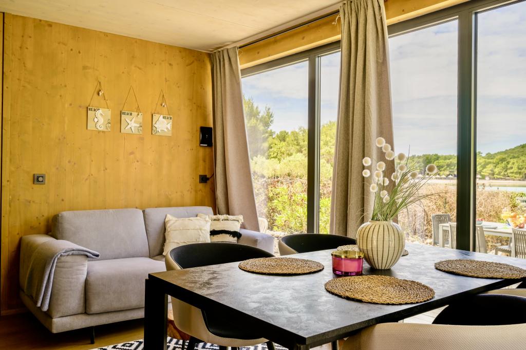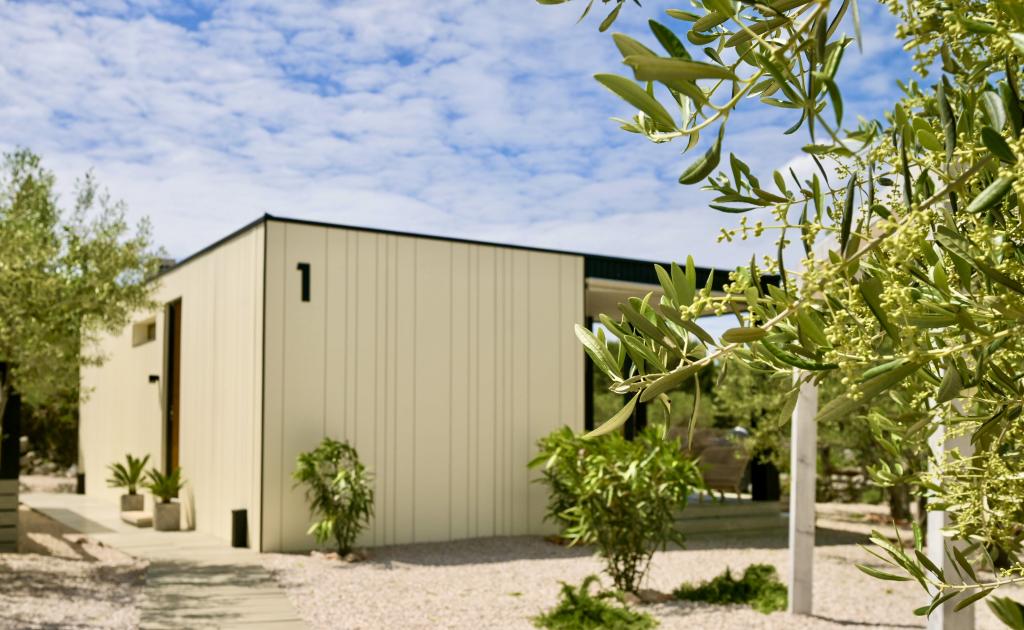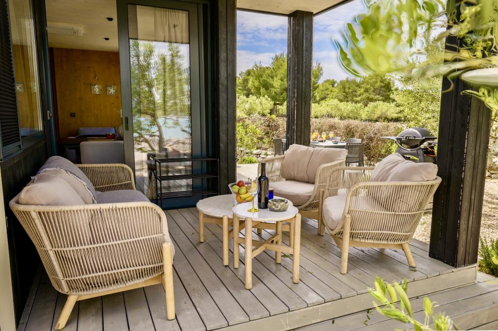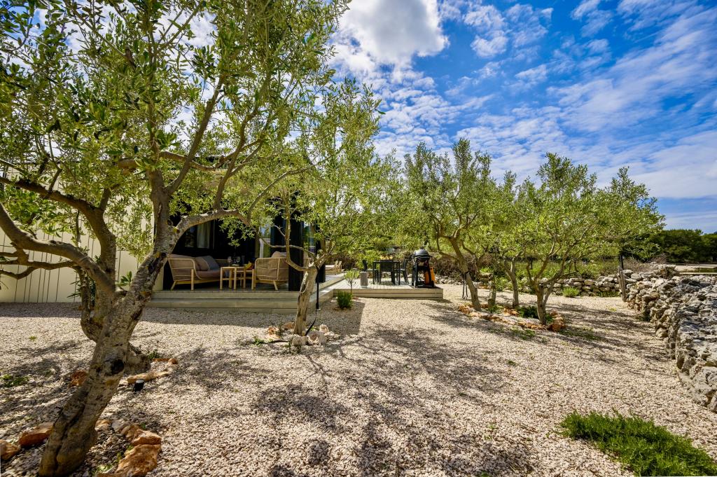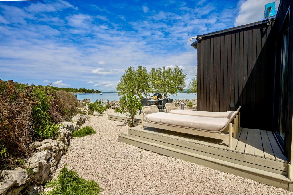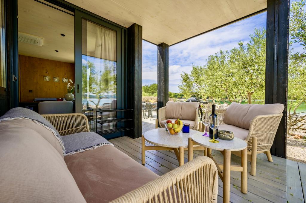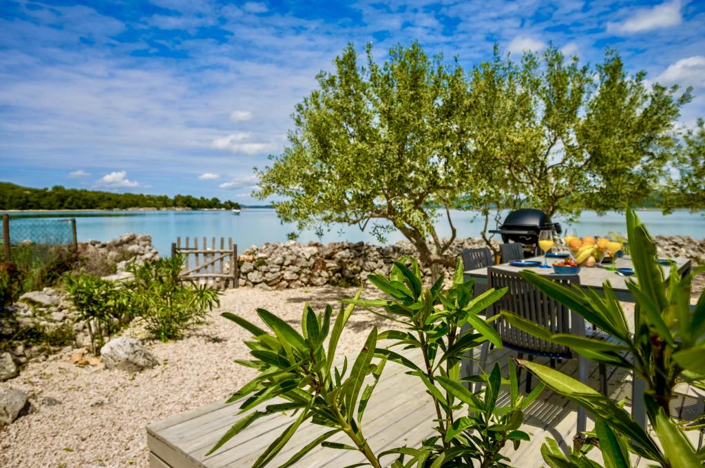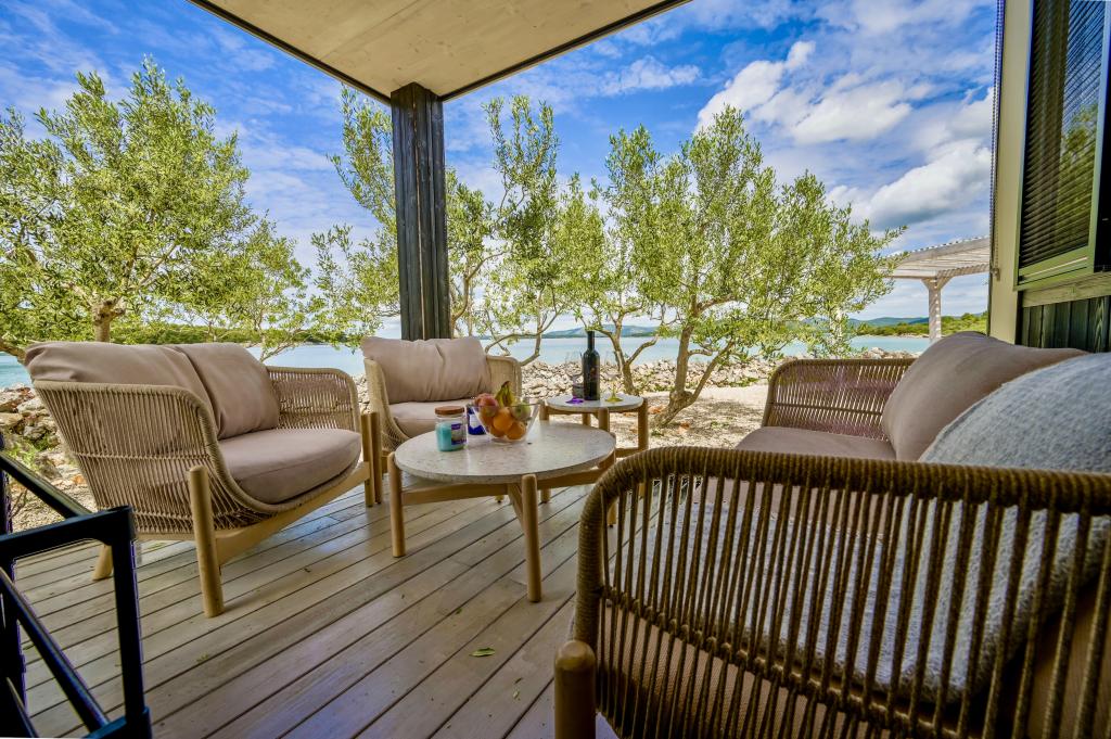 Mobilna kučica je udaljena samo nekoliko koraka od mora. Moderni interijer apartmana susreće se s tipičnom Dalmacijom.Okružen bijelim kamenčićim i zelenim maslinama, a ispred samo beskrajno plavetnilo. More, sunce i vjetar stvaraju neopisivu igru ​​koja oduševljava sva osjetila. Bez obzira spavate li u jednoj od dvije spavaće sobe, ujutro možete uživati ​​u plavetnilu mora i sjaju sunca. A iz potpuno opremljene kuhinje sa svime što vam je potrebno (uključujući perilicu posuđa i zamrzivač) i prostranog blagovaonskog stola, otvara se neopisiv pogled na terasu i sve čari koje sunce i more pružaju. Bilo da pripremate obrok u kuhinji ili roštiljate na terasi, zajamčeni su vam potpuni mir i privatnost. Cilj svakog godišnjeg odmora je ostaviti svakodnevicu i rutinu iza sebe, a upravo to nudi naš objekt. Iako okruženi s 8 sličnih zgrada, uživat ćete u potpunoj privatnosti i miru jer vam svi čuvaju leđa. Pred Vama je samo granica neba i mora.