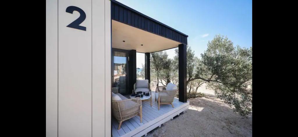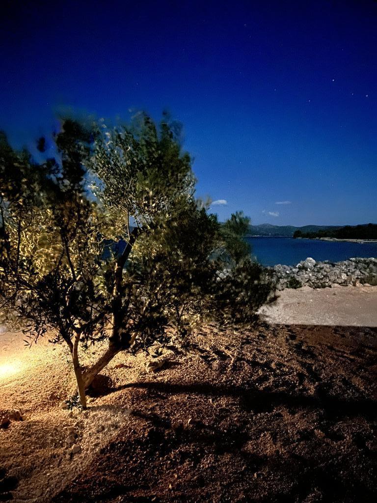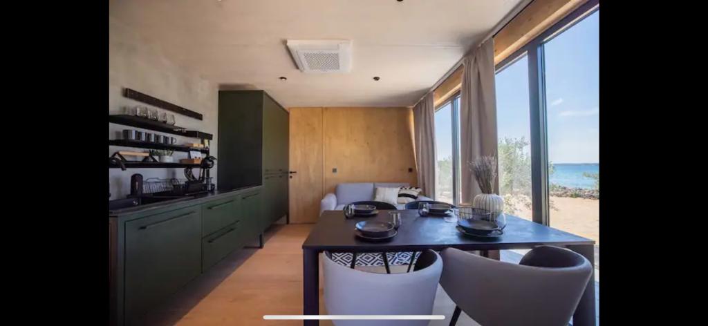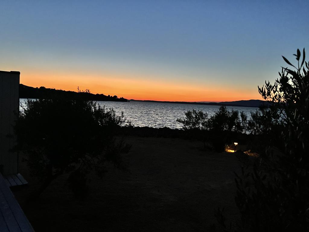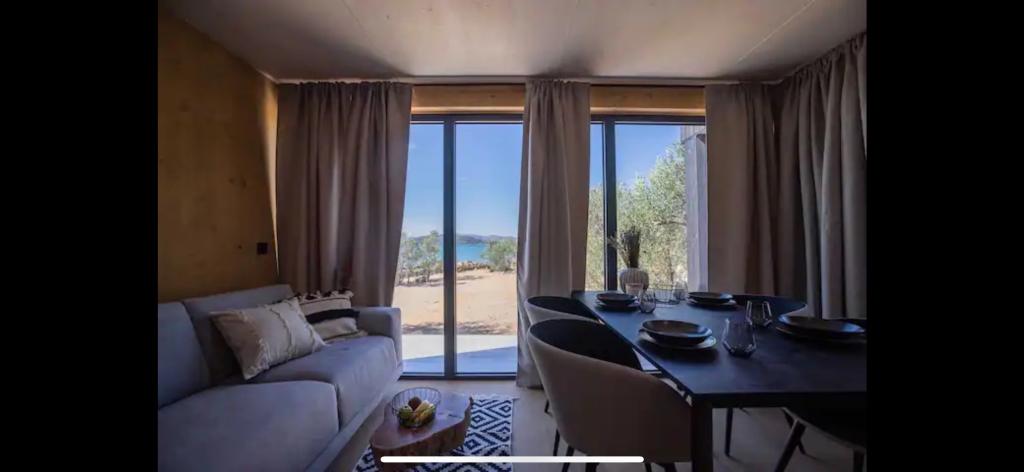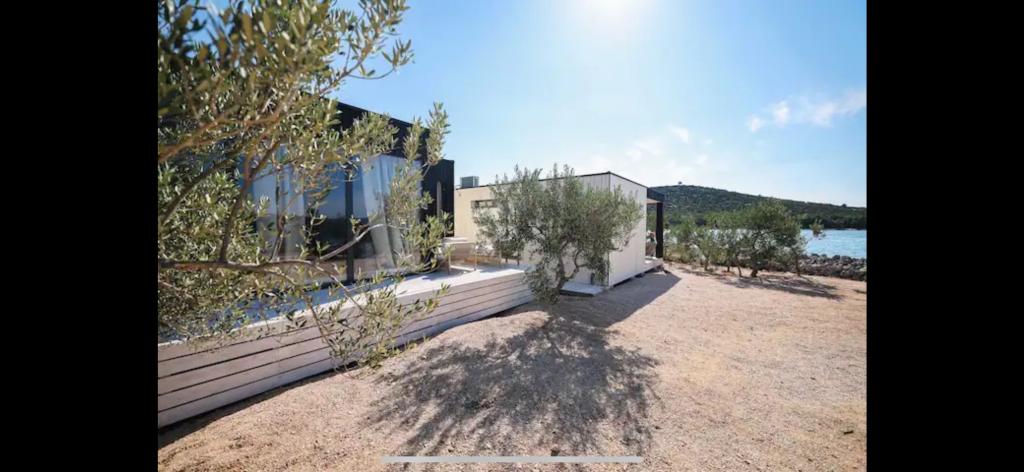 Romantična mobilna kućica smještena je svega nekoliko koraka od mora, okružena maslinama i bijelim kamenčićima, s očaravajućim pogledom na beskrajno plavetnilo. Idealna za parove ili obitelj, pruža spoj moderne udobnosti i dalmatinskog šarma. Uživajte u dvije spavaće sobe, potpuno opremljenoj kuhinji (s perilicom posuđa i zamrzivačem), prostranom blagovaonskom prostoru i terasi s roštiljem. Jutra počinju uz sunce i šum valova, a večeri završavaju pod zvjezdanim nebom, u miru i potpunoj privatnosti. Gostima su na raspolaganju besplatan Wi-Fi i privatni parking. Iako okruženi s nekoliko kućica, ovdje ćete se osjećati kao da ste sami na svijetu – između neba i mora.