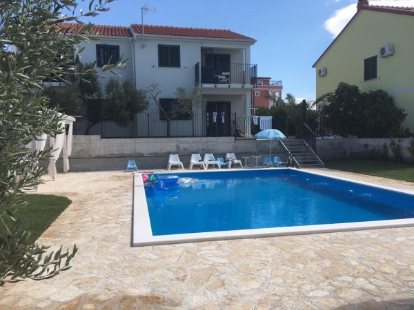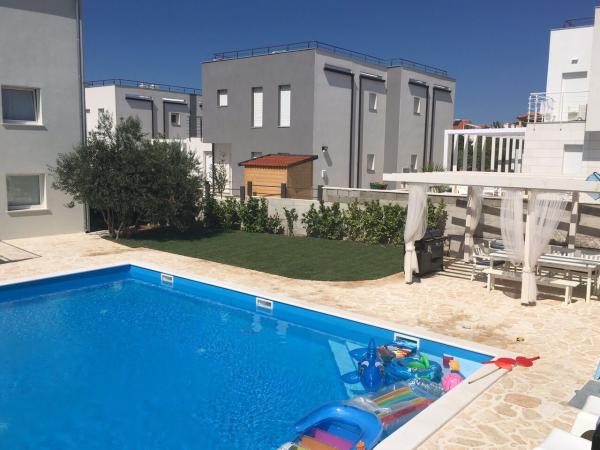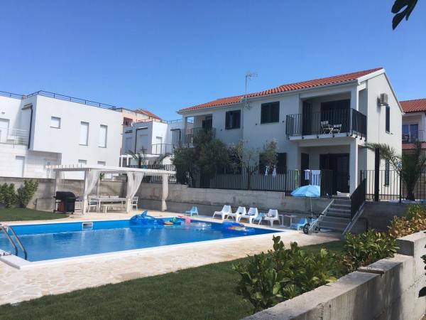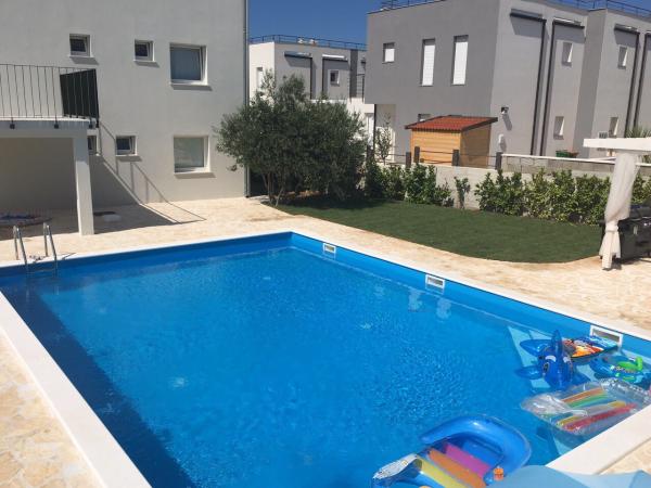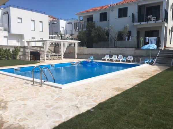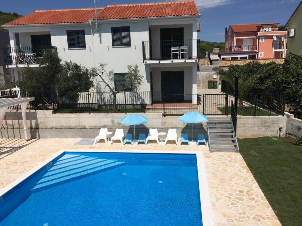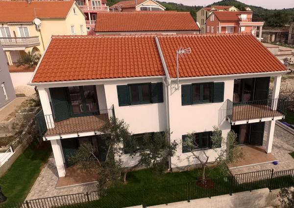 Potpuno opremljeni i moderni novi apartmani u mirnom predjelu Tribunja, nadomak Vodica, idealni za bezbrižan odmor. Apartmani su idealni za dvoje, ali mogu komforno primiti do četvero gostiju. Apartmani su u potpunosti opremljeni sa svime što je potrebno za bezbrižan odmor - od kuhinje, kupaonice, perilice rublja, posuđa, posteljine, ručnika te vanjskog zajedničkog prostora sa bazenom, ležaljkama, roštiljem i vrtnom kuhinjom. Zbog podjele po jedinicama (dvije odvojene jedinice sa po dva apartmana u svakoj), prikladan je za smještaj obitelji ili društva od 8 članova koji mogu boraviti u istoj jedinici sa istim ulazom u dva odvojena stana. Moguć je i najam cijele kuće u koju stane 16 ljudi. Apartmani se nalaze par minuta hoda od centra garad u kojemu su tržnica, dućani, ljekarna, dom zdravlja, kafići, restorani, park i marina te 7 minuta hoda od predivnih Tribunjskih plaža. Područje Tribunja je fantastično zbog svoje lokacije jer se nalazi u neposrednoj blizini Vodica, Šibenika,