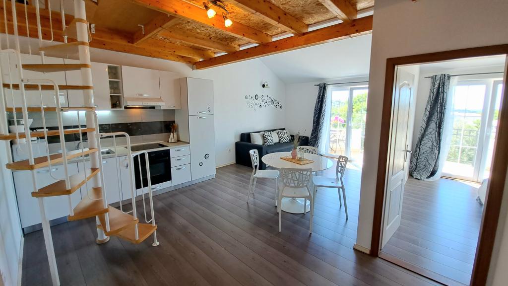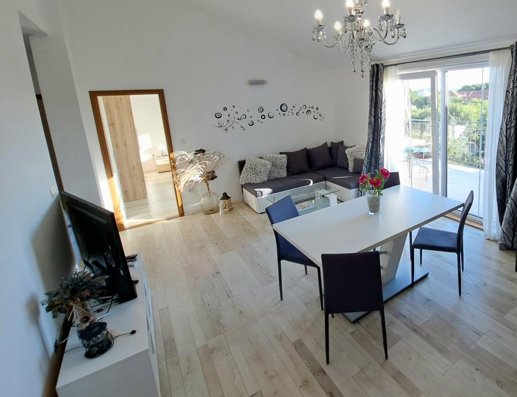 Apartmani „OAZA MIRA“ nalaze se u privatnoj, obiteljskoj kući, 3 apartmana, kapaciteta od 4 do 18 osoba. Okruženi zelenilom i cvijećem, odmor za oči i uši. Ovdje vas uspavljuju i bude ptice. Apartmani koje nudimo veličine su 65 m², dva su dvoetažna ( galerije sa spavaćom sobom cca 20m2. Svi apartmani imaju po dvije spavaće sobe, blagavaonicu, potpuno opremljenu kuhinju u kojoj će te pronaći sve što Vam treba (mikrovalna, toster, pećnica, aparat za kavu, perilica), velike kupaonice. Apartmani su prostrani i klimatizirani. Bespaltni internet (wi fi), tv-sat. Svi apartmani imaju terasu ili balkon sa pogledom na more, vrt i brda. Besplatno privatno parkiralište dostupno je u okviru objekta i nije potrebna rezervacija.