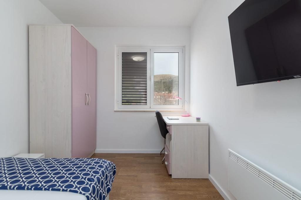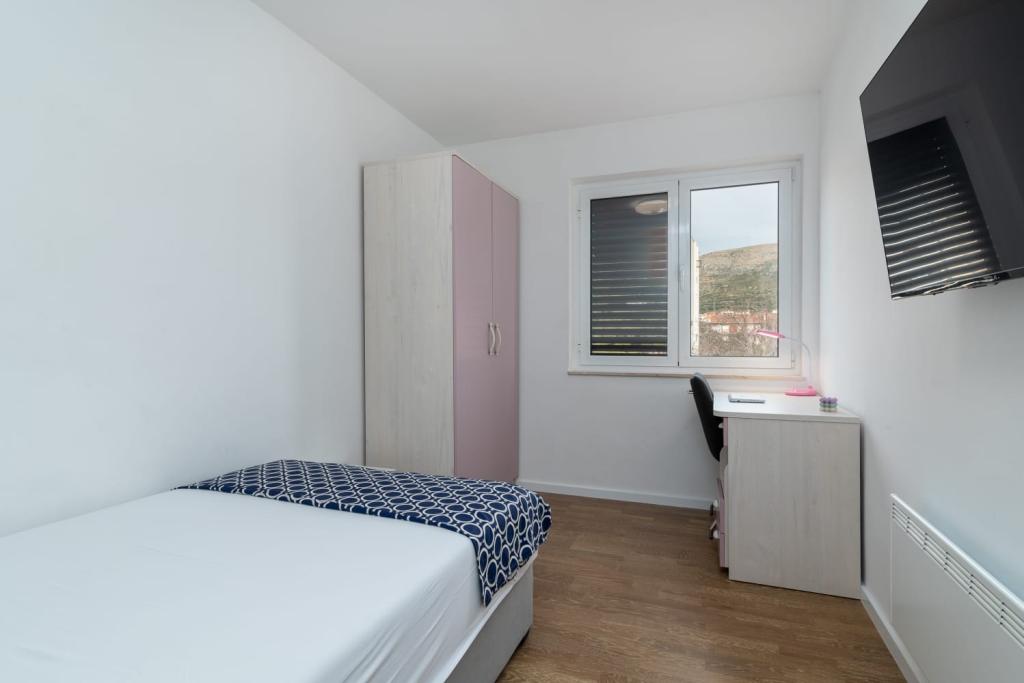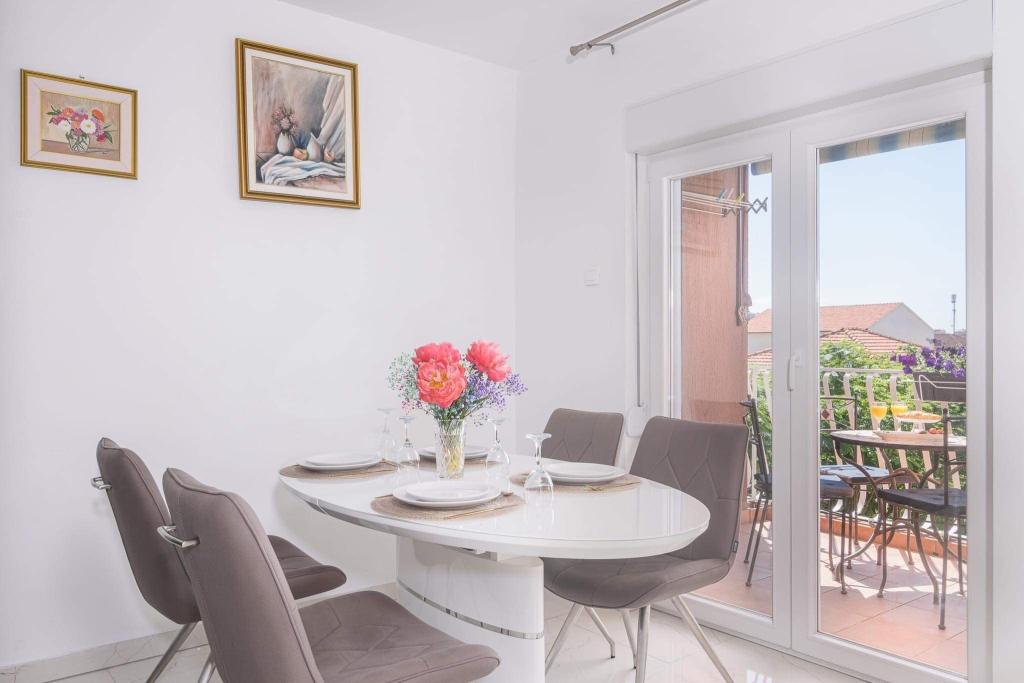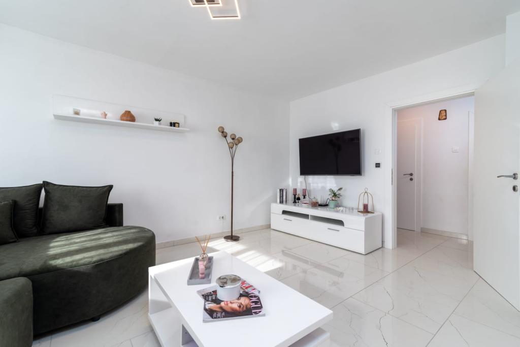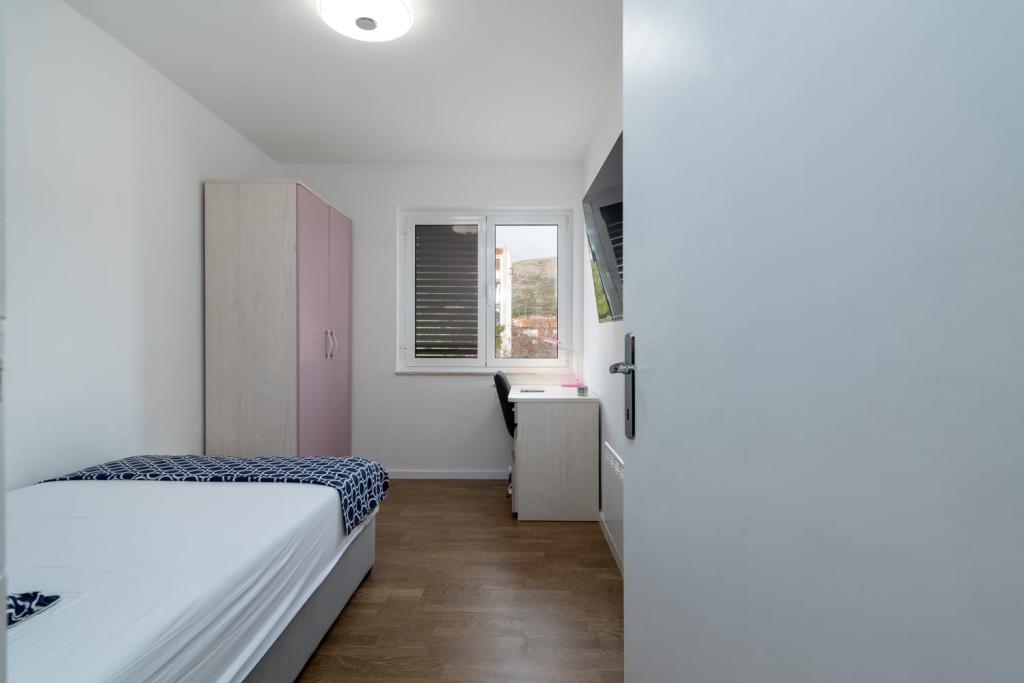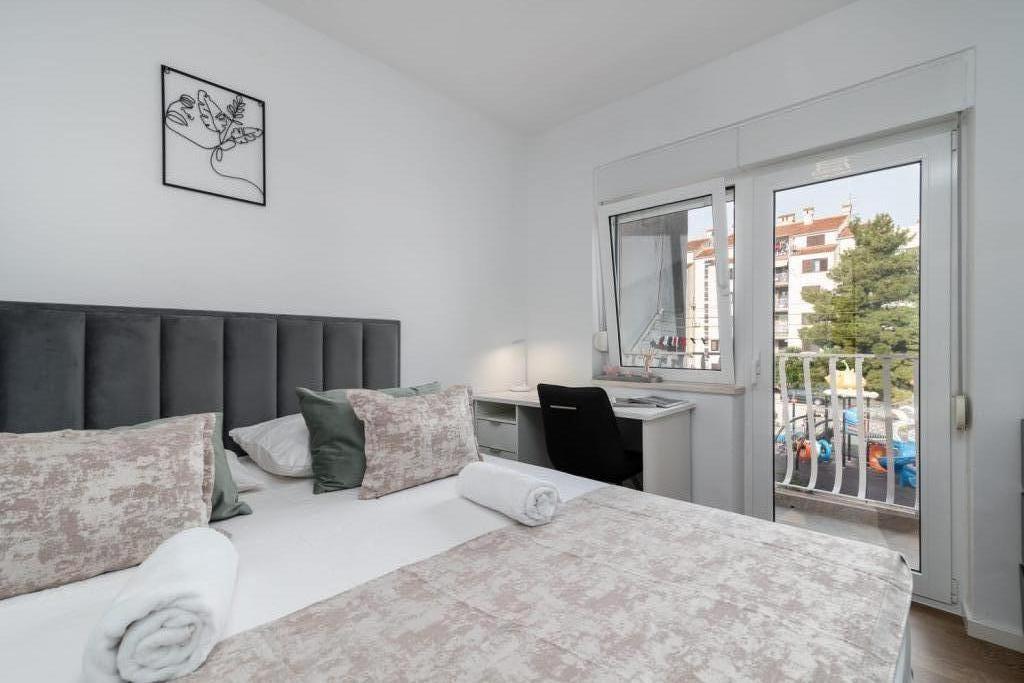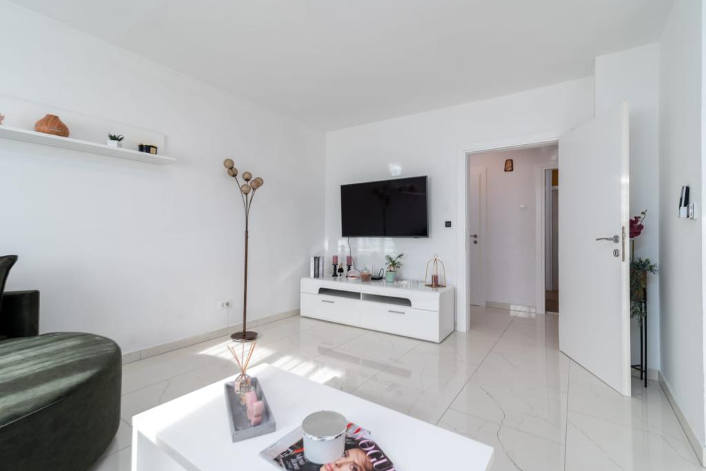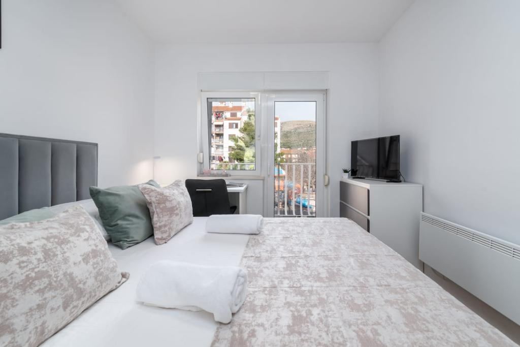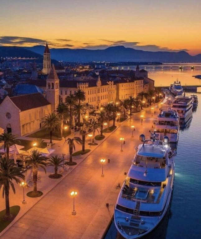 Uživajte u kompletno moderno opremljenom apartmanu, samo 10 minuta hoda od starog grada Trogira. Smješten je u mirnom dijelu grada. Apartman može primiti do 7 osoba. Nalazi se na drugom katu. Sastoji se od 3 spavaće sobe, kupaonice, wc-a, dnevnog boravka, potpuno opremljene kuhinje, dnevnog boravka, te dva balkona. Svaka soba ima televiziju s mogućnošću gledanja Netflix. Posteljina i ručnici su dostupni u apartmanu. Parking je omogućen u garaži centra Marisa koji se nalazi pored apartmana, bez dodatnih plaćanja. Plaže su udaljene 1.3 km od apartmana. Zračna luka Split udaljena je 4.5 km od apartmana. Apartman je opremljen pametnom bravom.