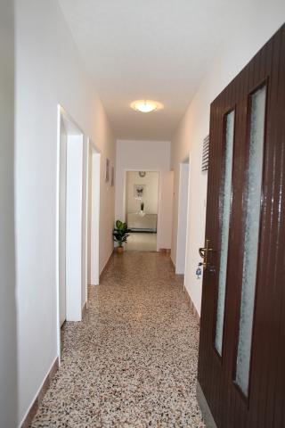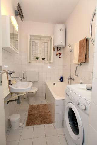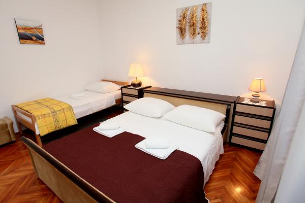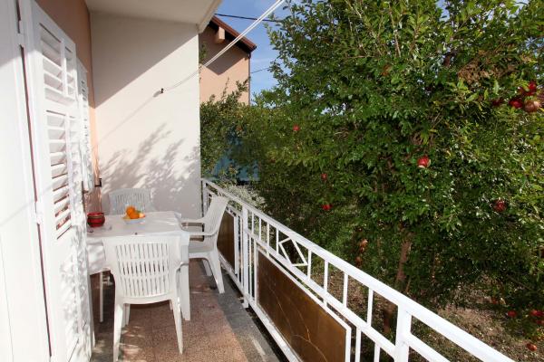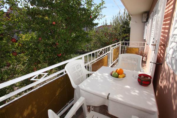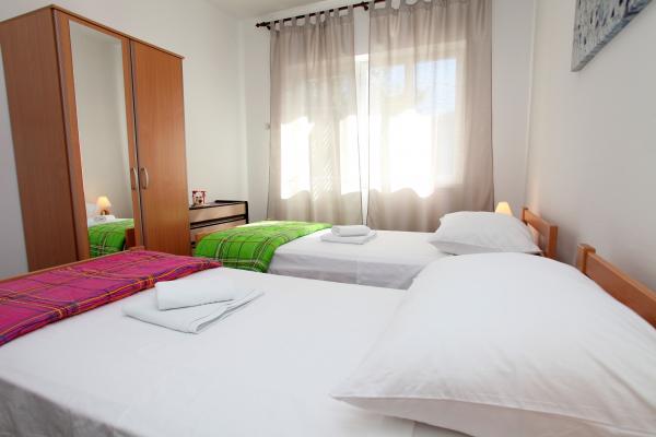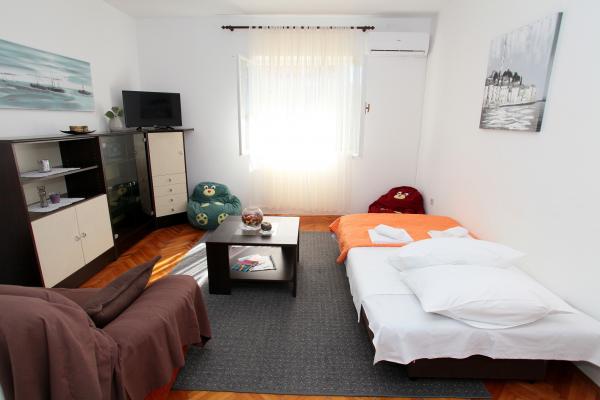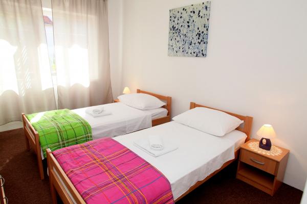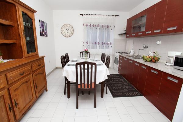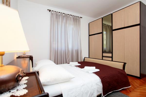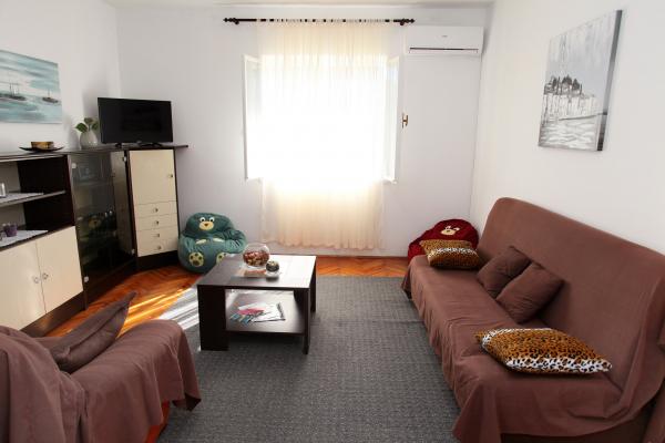 Apartman je površine 80 m2, ugodan i okružen zelenilom, a nalazi se u prizemlju obiteljske kuće nedaleko stare jezgre grada Trogira (oko 10 minuta laganog hoda). Apartman je kompletno opremljen, a sastoji se od dvije spavaće sobe (jedna trokrevetna, a jedna dvokrevetna), kuhinje, dnevnog boravka, kupatila i malog WC-a. U dnevnom boravku se nalazi pomoćni ležaj na razvlačenje za dvije osobe (klik-klak). Apartmanu pripada i balkon sa stolom i stolicama te terasa ispred apartmana sa stolom za ugodan boravak u hladovini. Iza zgrade se nalazi mali roštilj i slobodno mjesto za parking dva automobila. Apartman je klimatiziran. Nova šljunčana gradska plaža udaljena je oko 500 m od apartmana. Najpoznatija trogirska pješčana plaža udaljena je dvije autobusne stanice ili 1 km od apartmana. Sa trogirske rive, svakih 20 minuta, po pristupačnim cijenama, voze taksi brodice do najpoznatijih plaža u okolici Trogira.
