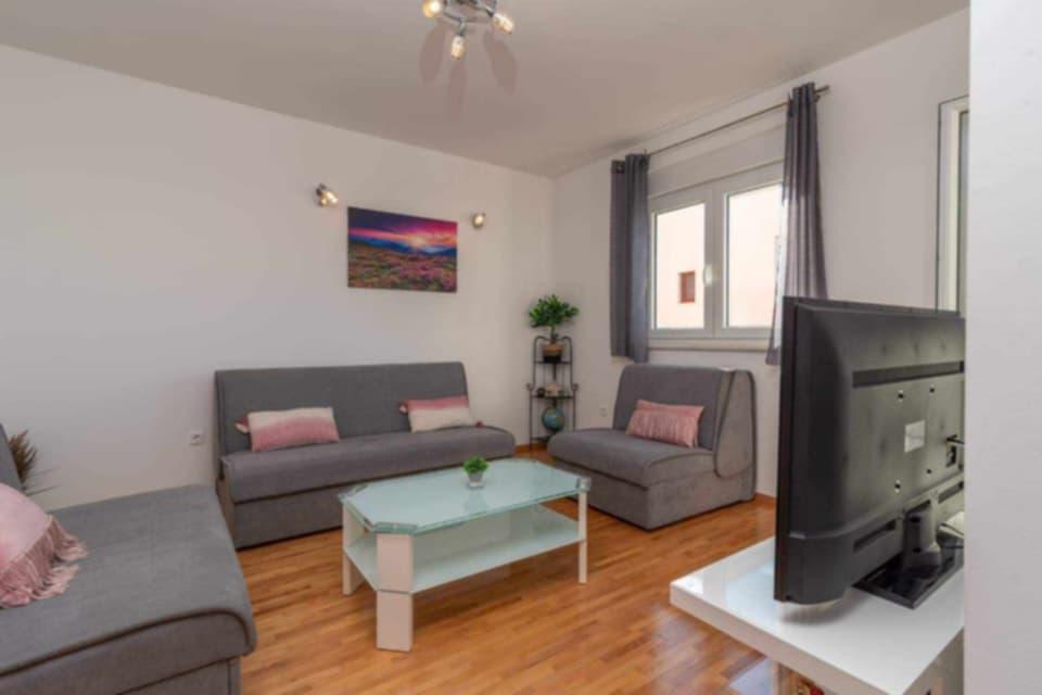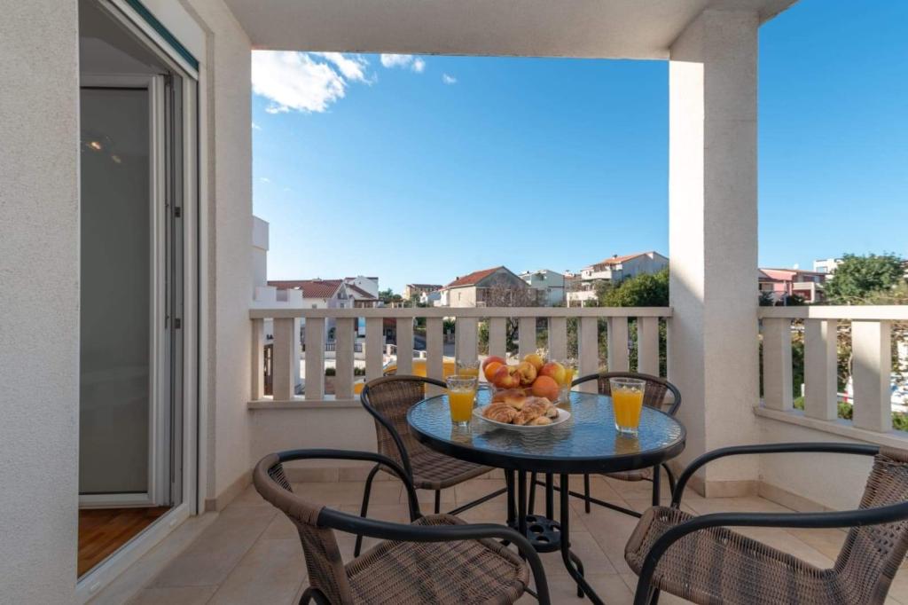 Apartman se nalazi na otoku Čiovu, u mirnoj uvali Okrug Gornji – Rastići, idealnoj za obiteljski odmor. Udaljen je 300 m od stjenovitih plaža i 400 m od šljunčanih plaža, dok je poznata plaža Copacabana udaljena 1,2 km. UNESCO-ov grad Trogir nalazi se samo nekoliko kilometara dalje. Apartman je smješten na prvom katu, površine 74,5 m² i balkonom od 7 m², i može primiti 6 osoba (4+2) a slučaju potrebe postoji mogućnost i za još jedan ležaj, također posjeduje i dječji krevetić koji gosti mogu dobiti na zahtjev. Gosti mogu uživati u klima-uređaju, besplatnom Wi-Fi-ju i privatnom parkirnom mjestu. Posebnost apartmana je soba za zabavu i fitnes koja se nalazi u podrumu objekta i pripada apartmanu te je uključena u cijenu, opremljenia je spravama za vježbanje, Orbitrekom, stolnim nogometom, pikadom i biciklom – idealno za rekreaciju i obiteljsku zabavu.
