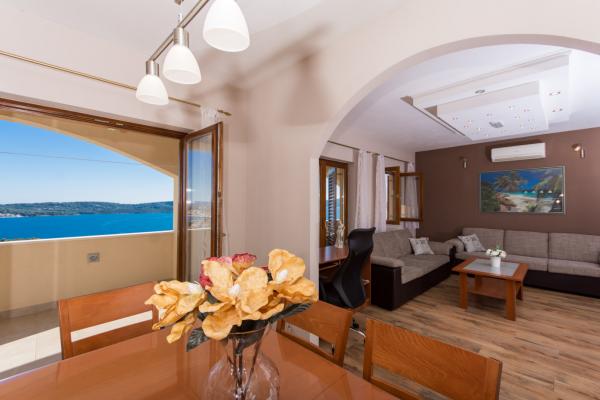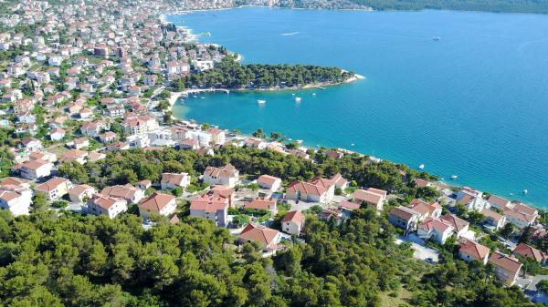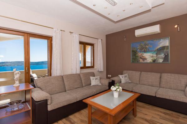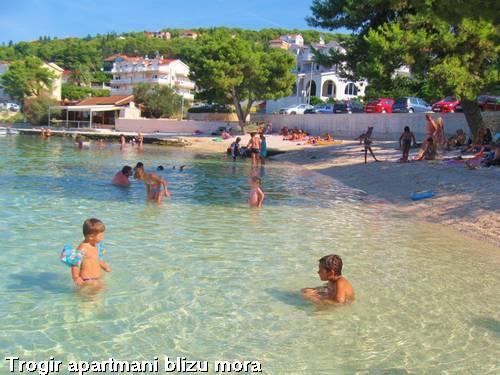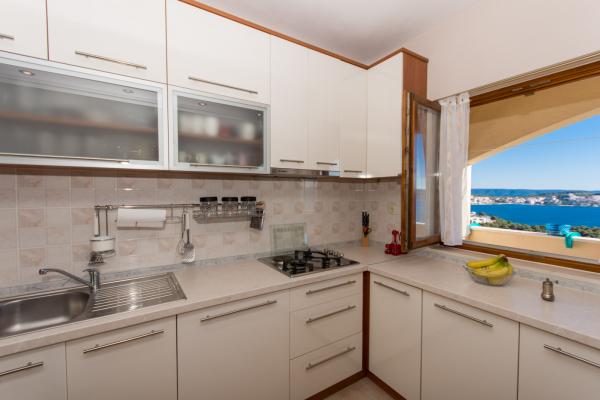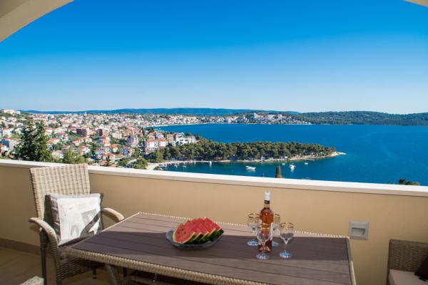 Kompletno i moderno opremljen apartman s 3 dvokrevetne spavaće sobe, veliko kupatilo s kutnom kadom (WC), 1 malo kupatilo s masažnom tuš kabinom (WC), luksuznom kuhinjom s svim kućanskim aparatima i velikim dnevnim boravkom. U mirnom predjelu Trogira, otok Čiovo s mostom, s velikim balkonom s kojeg se vidi prekrasan pogled na more. Super panorama. Objekt se nalazi 15 min hoda do centra i 5 min do plaže. Prostran parking (2 mjesta) samo za goste. Domaćini koji su uvijek na raspolaganju.