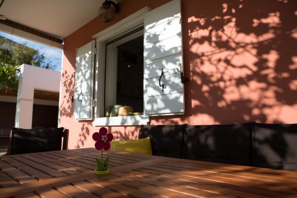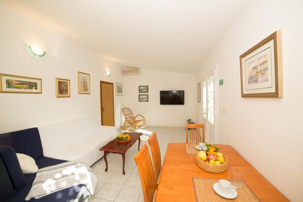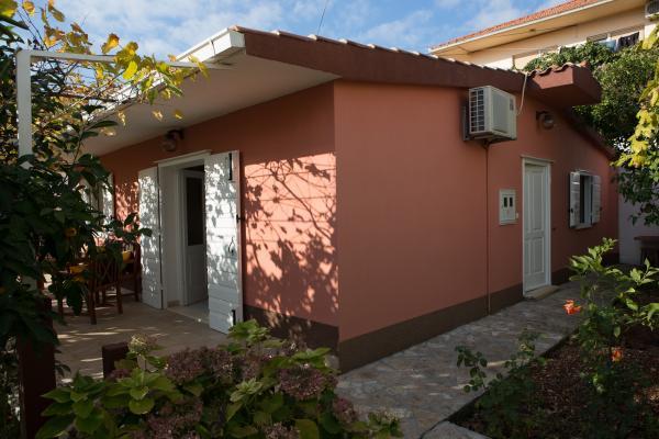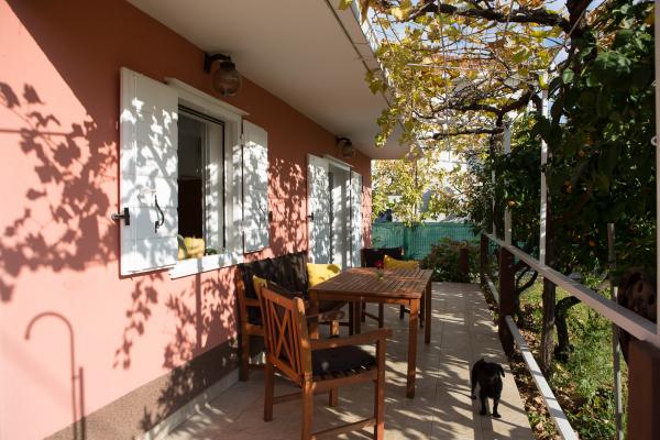 Lijepo opremljena kuća za odmor u mirnom dijelu Trogira udaljena 50 metara od plaže te 10 minuta hoda od centra prekrasnog starog grada Trogira. Na samoj plaži su ugostiteljski objekti opremljeni suncobranima i sadržajem za djecu a ako imate sa sobom mlađu djecu u blizini se nalazi prekrasna pješčana plaža. Objekt ima 2 vlastita parking mjesta. Ispred kuće se nalazi velika terasa natkrivena sa vinovom lozom te ekološki- organski uzgojen povrtnjak iz kojeg se gosti slobodno poslužuju. Vanjski roštilj skriven je u hladu stare naranče a vanjski tuš pomoći će brzom rashlađivanju od ljetnog sunca. Gosti su sami u kući te tako nisu izloženi ometanju od vlasnika ili drugih gostiju. Objektu se može pristupiti automobilom iz dva smjera.