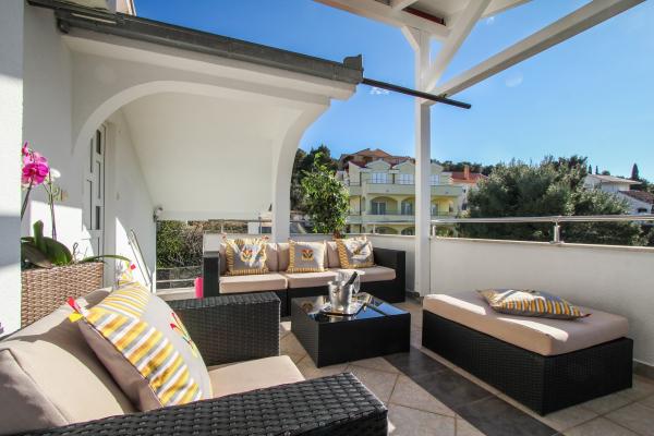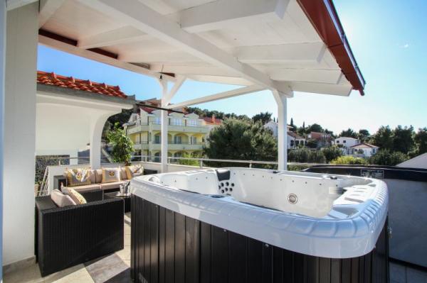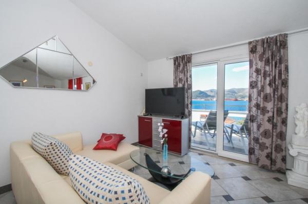 U mirnom djelu Ciova u mjestu Okrug Gornji u našoj villi Silva nudimo vam 7 apartmana za iznajmljivanje: -4 lijepa, jednosobna apartmana A2 2 ili 2 1 sa kuhinjom, kupatilom, dnevni boravak sa kaučom, balkon -2 velika dvosobna apartmana za 4 osobe-Apart br 7 i 8 Apartman br 7 se nalazi na prvom katu, a apartman br 8 se nalazi na vrhu kuće i na terasi ima masažnu kadu / jacuzzi tub/ koja je na raspolaganju samo za goste ovog apartmana -1 apartman za 6 osoba koji se sastoji od 3 spavaće sobe, kuhinja sa dnevnim boravkom, 2 kupatila, terasa sa pogledom na more Svi apartmani imaju terase sa prekrasnim pogledom na more. Ispred kuće su izgrađena dva nova bazena za sve goste ville, zatim tu je veliki parking, dječje igralište i prostor za roštilj U cijeni apartmana je uključeno : -upotreba bazena za sve goste -upotreba ležaljki za bazen -turističke taxe -parking -besplatan WI-FI -ručnici i posteljina su u cijeni - klima