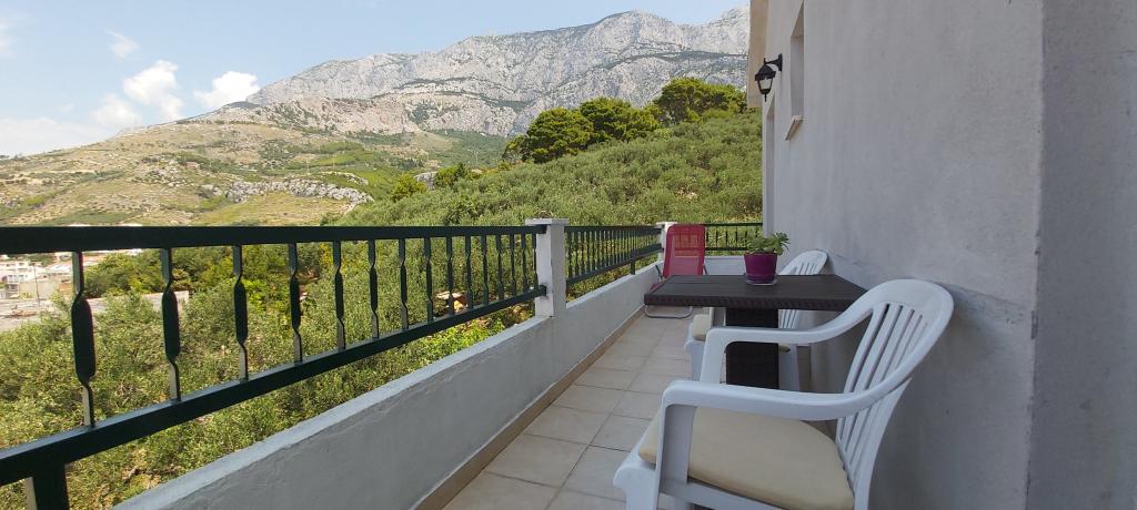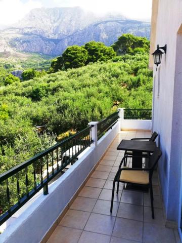 Opremljeni apartmani u mirnom i tihom dijelu Tučepi iznad glavne ceste, dovoljno udaljeno da se ne čuje buka prolazećih automobila. Apartman s pogledom se nalazi na drugom katu, veliki balkon, pogled na more i planinu, čajna kuhinja, soba, toalet, pogodan za parove. Apartman sa dvije spavaće sobe nalazi se u suterenu, bez pogleda na more, dvije klimatizirane sobe, opremljena kuhinja, kupaonica sa kadom, sjedeći vanjski prostor, vrt, ugodan za ljetne vrućine i pogodan za obitelj. Svaki apartman je klimatiziran, te je potrebno koristiti stepenice. Plaža i centar su udaljeni par minuta hoda, besplatani internet i parking su na raspolaganju. Napomena, parking nije pogodan za kombi vozila, kampere te vozila sa prikolicom.