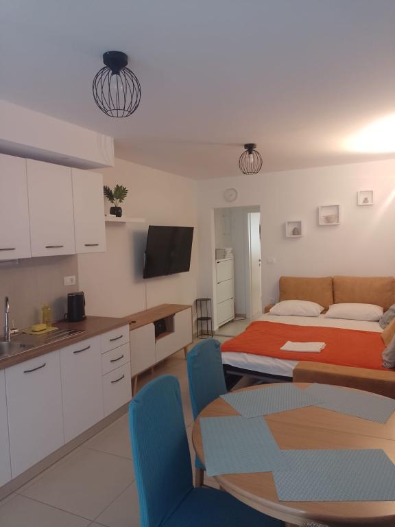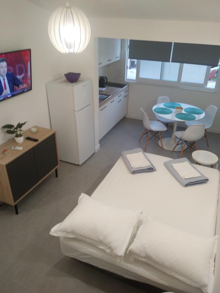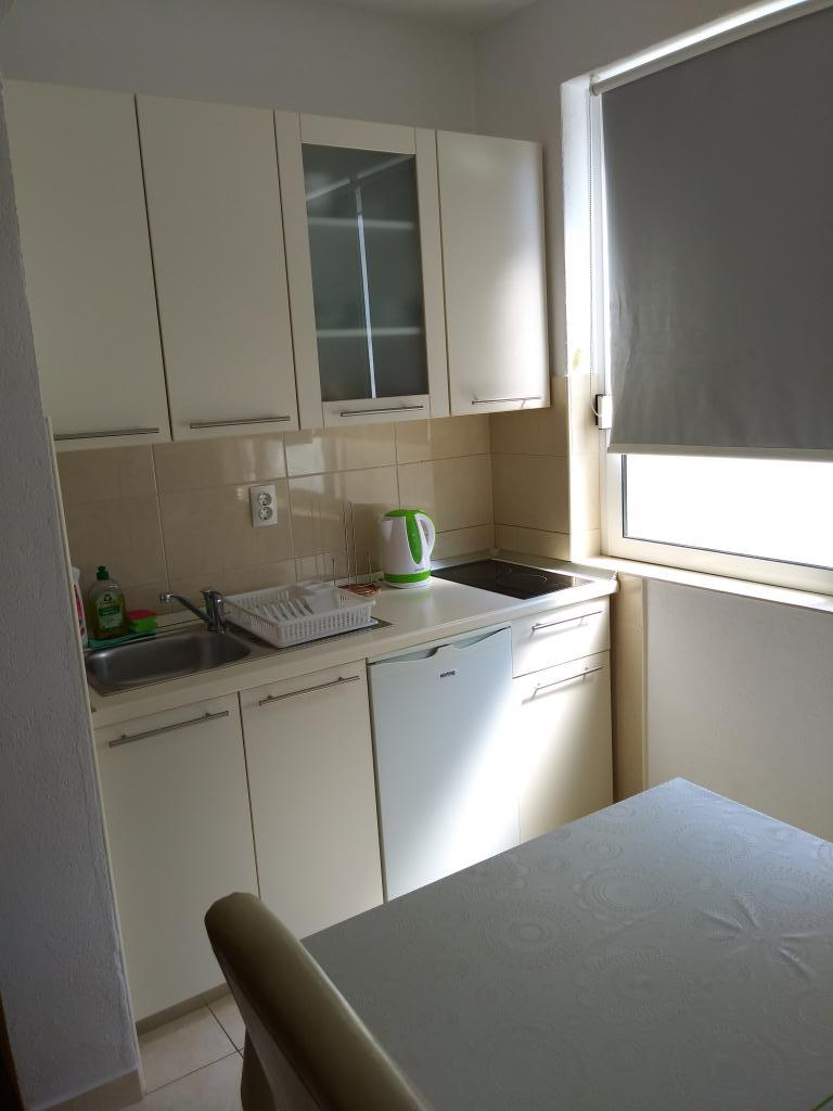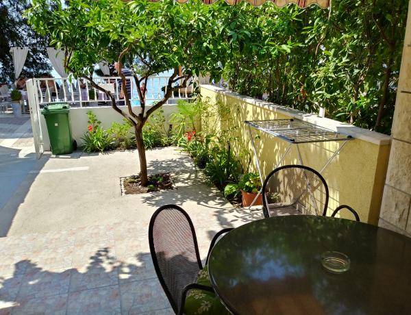 Proveli smo 7 noći u apartmanu na trećem katu. To je lijep, vrlo čist apartman u kojem vam ništa neće nedostajati. Terasa s pogledom na more je super. Na šetalištu ima dobrih restorana, živo je, ali noću možete mirno spavati. Vlasnica apartmana je također super.