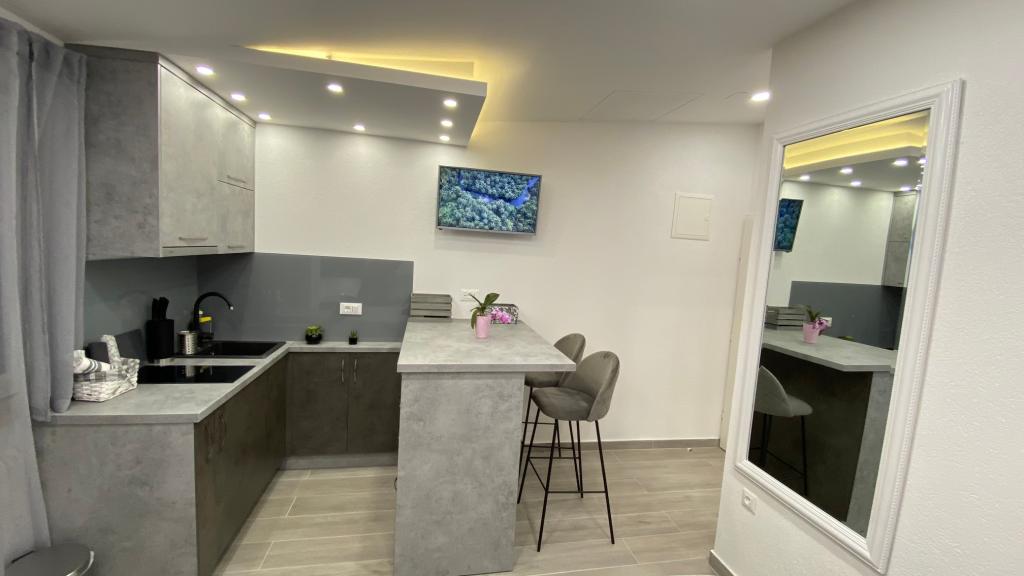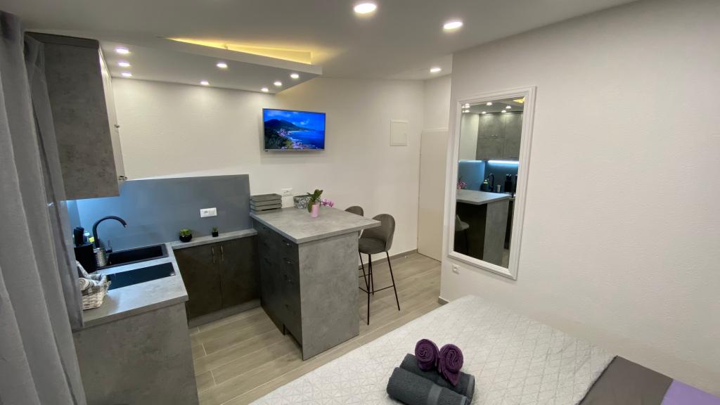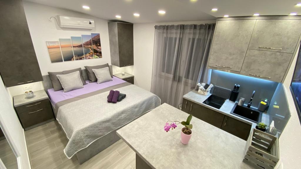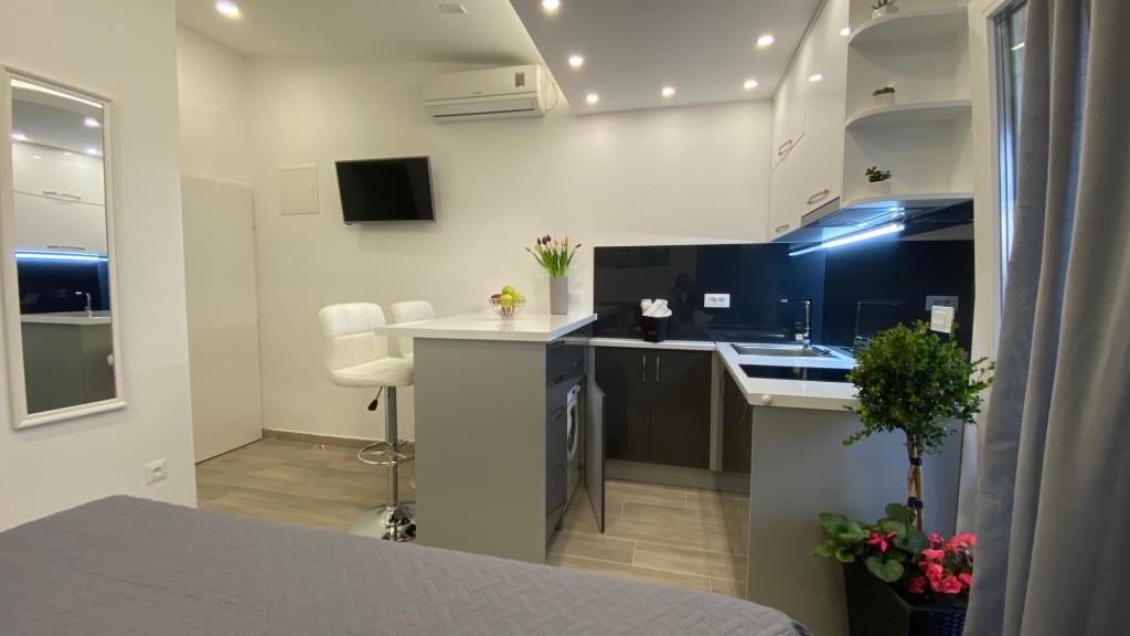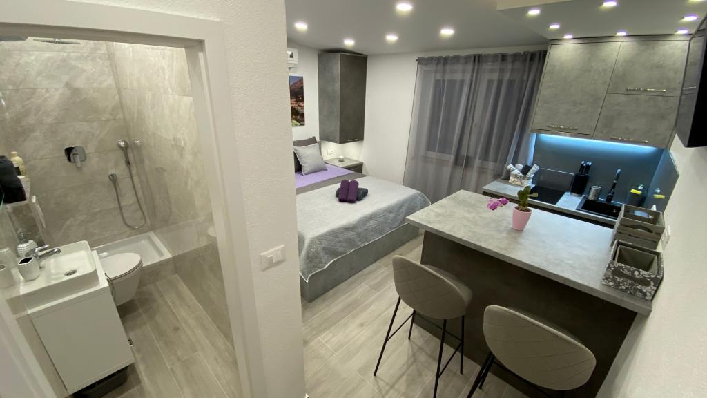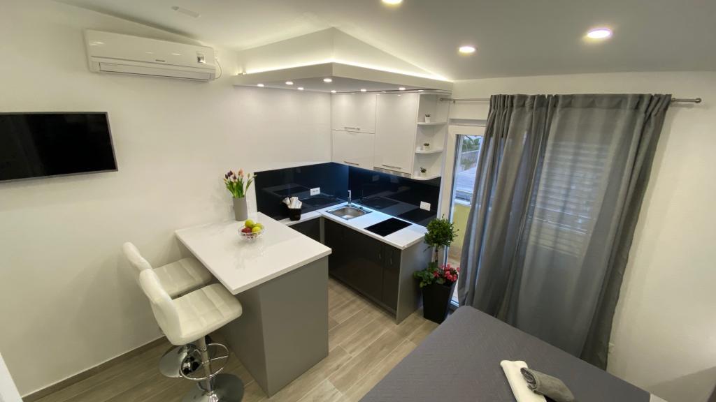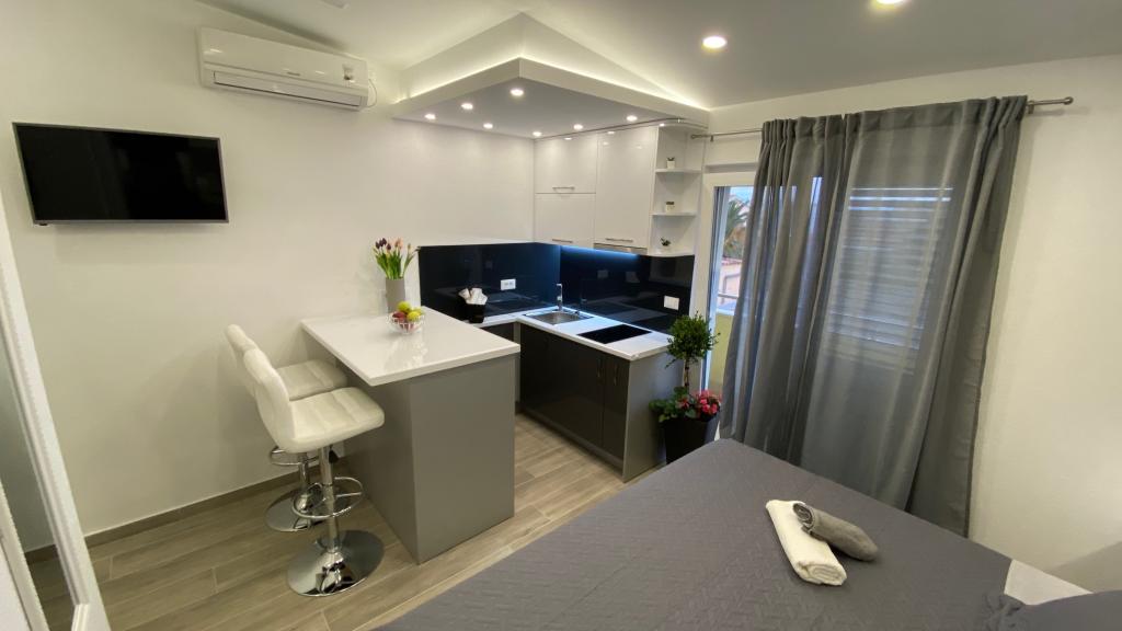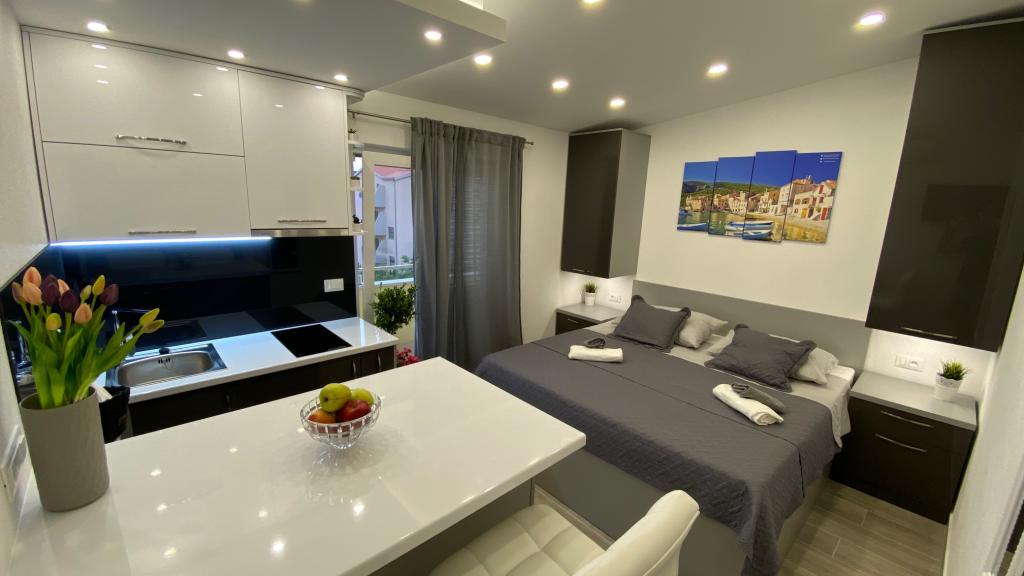 Luksuzno opremljen studio apartman**** za 2 osobe nudi sve što možete očekivati i više od toga. Moderno pokućstvo, kuhinja sa šankom, barske stolice, fantastična led rasvjeta, sva moguća bijela tehnika, smart TV, klima, balkon s pogledom na more i dječje igralište, sve je izuzetno uredno i čisto. Domaćini su fenomenalni ljudi. Vrlo ljubazni, nasmijani, susretljivi. 1. put ste tamo, a imate osjećaj kao da ste došli kod svojih dobrih, starih, prijatelja. A more i plaža... 100 metara od apartmana, kao i centar grada s trgovinama i restoranima. Sve je nadohvat ruke, a opet sam smještaj se nalazi u tišem dijelu kvarta. Nevjerojatna kombinacija ! Apsolutno sve preporuke !!!